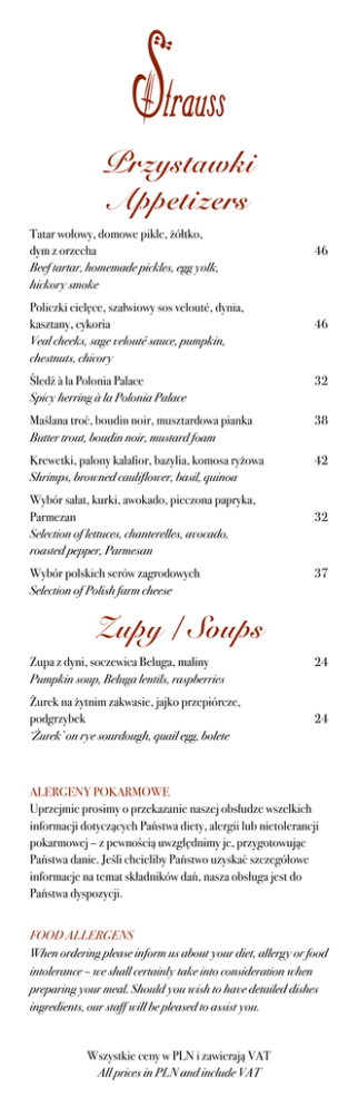 Przystawki Appetizers Tatar wołowy, domowe pikle, żółtko, dym z orzecha Beef tartar, homemade pickles, egg yolk, hickory smoke Policzki cielęce, szałwiowy sos velouté, dynia, kasztany, cykoria Veal cheeks, sage velouté sauce, pumpkin, chestnuts, chicory 46 46 Śledź à la Polonia Palace Spicy herring à la Polonia Palace 32 Maślana troć, boudin noir, musztardowa pianka Butter trout, boudin noir, mustard foam 38 Krewetki, palony kalafior, bazylia, komosa ryżowa Shrimps, browned cauliflower, basil, quinoa 42 Wybór sałat, kurki, awokado, pieczona papryka, Parmezan Selection of lettuces, chanterelles, avocado, roasted pepper, Parmesan Wybór polskich serów zagrodowych Selection of Polish farm cheese 32 37 Zupy / Soups Zupa z dyni, soczewica Beluga, maliny Pumpkin soup, Beluga lentils, raspberries Żurek na żytnim zakwasie, jajko przepiórcze, podgrzybek ‘Żurek’ on rye sourdough, quail egg, bolete 24 24 Alergeny pokarmowe Uprzejmie prosimy o przekazanie naszej obsłudze wszelkich informacji dotyczących Państwa diety, alergii lub nietolerancji pokarmowej – z pewnością uwzględnimy je, przygotowując Państwa danie. Jeśli chcieliby Państwo uzyskać szczegółowe informacje na temat składników dań, nasza obsługa jest do Państwa dyspozycji. Food allergens When ordering please inform us about your diet, allergy or food intolerance – we shall certainly take into consideration when preparing your meal. Should you wish to have detailed dishes ingredients, our staff will be pleased to assist you. Wszystkie ceny w PLN i zawierają VAT All prices in PLN and include VAT Dania główne Main course Gicz jagnięca, purée z szalotek, ziemniaki dauphinoise, miętowy żel 86 Lamb shank, shallots purée, potatoes dauphinoise, mint gel Stek z polędwicy wołowej, demi-glace z trawą żubrową, bakłażan, chrzan, kremowe ziemniaki Beef tenderloin steak, demi-glace with bison grass, eggplant, horseradish, creamy potatoes Sznycel cielęcy, sałatka z warzyw, ziemniaki confit, żurawina Veal schnitzel, vegetable salad, potato confit, cranberry Kaczka wolno pieczona, czerwona kapusta z Porto, jabłko, skorzonera Slow roasted duck, red cabbage with Porto, apple, scorzonera Golonka wieprzowa, sos z czerwonej porzeczki, purée z topinamburu, kiszona rzepa Pork shank, red currant sauce, Jerusalem artichoke purée, pickled turnip Pierogi z cielęciną, dynia, karmelizowane jabłko i borowik ‘Pierogi’ stuffed with veal, caramelized apple and porcini 96 65 59 49 38 Dania rybne Fish dishes Okoń morski, kiszone cytryny, ratatouille, palony kalafior, jarmuż, Sea bass, pickled lemons, ratatouille, browned cauliflower, kale Tuńczyk, sałatka z ziół, borowik, burak, granat Tuna, herb salad, porcini, beet, pomegranate 59 78 Desery / Desserts Crème brûlée z bobem tonka, kutia, lody buraczkowe Crème brûlée with Tonka beans, kutia, beet ice cream Sernik bananowy, marakuja, rabarbar Banana cheesecake, passion fruit, rhubarb 22 22 Fondant z gorzkiej czekolady, śliwkowy crumble, lody z sera koziego 24 Bitter chocolate fondant, plum crumble, goat cheese ice cream Tarta tatin, lody cynamonowe, purée jabłkowe z chrzanem 22 Tatin tart, cinnamon ice cream, apple purée with horseradish Wszystkie ceny w PLN i zawierają VAT All prices in PLN and include VAT