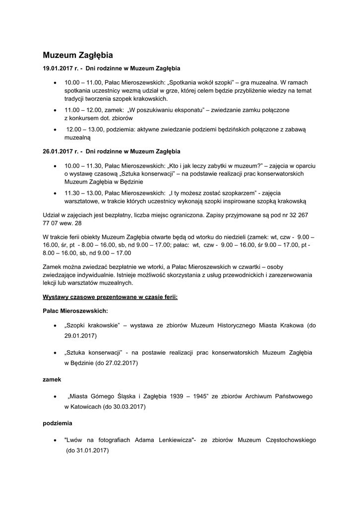Muzeum Zagłębia 19.01.2017 r. - Dni rodzinne w Muzeum Zagłębia 10.00 – 11.00, Pałac Mieroszewskich: „Spotkania wokół szopki” – gra muzealna. W ramach spotkania uczestnicy wezmą udział w grze, której celem będzie przybliżenie wiedzy na temat tradycji tworzenia szopek krakowskich. 11.00 – 12.00, zamek: „W poszukiwaniu eksponatu” – zwiedzanie zamku połączone z konkursem dot. zbiorów 12.00 – 13.00, podziemia: aktywne zwiedzanie podziemi będzińskich połączone z zabawą muzealną 26.01.2017 r. - Dni rodzinne w Muzeum Zagłębia 10.00 – 11.30, Pałac Mieroszewskich: „Kto i jak leczy zabytki w muzeum?” – zajęcia w oparciu o wystawę czasową „Sztuka konserwacji” – na podstawie realizacji prac konserwatorskich Muzeum Zagłębia w Będzinie 11.30 – 13.00, Pałac Mieroszewskich: „I ty możesz zostać szopkarzem” - zajęcia warsztatowe, w trakcie których uczestnicy wykonają szopki inspirowane szopką krakowską Udział w zajęciach jest bezpłatny, liczba miejsc ograniczona. Zapisy przyjmowane są pod nr 32 267 77 07 wew. 28 W trakcie ferii obiekty Muzeum Zagłębia otwarte będą od wtorku do niedzieli (zamek: wt, czw - 9.00 – 16.00, śr, pt - 8.00 – 16.00, sb, nd 9.00 – 17.00; pałac: wt, czw - 9.00 – 16.00, śr 9.00 – 17.00, pt 8.00 – 16.00, sb, nd 9.00 – 17.00 Zamek można zwiedzać bezpłatnie we wtorki, a Pałac Mieroszewskich w czwartki – osoby zwiedzające indywidualnie. Istnieje możliwość skorzystania z usług przewodnickich i zarezerwowania lekcji lub warsztatów muzealnych. Wystawy czasowe prezentowane w czasie ferii: Pałac Mieroszewskich: „Szopki krakowskie” – wystawa ze zbiorów Muzeum Historycznego Miasta Krakowa (do 29.01.2017) „Sztuka konserwacji” - na postawie realizacji prac konserwatorskich Muzeum Zagłębia w Będzinie (do 27.02.2017) zamek „Miasta Górnego Śląska i Zagłębia 1939 – 1945” ze zbiorów Archiwum Państwowego w Katowicach (do 30.03.2017) podziemia "Lwów na fotografiach Adama Lenkiewicza"- ze zbiorów Muzeum Częstochowskiego (do 31.01.2017)