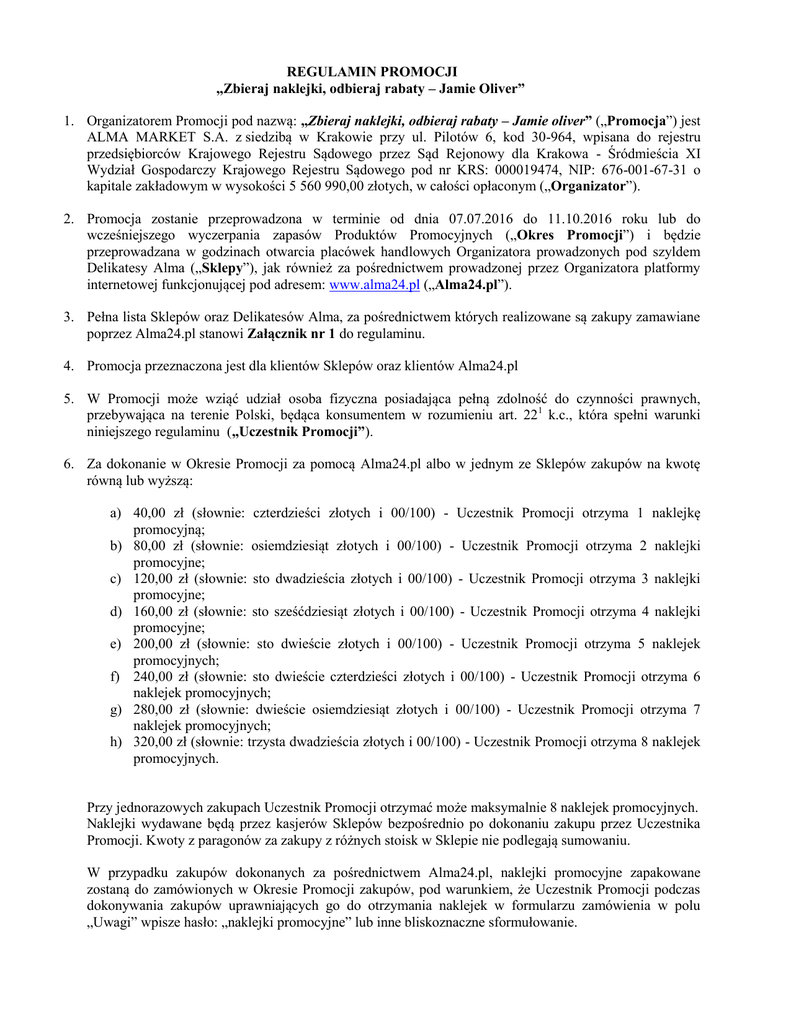 REGULAMIN PROMOCJI „Zbieraj naklejki, odbieraj rabaty – Jamie Oliver” 1. Organizatorem Promocji pod nazwą: „Zbieraj naklejki, odbieraj rabaty – Jamie oliver” („Promocja”) jest ALMA MARKET S.A. z siedzibą w Krakowie przy ul. Pilotów 6, kod 30-964, wpisana do rejestru przedsiębiorców Krajowego Rejestru Sądowego przez Sąd Rejonowy dla Krakowa - Śródmieścia XI Wydział Gospodarczy Krajowego Rejestru Sądowego pod nr KRS: 000019474, NIP: 676-001-67-31 o kapitale zakładowym w wysokości 5 560 990,00 złotych, w całości opłaconym („Organizator”). 2. Promocja zostanie przeprowadzona w terminie od dnia 07.07.2016 do 11.10.2016 roku lub do wcześniejszego wyczerpania zapasów Produktów Promocyjnych („Okres Promocji”) i będzie przeprowadzana w godzinach otwarcia placówek handlowych Organizatora prowadzonych pod szyldem Delikatesy Alma („Sklepy”), jak również za pośrednictwem prowadzonej przez Organizatora platformy internetowej funkcjonującej pod adresem: www.alma24.pl („Alma24.pl”). 3. Pełna lista Sklepów oraz Delikatesów Alma, za pośrednictwem których realizowane są zakupy zamawiane poprzez Alma24.pl stanowi Załącznik nr 1 do regulaminu. 4. Promocja przeznaczona jest dla klientów Sklepów oraz klientów Alma24.pl 5. W Promocji może wziąć udział osoba fizyczna posiadająca pełną zdolność do czynności prawnych, przebywająca na terenie Polski, będąca konsumentem w rozumieniu art. 221 k.c., która spełni warunki niniejszego regulaminu („Uczestnik Promocji”). 6. Za dokonanie w Okresie Promocji za pomocą Alma24.pl albo w jednym ze Sklepów zakupów na kwotę równą lub wyższą: a) 40,00 zł (słownie: czterdzieści złotych i 00/100) - Uczestnik Promocji otrzyma 1 naklejkę promocyjną; b) 80,00 zł (słownie: osiemdziesiąt złotych i 00/100) - Uczestnik Promocji otrzyma 2 naklejki promocyjne; c) 120,00 zł (słownie: sto dwadzieścia złotych i 00/100) - Uczestnik Promocji otrzyma 3 naklejki promocyjne; d) 160,00 zł (słownie: sto sześćdziesiąt złotych i 00/100) - Uczestnik Promocji otrzyma 4 naklejki promocyjne; e) 200,00 zł (słownie: sto dwieście złotych i 00/100) - Uczestnik Promocji otrzyma 5 naklejek promocyjnych; f) 240,00 zł (słownie: sto dwieście czterdzieści złotych i 00/100) - Uczestnik Promocji otrzyma 6 naklejek promocyjnych; g) 280,00 zł (słownie: dwieście osiemdziesiąt złotych i 00/100) - Uczestnik Promocji otrzyma 7 naklejek promocyjnych; h) 320,00 zł (słownie: trzysta dwadzieścia złotych i 00/100) - Uczestnik Promocji otrzyma 8 naklejek promocyjnych. Przy jednorazowych zakupach Uczestnik Promocji otrzymać może maksymalnie 8 naklejek promocyjnych. Naklejki wydawane będą przez kasjerów Sklepów bezpośrednio po dokonaniu zakupu przez Uczestnika Promocji. Kwoty z paragonów za zakupy z różnych stoisk w Sklepie nie podlegają sumowaniu. W przypadku zakupów dokonanych za pośrednictwem Alma24.pl, naklejki promocyjne zapakowane zostaną do zamówionych w Okresie Promocji zakupów, pod warunkiem, że Uczestnik Promocji podczas dokonywania zakupów uprawniających go do otrzymania naklejek w formularzu zamówienia w polu „Uwagi” wpisze hasło: „naklejki promocyjne” lub inne bliskoznaczne sformułowanie. 7. W ramach Promocji, Uczestnik Promocji będzie uprawniony do zakupu w Sklepach oraz za pośrednictwem Alma24.pl jednego z rodzajów produktów marki Jamie Oliver, których lista stanowi Załącznik nr 2 do regulaminu („Produkty Promocyjne”), z rabatem do 50% ich ceny regularnej („Rabat”), pod warunkiem zgromadzenia w książeczce rabatowej, której wzór stanowi Załącznik nr 3 do regulaminu („Książeczka Rabatowa”), wymaganej liczby naklejek promocyjnych, tj.: a) w przypadku zgromadzenia 3 (trzech) naklejek promocyjnych Uczestnik Promocji będzie uprawniony do zakupu z Rabatem Talerza deserowego 12 cm lub talerza głębokiego 23 cm lub talerza płytkiego 27 cm lub kubka lub 2 misek 18 cm lub miski 16 cm lub półmiska dużego owalnego. Ceny poszczególnych Produktów Promocyjnych z Rabatem zawiera Załącznik nr 2 do regulaminu. 8. Książeczki Rabatowe będą dostępne w Okresie Promocji u kasjerów Sklepów oraz na stoiskach z ekspozycją Produktów Promocyjnych. Uczestnik Promocji może również otrzymać Książeczkę Rabatową za pośrednictwem kuriera Alma24.pl, jeśli podczas dokonywania zakupów w formularzu zamówienia w polu „Uwagi” wpisze hasło: „książeczka na naklejki” lub inne bliskoznaczne sformułowanie. 9. Rabat od ceny regularnej Produktu Promocyjnego w wysokości zgodnej z Załącznikiem nr 2 do regulaminu, w przypadku zakupu Produktu Promocyjnego za pośrednictwem Alma24.pl, naliczany będzie pod warunkiem przekazania kurierowi Alma24.pl Książeczki Rabatowej z wymaganą ilością naklejek. Zakup Produktu Promocyjnego jest również możliwy w Sklepach – wówczas rabat będzie udzielany bezpośrednio przy kasie Sklepu po przekazaniu kasjerowi Sklepu Książeczki Rabatowej zawierającej wymaganą liczbę naklejek promocyjnych. Wykorzystana Książeczka Rabatowa pozostaje u kasjera Sklepu/ kuriera Alma24.pl. Liczba Produktów Promocyjnych jest ograniczona. Dokładna liczba każdego z Produktów Promocyjnych dostępnych w ramach Promocji została wskazana w Załączniku nr 2 do Regulaminu. Uczestnik Promocji posiadający określoną w pkt. 7 powyżej liczbę naklejek promocyjnych w Książeczce Rabatowej będzie miał możliwość dokonania zakupu Produktów Promocyjnych w jednym ze Sklepów lub za pośrednictwem Alma24.pl do 11.10.2016 roku, o ile Produkty Promocyjne będą w tym okresie dostępne w Sklepie/ Alma 24.pl. 10. W Promocji Uczestnik Promocji może brać udział wielokrotnie, każdorazowo spełniając warunki Promocji. Produkty Promocyjne nie podlegają wymianie na ekwiwalent pieniężny. Nie jest również możliwa wymiana Produktów Promocyjnych na inne produkty, ani też zastrzeżenie przez Uczestnika Promocji sz