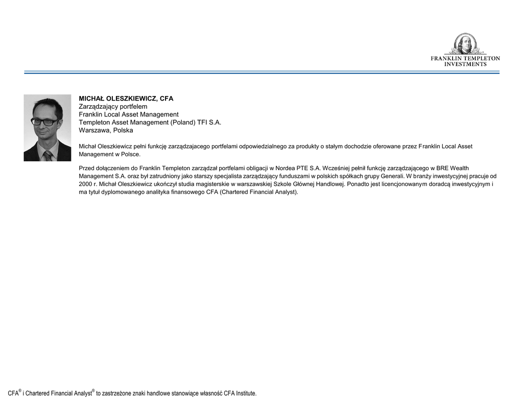 MICHAŁ OLESZKIEWICZ, CFA Zarządzający portfelem Franklin Local Asset Management Templeton Asset Management (Poland) TFI S.A. Warszawa, Polska Michał Oleszkiewicz pełni funkcję zarządzajacego portfelami odpowiedzialnego za produkty o stałym dochodzie oferowane przez Franklin Local Asset Management w Polsce. Przed dołączeniem do Franklin Templeton zarządzał portfelami obligacji w Nordea PTE S.A. Wcześniej pełnił funkcję zarządzającego w BRE Wealth Management S.A. oraz był zatrudniony jako starszy specjalista zarządzający funduszami w polskich spółkach grupy Generali. W branży inwestycyjnej pracuje od 2000 r. Michał Oleszkiewicz ukończył studia magisterskie w warszawskiej Szkole Głównej Handlowej. Ponadto jest licencjonowanym doradcą inwestycyjnym i ma tytuł dyplomowanego analityka finansowego CFA (Chartered Financial Analyst). ® ® CFA i Chartered Financial Analyst to zastrzeżone znaki handlowe stanowiące własność CFA Institute.