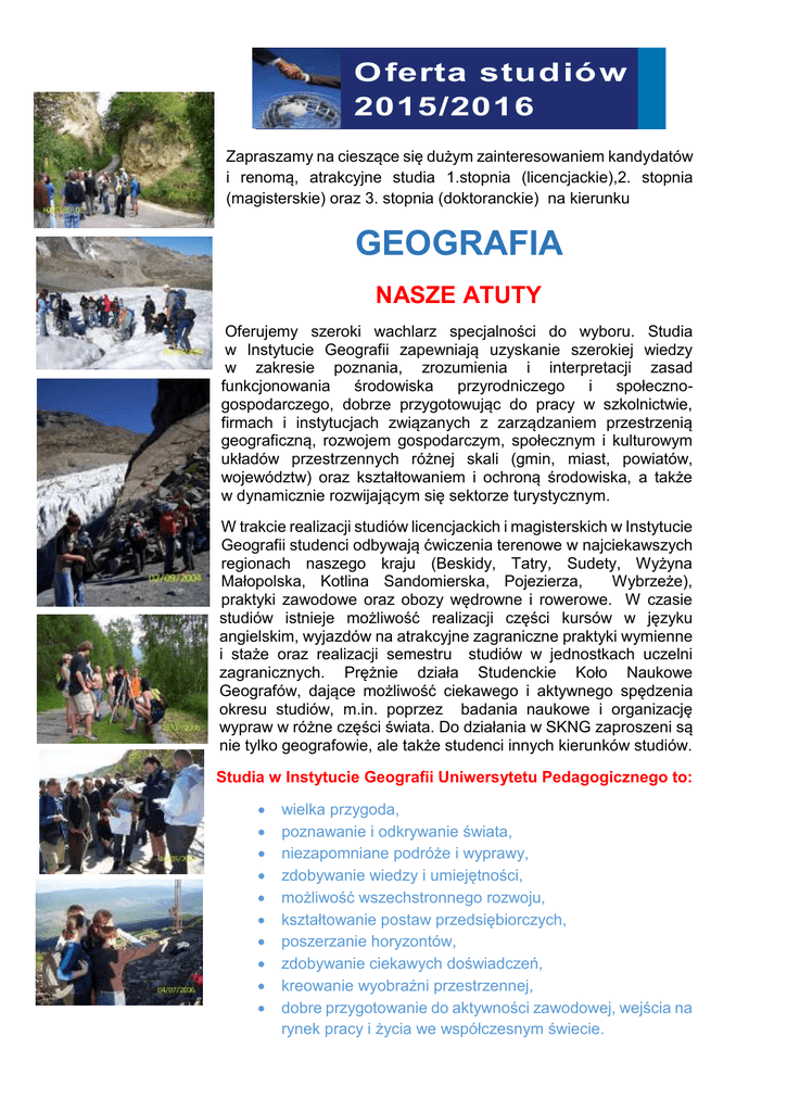 O ferta stu d ió w 2015/2016 Zapraszamy na cieszące się dużym zainteresowaniem kandydatów i renomą, atrakcyjne studia 1.stopnia (licencjackie),2. stopnia (magisterskie) oraz 3. stopnia (doktoranckie) na kierunku GEOGRAFIA NASZE ATUTY Oferujemy szeroki wachlarz specjalności do wyboru. Studia w Instytucie Geografii zapewniają uzyskanie szerokiej wiedzy w zakresie poznania, zrozumienia i interpretacji zasad funkcjonowania środowiska przyrodniczego i społecznogospodarczego, dobrze przygotowując do pracy w szkolnictwie, firmach i instytucjach związanych z zarządzaniem przestrzenią geograficzną, rozwojem gospodarczym, społecznym i kulturowym układów przestrzennych różnej skali (gmin, miast, powiatów, województw) oraz kształtowaniem i ochroną środowiska, a także w dynamicznie rozwijającym się sektorze turystycznym. W trakcie realizacji studiów licencjackich i magisterskich w Instytucie Geografii studenci odbywają ćwiczenia terenowe w najciekawszych regionach naszego kraju (Beskidy, Tatry, Sudety, Wyżyna Małopolska, Kotlina Sandomierska, Pojezierza, Wybrzeże), praktyki zawodowe oraz obozy wędrowne i rowerowe. W czasie studiów istnieje możliwość realizacji części kursów w języku angielskim, wyjazdów na atrakcyjne zagraniczne praktyki wymienne i staże oraz realizacji semestru studiów w jednostkach uczelni zagranicznych. Prężnie działa Studenckie Koło Naukowe Geografów, dające możliwość ciekawego i aktywnego spędzenia okresu studiów, m.in. poprzez badania naukowe i organizację wypraw w różne części świata. Do działania w SKNG zaproszeni są nie tylko geografowie, ale także studenci innych kierunków studiów. Studia w Instytucie Geografii Uniwersytetu Pedagogicznego to: wielka przygoda, poznawanie i odkrywanie świata, niezapomniane podróże i wyprawy, zdobywanie wiedzy i umiejętności, możliwość wszechstronnego rozwoju, kształtowanie postaw przedsiębiorczych, poszerzanie horyzontów, zdobywanie ciekawych doświadczeń, kreowanie wyobraźni przestrzennej, dobre przygotowanie do aktywności zawodowej, wejścia na rynek pracy i życia we współczesnym świecie.