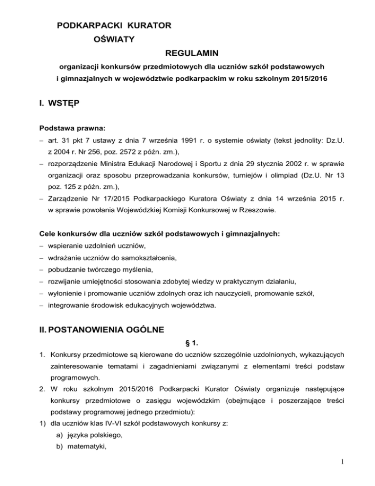 PODKARPACKI KURATOR OŚWIATY REGULAMIN organizacji konkursów przedmiotowych dla uczniów szkół podstawowych i gimnazjalnych w województwie podkarpackim w roku szkolnym 2015/2016 I. WSTĘP Podstawa prawna: − art. 31 pkt 7 ustawy z dnia 7 września 1991 r. o systemie oświaty (tekst jednolity: Dz.U. z 2004 r. Nr 256, poz. 2572 z późn. zm.), − rozporządzenie Ministra Edukacji Narodowej i Sportu z dnia 29 stycznia 2002 r. w sprawie organizacji oraz sposobu przeprowadzania konkursów, turniejów i olimpiad (Dz.U. Nr 13 poz. 125 z późn. zm.), − Zarządzenie Nr 17/2015 Podkarpackiego Kuratora Oświaty z dnia 14 września 2015 r. w sprawie powołania Wojewódzkiej Komisji Konkursowej w Rzeszowie. Cele konkursów dla uczniów szkół podstawowych i gimnazjalnych: − wspieranie uzdolnień uczniów, − wdrażanie uczniów do samokształcenia, − pobudzanie twórczego myślenia, − rozwijanie umiejętności stosowania zdobytej wiedzy w praktycznym działaniu, − wyłonienie i promowanie uczniów zdolnych oraz ich nauczycieli, promowanie szkół, − integrowanie środowisk edukacyjnych województwa. II. POSTANOWIENIA OGÓLNE § 1. 1. Konkursy przedmiotowe są kierowane do uczniów szczególnie uzdolnionych, wykazujących zainteresowanie tematami i zagadnieniami związanymi z elementami treści podstaw programowych. 2. W roku szkolnym 2015/2016 Podkarpacki Kurator Oświaty organizuje następujące konkursy przedmiotowe o zasięgu wojewódzkim (obejmujące i poszerzające treści podstawy programowej jednego przedmiotu): 1) dla uczniów klas IV-VI szkół podstawowych konkursy z: a) języka polskiego, b) matematyki, 1 c) historii, d) przyrody, e) języka angielskiego, f) języka niemieckiego, 2) dla uczniów gimnazjów konkursy przedmiotowe: a) polonistyczny, b) historyczny, c) chemiczny, d) biologiczny, e) geograficzny, f) matematyczny, g) fizyczny, h) języka angielskiego, i) języka ukraińskiego, j) języka niemieckiego, k) języka francuskiego. 3. Konkursy przygotowuje i przeprowadza Wojewódzka Komisja Konkursowa powołana przez Podkarpackiego Kuratora Oświaty. 4. Wojewódzka Komisja Konkursowa sprawuje nadzór nad prawidłowym przebiegiem konkursu na wszystkich etapach i w tym zakresie podejmuje wiążące rozstrzygnięcia. § 2. 1. Konkursy organizowane są w formie trzystopniowych zawodów: 1) I stopień – etap szkolny, 2) II stopień – etap rejonowy, 3) III stopień – etap wojewódzki. 2. Kolejne etapy konkursu przeprowadzane są w następujących terminach: 1) etap szkolny – do 30 listopada 2015 r. 2) etap rejonowy – do 18 stycznia 2016 r. 3) etap wojewódzki - do 19 marca 2016 r. 3. Terminy przeprowadzenia eliminacji konkursów dla uczniów szkół podstawowych i gimnazjów przedstawia Załącznik nr 1. 4. Dyrektorzy szkół podstawowych i gimnazjów, których uczniowie biorą udział w konkursie, są współorganizatorami konkursu w zakresie przedstawionym w § 4. 5. Przystąpienie do konkursu jest równoznaczne z akceptacją niniejszego Regulaminu przez ucznia, jego rodziców lub opiekunów prawnych oraz przez szkołę. 2 § 3. 1. Każdy uczeń ma prawo przystąpić do konkursu I stopnia organizowanego na właściwym mu etapie kształcenia (w szczególnych przypadkach uczniowie klas III szkoły podstawowej mogą uczestniczyć w konkursach wymienionych w § 1 ust. 2 pkt. 1 – decyzję w tej sprawie podejmuje dyrektor właściwej szkoły). Jeżeli w macierzystej szkole ucznia nie organizuje się danego konkursu, uczeń może do niego przystąpić w szkole wskazanej przez dyrektora szkoły. W tym szczególnym przypadku opiekę nad uczniem sprawuje oddelegowany przez dyrektora nauczyciel macierzystej szkoły ucznia. 2. Uczestnictwo w konkursie jest dobrowolne. 3. Udział ucznia w konkursie jest jednoznaczny z wyrażeniem zgody na publikowanie niezbędnych danych osobowych związanych z ogłoszeniem wyników. 4. Opiekę nad uczniami sprawują nauczyciele oddelegowani przez dyrektora szkoły. 5. Uczestnik konkursu winien posiadać przy sobie aktualną legitymację szkolną. 6. Uczestnicy, którzy spóźnią się na konkurs, mogą być do niego niedopuszczeni przez Przewodniczącego Zespołu Konkursowego. 7. Dostosowanie warunków i miejsca pracy do potrzeb edukacyjnych ucznia następuje w przypadkach ucznia posiadającego: 1) orzeczenie o potrzebie kształcenia specjalnego, 2) zaświadczenie lekarskie o przewlekłej chorobie, 3) w przypadkach losowych. 8. W ramach form dostosowania przewiduje się wydłużenie czasu pracy ucznia: a) na etapie szkolnym o 10 minut – o formie dostosowania decyduje dyrektor szkoły, b) na etapie rejonowym i wojewódzkim o 15 minut. 9. W przypadkach losowych o formie dostosowania decyduje Przewodniczący Wojewódzkiej Komisji Konkursowej. 10. Dostosowanie warunków i miejsca pracy do potrzeb edukacyjnych ucznia, w przypadkach określonych w § 3 ust. 7 pkt 1 i 2, na etapie rejonowym i wojewódzkim następuje na wniosek dyrektora szkoły do Przewodniczącego WKK, złożony w terminie 14 dni przed terminem przeprowadzenia danego konkursu. Do wniosku należy dołączyć kopię orzeczenia lub zaświadczenie lekarskie. Zdarzenia losowe rozpatrywane będą indywidualnie na podstawie złożonego wniosku wraz z uzasadnieniem. 11. Wprowadzone dostosowania nie mogą naruszać zasad samodzielnej pracy tego ucznia jako uczestnika konkursu. 12. W czasie trwania konkursu członkowie Zespołu Konkursowego nie mogą objaśniać, komentować zadań oraz udzielać wskazówek dotyczących ich rozwiązania. 13. Każdy uczeń pracuje przy oddzielnym stoliku. Stoliki ustawione są w odległości zapewniającej samodzielność pracy uczniów. 3 14. Zdający nie może wnosić do sali żadnych urządzeń telekomunikacyjnych ani korzystać z nich w tej sali. 15. W przypadku stwierdzenia niesamodzielnego rozwiązywania zadań przez ucznia, Przewodniczący Zespołu Konkursowego przerywa pracę uczniowi i poleca mu opuszczenie sali, co jest równoznaczne z dys