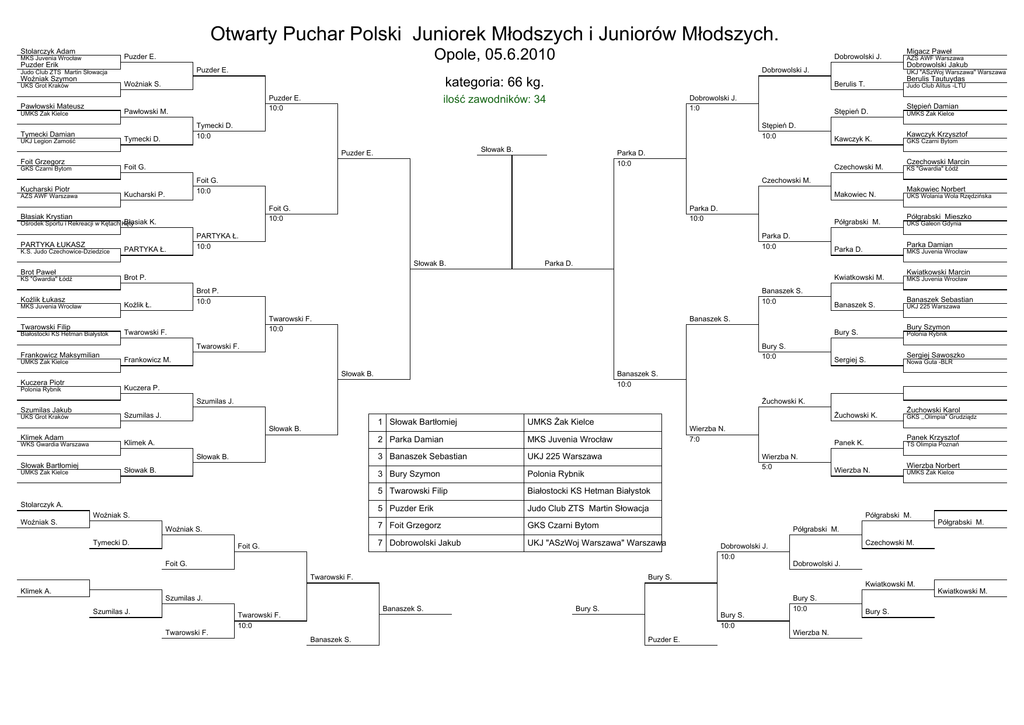 Otwarty Puchar Polski Juniorek Młodszych i Juniorów Młodszych. Stolarczyk Adam Opole, 05.6.2010 Puzder E. MKS Juvenia Wrocław Puzder Erik Judo Club ZTS Martin Słowacja Woźniak Szymon kategoria: 66 kg. Pawłowski Mateusz Pawłowski M. UMKS Żak Kielce Tymecki Damian Tymecki D. 10:0 Tymecki D. UKJ Legion Zamość Słowak B. Parka D. 10:0 Foit G. GKS Czarni Bytom Kucharski Piotr Błasiak Krystian Błasiak Ośrodek Sportu i Rekreacji w Kętach Kęty PARTYKA ŁUKASZ K.S. Judo Czechowice-Dziedzice Makowiec N. K. Parka D. 10:0 Półgrabski M. PARTYKA Ł. 10:0 Parka D. 10:0 Słowak B. Brot Paweł Koźlik Łukasz Twarowski Filip Białostocki KS Hetman Białystok Brot P. 10:0 Banaszek S. 10:0 Twarowski F. 10:0 UMKS Żak Kielce Twarowski F. Polonia Rybnik Bury S. 10:0 Frankowicz M. UKS Grot Kraków Kuczera P. WKS Gwardia Warszawa Klimek A. Słowak B. Słowak Bartłomiej UMKS Żak Kielce Słowak B. Stolarczyk A. Woźniak S. Woźniak S. Woźniak S. Tymecki D. Foit G. UMKS Żak Kielce 2 Parka Damian MKS Juvenia Wrocław 3 Banaszek Sebastian UKJ 225 Warszawa 3 Bury Szymon Polonia Rybnik 5 Twarowski Filip Białostocki KS Hetman Białystok 5 Puzder Erik Judo Club ZTS Martin Słowacja 7 Foit Grzegorz GKS Czarni Bytom 7 Dobrowolski Jakub UKJ "ASzWoj Warszawa" Warszawa Twarowski F. Twarowski F. UKS Wolania Wola Rzędzińska Półgrabski Mieszko UKS Galeon Gdynia Kwiatkowski Marcin MKS Juvenia Wrocław Banaszek Sebastian UKJ 225 Warszawa Bury Szymon Polonia Rybnik Sergiej S. Wierzba N. 7:0 Sergiej Sawoszko Nowa Guta -BLR Banaszek S. GKS ,,Olimpia" Grudziądz TS Olimpia Poznań Wierzba N. Wierzba Norbert UMKS Żak Kielce Półgrabski M. Półgrabski M. Dobrowolski J. 10:0 Bury S. Dobrowolski J. Kwiatkowski M. Bury S. 10:0 Puzder E. Półgrabski M. Czechowski M. Bury S. Banaszek S. Twarowski F. 10:0 Żuchowski Karol Panek Krzysztof Panek K. Wierzba N. 5:0 Szumilas J. Szumilas J. Banaszek S. Żuchowski K. 1 Słowak Bartłomiej Foit G. Klimek A. Makowiec Norbert Żuchowski K. Szumilas J. Słowak B. Klimek Adam KS "Gwardia" Łódź Banaszek S. 10:0 Szumilas J. Szumilas Jakub Czechowski Marcin MKS Juvenia Wrocław Bury S. Słowak B. Kuczera Piotr GKS Czarni Bytom Banaszek S. Twarowski F. Frankowicz Maksymilian Kawczyk Krzysztof Parka D. Kwiatkowski M. Koźlik Ł. MKS Juvenia Wrocław UMKS Żak Kielce Parka Damian Parka D. Brot P. KS "Gwardia" Łódź Kawczyk K. Stępień Damian Czechowski M. Foit G. 10:0 PARTYKA Ł. Judo Club Alitus -LTU Czechowski M. Foit G. 10:0 Kucharski P. AZS AWF Warszawa Berulis Tautuydas Stępień D. Stępień D. 10:0 Puzder E. Foit Grzegorz Dobrowolski J. 1:0 AZS AWF Warszawa UKJ "ASzWoj Warszawa" Warszawa Berulis T. ilość zawodników: 34 Puzder E. 10:0 Migacz Paweł Dobrowolski Jakub Dobrowolski J. Woźniak S. UKS Grot Kraków Dobrowolski J. Puzder E. Bury S. 10:0 Wierzba N. Bury S. Kwiatkowski M.