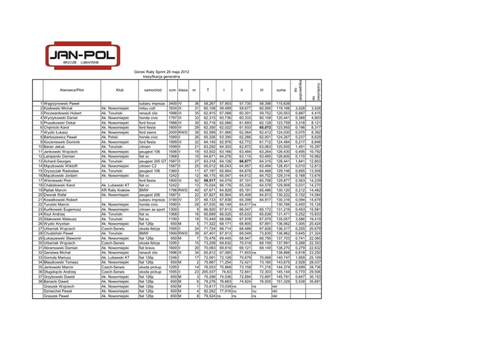 1 2 3 4 5 6 7 8 9 10 11 12 13 14 15 16 17 18 19 20 21 22 23 24 25 26 27 28 29 30 31 32 33 34 35 36 37 38 Węgrzynowski Paweł Kozłowski Michał Poczwardowski Hubert Wyrzykowski Daniel Prusakowski Oskar Chętnicki Karol Wyzlic Łukasz Bartoszewicz Paweł Kocieniewski Dominik Baran Jakub Jankowski Wojciech Lamparski Damian Achard Georges Mączkowski WiktoR Oryszczak Radosław Mączkowski Jordam Wiśniewski Piotr Chabatowski Karol Pętlak Marcin Dworak Rafał Kowalkowski Robert Turulski Marcin Kurlikowski Eugeniusz Ksyt Andrzej Siłakowski Mateusz Wyzlic Krystian Urbaniak Wojciech Chudziński Paweł Łukaszewski Sławomir Urbaniak Wojciech Abramowski Damian Genstwa Michał Gomuła Mariusz Błaszkowski Tomasz Jankowski Marcin Długokęcki Andrzej Grzybowski Dawid Banacki Dawid Graszek Wojciech Szmeichel Paweł Graszek Paweł Klub Ak. Ak. Ak. Ak. Ak. Ak. Ak. Ak. Ak. Ak. Ak. Ak. Ak. Ak. Ak. Nowomiejski Toruński Nowomiejski Nowomiejski Nowomiejski Nowomiejski Polski Nowomiejski Toruński Nowomiejski Nowomiejski Toruński Nowomiejski Toruński Nowomiejski Ak. Lubawski KT KR Rally Kraków Ak. Nowomiejski Ak. Nowomiejski Ak. Nowomiejski Ak. Toruński Ak. Toruński Ak. Nowomiejski Czech-Serwis Ak. Toruński Ak. Nowomiejski Czech-Serwis Ak. Nowomiejski Ak. Nowomiejski Ak. Lubawski KT Ak. Nowomiejski Czech-Serwis Czech-Serwis Ak. Nowomiejski Ak. Nowomiejski Ak. Nowomiejski Ak. Nowomiejski Ak. Nowomiejski samochód subaru impreza mitsu colt renault clio honda civic ford focus ford fiesta ford sierra honda civic ford fiesta citroen peugeot 106 fiat sc peugeot 205 GT citroen C2 peugeot 106 fiat cc ford fiesta fiat cc BMW peugeot 206 subaru impreza honda civic citroen ax sport fiat sc fiat sc fiat 126p skoda felicja BMW fiat 126p skoda felicja fiat brava renault clio fiat 126p fiat 126p skoda pickup skoda pickup fiat 126p fiat 126p fiat 126p fiat 126p fiat 126p ccm klasa 3400 1834 1998 1797 1988 1800 2000 1589 1999 1599 1598 1368 1587 1587 1360 1242 1800 1242 1796 1587 3190 1590 1300 1368 1190 650 1595 1900 650 1295 1600 1996 1246 650 1295 1595 650 650 650 650 650 IV III III III III III RWD II III II II I II II I I III I RWD II IV II I I I M II RWD M I II III I M I II M M M M M nr T I 36 58,267 57,903 31 60,108 59,489 35 62,915 67,088 33 62,315 60,736 30 62,716 62,066 29 62,350 62,022 38 62,589 61,966 26 65,326 63,395 32 64,140 62,976 21 63,292 64,303 19 63,502 63,166 10 64,671 64,276 27 63,318 64,126 25 65,012 66,043 11 67,197 65,864 12 66,175 65,047 82 69,517 64,079 13 70,024 66,176 40 67,671 64,929 22 67,827 65,904 37 66,133 67,838 28 67,035 66,149 9 66,920 67,613 16 65,689 66,025 18 70,449 68,596 5 71,322 68,171 24 71,724 68,714 39 67,401 67,913 7 70,476 69,445 15 73,208 69,832 20 70,083 69,816 34 65,812 67,085 17 72,091 72,128 2 75,867 71,254 14 76,053 75,868 23 205,037 74,63 3 75,298 74,036 6 79,276 76,663 1 70,817 73,039 ns 4 82,262 77,916 nu 8 79,524 ns ns II III suma 57,735 58,398 115,638 59,677 60,595 119,166 60,301 59,752 120,053 60,333 60,108 120,441 61,693 62,128 123,759 61,933 65,072 123,955 62,064 62,412 124,030 62,266 62,001 124,267 62,772 61,712 124,484 62,872 63,063 125,935 63,484 63,264 126,430 63,115 63,485 126,600 66,677 64,315 128,441 64,957 63,494 128,451 64,678 64,468 129,146 64,612 64,702 129,314 97,101 65,798 129,877 65,330 64,578 129,908 65,191 65,486 130,120 65,409 64,813 130,222 65,399 64,917 130,316 64,617 ns 130,766 66,047 65,172 131,219 65,633 65,838 131,471 67,978 67,079 135,057 68,805 67,891 136,062 68,489 67,828 136,317 69,049 73,835 136,962 68,947 68,756 137,703 70,018 68,159 137,991 69,121 69,149 138,270 71,803 ns 138,888 70,679 70,068 140,747 72,421 73,160 143,675 73,158 71,216 144,374 72,841 72,303 145,144 72,894 72,897 145,791 74,824 76,505 151,329 ns nkl nu nkl ns nkl 3,528 0,887 0,388 3,318 0,196 0,075 0,237 0,217 1,451 0,495 0,170 1,841 0,010 0,695 0,168 0,563 0,031 0,212 0,102 0,094 0,450 0,453 0,252 3,586 1,005 0,255 0,645 0,741 0,288 0,279 0,618 1,859 2,928 0,699 0,770 0,647 5,538 do zwycięzcy Kierowca/Pilot do poprzednika Górski Rally Sprint 20 maja 2012 klasyfikacja generalna 3,528 4,415 4,803 8,121 8,317 8,392 8,629 8,846 10,297 10,792 10,962 12,803 12,813 13,508 13,676 14,239 14,270 14,482 14,584 14,678 15,128 15,581 15,833 19,419 20,424 20,679 21,324 22,065 22,353 22,632 23,250 25,109 28,037 28,736 29,506 30,153 35,691 1 Gagacki Marcin/Paweł Topoliński/B 2 Kleina Andrzej 3 Binięda Andrzej mitsu lancer evo X Ak. Lubawski KT suzuki swift ford sierra OKR klasa nr T I II 3400 G 112 55,340 54,086 3400 G 52 70,068 67,764 1298 G 62 714,907 70,252 III 54,862 64,339 67,732 53,793 64,726 68,254 suma 107,879 129,065 21,186 135,986 6,921 21,186 28,107