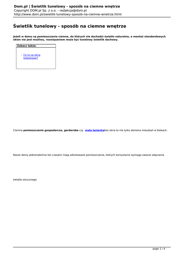 Dom.pl | Świetlik tunelowy - sposób na ciemne wnętrze Copyright DOM.pl Sp. z o.o. - [email protected] http://www.dom.pl/swietlik-tunelowy-sposob-na-ciemne-wnetrze.html Świetlik tunelowy - sposób na ciemne wnętrze Jeżeli w domu są pomieszczenia ciemne, do których nie dochodzi światło naturalne, a montaż standardowych okien nie jest możliwy, rozwiązaniem może być tunelowy świetlik dachowy. Zobacz także: - Co to są okna kolankowe? Ciemne pomieszczenie gospodarcze, garderoba czy mała łazienkabez okna to nie tylko domena mieszkań w blokach. Nasze domy jednorodzinne też czasami mają odizolowane pomieszczenia, których korzystanie wymaga zawsze włączania światła sztucznego. page 1 / 4 Dom.pl | Świetlik tunelowy - sposób na ciemne wnętrze Copyright DOM.pl Sp. z o.o. - [email protected] http://www.dom.pl/swietlik-tunelowy-sposob-na-ciemne-wnetrze.html (Świetliki tunelowe to słońce w dotychczas ciemnych pomieszczeniach. fot. archiwum DOM.pl) Świetlik tunelowy umożliwia doświetlenie takich pomieszczeń czy przestrzeni, jak toaleta, pomieszczenie gospodarcze czy klatka schodowa. Światło dociera do wnętrza poprzez specjalnie zaprojektowany i elastyczny tunel prowadzący od dachu budynku do sufitu. Świetliki wykorzystują zjawisko odbicia – promień słońca jest kierowany do wnętrza za pomocą pryzmatów i powierzchni lustrzanych. Światło dostarczone przez świetlik jest rozproszone, nie nagrzewa więc pomieszczenia latem i nie powoduje utraty ciepła zimą. Gdzie montować świetlik tunelowy? Świetlik tunelowy można montować w pomieszczeniach na parterze czy poddaszu, pod dachem spadzistym. We wnętrzu przezroczysty element rozpraszający światło wygląda on jak plafon na suficie. page 2 / 4 Dom.pl | Świetlik tunelowy - sposób na ciemne wnętrze Copyright DOM.pl Sp. z o.o. - [email protected] http://www.dom.pl/swietlik-tunelowy-sposob-na-ciemne-wnetrze.html (Wewnętrzny element doświetlający przypomina plafon. fot. archiwum DOM.pl) Kopułka, którą montuje się na połaci dachu może dostarczać światła do wnętrza usytuowanego do 6 m pod dachem (z zastosowaniem elementów przedłużających). W niektórych przypadkach więc świetlik tunelowy może doświetlić nawet piwnicę. Dzięki świetlikom adaptacja piwnicyna pokój rekreacji czy hobby będzie dużo łatwiejsza. Świetliki tunelowe najczęściej nie są otwierane, montuje się je na wysokości zwykle niedostępnej dla użytkownika. Jednak dzięki specjalnej powłoce na szybie hartowanej są odporne na uszkodzenia i zabrudzenia, więc nie wymają szczególnej konserwacji. Świetliki otwierane uchylnie to konstrukcje dwuramowe, które montuje się w pomieszczeniach, do których oprócz światła, należy doprowadzić również napływ powietrza. page 3 / 4 Dom.pl | Świetlik tunelowy - sposób na ciemne wnętrze Copyright DOM.pl Sp. z o.o. - [email protected] http://www.dom.pl/swietlik-tunelowy-sposob-na-ciemne-wnetrze.html (Sztywny tunel światłonośny łączy element wewnętrzny z kopułką, montowaną na połaci dachu. fot. VELUX) Ile światła dostarcza świetlik? To, ile światła zostanie doprowadzone do pomieszczenia, w którym zamontujemy świetlik uzależnione jest od wielu czynników, m.in. kąta nachylenia dachu, na którym znajduje się kopułka czy długości tunelu (im rura prowadząca jest krótsza, tym więcej światła dostarczy). Nie bez znaczenia jest również usytuowanie budynku względem stron świata – świetlik na stronie południowej dużo lepiej doświetli pomieszczenie, oraz od warunków pogodowych czy pory roku. page 4 / 4