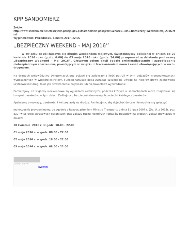 KPP SANDOMIERZ Źródło: http://www.sandomierz.swietokrzyska.policja.gov.pl/tsa/dzialania-policji/aktualnosci/13850,Bezpieczny-Weekend-maj-2016.ht ml Wygenerowano: Poniedziałek, 6 marca 2017, 22:05 ,,BEZPIECZNY WEEKEND - MAJ 2016’’ W związku ze zbliżającym się długim weekendem majowym, świętokrzyscy policjanci w dniach od 29 kwietnia 2016 roku (godz. 6:00) do 03 maja 2016 roku (godz. 24:00) przeprowadzą działania pod nazwą „Bezpieczny Weekend – Maj 2016”. Głównym celem akcji będzie zminimalizowanie i zapobieganie niebezpiecznym zdarzeniom, powstającym w związku z lekceważeniem norm i zasad obowiązujących w ruchu drogowym. Na drogach województwa świętokrzyskiego pojawi się zwiększona ilość patroli w tym pojazdów nieoznakowanych wyposażonych w wideorejestratory. Funkcjonariusze będą zwracać szczególną uwagę na nieprawidłowe zachowania użytkowników dróg, takie jak przekroczenie prędkości lub nieprawidłowe wyprzedzanie. Pamiętajmy, że wyjazdy weekendowe są wyjazdami rodzinnymi, podczas których w samochodach może znajdować się komplet pasażerów, w tym dzieci. Zadbajmy o bezpieczeństwo naszych pociech i każdego z pasażerów. Apelujemy o rozwagę, trzeźwość i kulturę jazdy na drodze. Pamiętajmy, aby dojechać do celu nie musimy się spieszyć . Jednocześnie przypominamy, że zgodnie z Rozporządzeniem Ministra Transportu z dnia 31 lipca 2007 r. (Dz. U. z 2013r. poz. 839) w sprawie okresowych ograniczeń oraz zakazu ruchu niektórych rodzajów pojazdów na drogach, zakaz obowiązuje w dniach: 30 kwietnia 2016 r. w godz. 18.00 - 22.00 01 maja 2016 r. w godz. 08.00 - 22.00 02 maja 2016 r. w godz. 18.00 - 22.00 03 maja 2016 r. w godz. 08.00 - 22.00 Ocena: 0/5 (0) Tweetnij