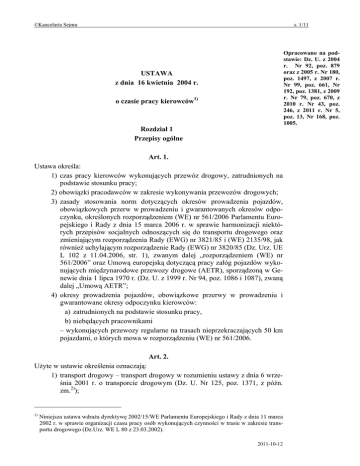 ©Kancelaria Sejmu s. 1/11 Opracowano na podstawie: Dz. U. z 2004 r. Nr 92, poz. 879 oraz z 2005 r. Nr 180, poz. 1497, z 2007 r. Nr 99, poz. 661, Nr 192, poz. 1381, z 2009 r. Nr 79, poz. 670, z 2010 r. Nr 43, poz. 246, z 2011 r. Nr 5, poz. 13, Nr 168, poz. 1005. USTAWA z dnia 16 kwietnia 2004 r. o czasie pracy kierowców1) Rozdział 1 Przepisy ogólne Art. 1. Ustawa określa: 1) czas pracy kierowców wykonujących przewóz drogowy, zatrudnionych na podstawie stosunku pracy; 2) obowiązki pracodawców w zakresie wykonywania przewozów drogowych; 3) zasady stosowania norm dotyczących okresów prowadzenia pojazdów, obowiązkowych przerw w prowadzeniu i gwarantowanych okresów odpoczynku, określonych rozporządzeniem (WE) nr 561/2006 Parlamentu Europejskiego i Rady z dnia 15 marca 2006 r. w sprawie harmonizacji niektórych przepisów socjalnych odnoszących się do transportu drogowego oraz zmieniającym rozporządzenia Rady (EWG) nr 3821/85 i (WE) 2135/98, jak również uchylającym rozporządzenie Rady (EWG) nr 3820/85 (Dz. Urz. UE L 102 z 11.04.2006, str. 1), zwanym dalej „rozporządzeniem (WE) nr 561/2006” oraz Umową europejską dotyczącą pracy załóg pojazdów wykonujących międzynarodowe przewozy drogowe (AETR), sporządzoną w Genewie dnia 1 lipca 1970 r. (Dz. U. z 1999 r. Nr 94, poz. 1086 i 1087), zwaną dalej „Umową AETR”; 4) okresy prowadzenia pojazdów, obowiązkowe przerwy w prowadzeniu i gwarantowane okresy odpoczynku kierowców: a) zatrudnionych na podstawie stosunku pracy, b) niebędących pracownikami – wykonujących przewozy regularne na trasach nieprzekraczających 50 km pojazdami, o których mowa w rozporządzeniu (WE) nr 561/2006. Art. 2. Użyte w ustawie określenia oznaczają: 1) transport drogowy – transport drogowy w rozumieniu ustawy z dnia 6 września 2001 r. o transporcie drogowym (Dz. U. Nr 125, poz. 1371, z późn. zm.2)); 1) Niniejsza ustawa wdraża dyrektywę 2002/15/WE Parlamentu Europejskiego i Rady z dnia 11 marca 2002 r. w sprawie organizacji czasu pracy osób wykonujących czynności w trasie w zakresie transportu drogowego (Dz.Urz. WE L 80 z 23.03.2002). 2011-10-12 ©Kancelaria Sejmu s. 2/11 2) przewóz drogowy – przewóz drogowy w rozumieniu rozporządzenia (WE) nr 561/2006; 3) przewóz regularny – międzynarodowy przewóz regularny w rozumieniu przepisów ustawy z dnia 6 września 2001 r. o transporcie drogowym (Dz. U. z 2007 r. Nr 125, poz. 874, z późn. zm.3)) oraz publiczny transport zbiorowy w rozumieniu przepisów ustawy z dnia 16 grudnia 2010 r. o publicznym transporcie zbiorowym (Dz. U. Nr 5, poz. 13); 4) stanowisko pracy kierowcy: a) siedzibę pracodawcy, na rzecz którego kierowca wykonuje swoje obowiązki, oraz inne miejsce prowadzenia działalności przez pracodawcę, w szczególności filie, przedstawicielstwa i oddziały, b) pojazd, który kierowca prowadzi, c) każde inne miejsce, w którym kierowca wykonuje czynności związane z wykonywanymi przewozami drogowymi; 5) tydzień – okres pomiędzy godziną 0000 w poniedziałek i godziną 24oo w niedzielę; 6) dzienny okres odpoczynku – okres odpoczynku kierowcy, w rozumieniu rozporządzenia (WE) nr 561/2006; 7) podróż służbowa – każde zadanie służbowe polegające na wykonywaniu, na polecenie pracodawcy: a) przewozu drogowego poza miejscowość, o której mowa w pkt 4 lit. a, lub b) wyjazdu poza miejscowość, o której mowa w pkt 4 lit. a, w celu wykonania przewozu drogowego. Art. 3. Przepisy ustawy nie naruszają postanowień zawartych w rozporządzeniu (WE) nr 561/2006 i Umowie AETR. Art. 4. W zakresie nieuregulowanym ustawą stosuje się przepisy ustawy z dnia 26 czerwca 1974 r. – Kodeks pracy (Dz. U. z 1998 r. Nr 21, poz. 994, z późn. zm.4)). Art. 4a. Przepisy ustawy stosuje się odpowiednio do motorniczych tramwajów. 2) Zmiany wymienionej ustawy zostały ogłoszone w Dz. U. z 2002 r. Nr 25, poz. 253, Nr 89, poz. 804 i Nr 199, poz. 1671 oraz z 2003 r. Nr 137, poz. 1302, Nr 149, poz. 1452 i Nr 211, poz. 2050. 3) Zmiany tekstu jednolitego wymienionej ustawy zostały ogłoszone w Dz. U. z 2007 r. Nr 176, poz. 1238 i Nr 192, poz. 1381, z 2008 r. Nr 218, poz. 1391, Nr 227, poz. 1505 i Nr 234, poz. 1574, z 2009 r. Nr 18, poz. 97, Nr 31, poz. 206, Nr 86, poz. 720 i Nr 98, poz. 817 oraz z 2010 r. Nr 43, poz. 246, Nr 164, poz. 1107, Nr 225, poz. 1466, Nr 247, poz. 1652 i Nr 249, poz. 1656. 4) Zmiany tekstu jednolitego ustawy zostały ogłoszone w Dz. U. z 1998 r. Nr 106, poz. 668 i Nr 113, poz. 717, z 1999 r. Nr 99, poz. 1152, z 2000 r. Nr 19, poz. 239, Nr 43, poz. 489, Nr 107, poz. 1127 i Nr 120, poz. 1268, z 2001 r. Nr 11, poz. 84, Nr 28, poz. 301, Nr 52, poz. 538, Nr 99, poz. 1075, Nr 111, poz. 1194, Nr 123, poz. 1354, Nr 128, poz. 1405 i Nr 154, poz. 1805, z 2002 r. Nr 74, poz. 676, Nr 135, poz. 1146, Nr 196, poz. 1660, Nr 199, poz. 1673 i Nr 200, poz. 1679 oraz z 2003 r. Nr 166, poz. 1608 i Nr 213, poz. 2081. 2011-10-12 ©Kancelaria Sejmu s. 3/11 Rozdział 2 Czas pracy kierowców zatrudnionych na podstawie stosunku pracy Art. 5. Przepisy niniejszego rozdziału mają zastosowanie do kierowców zatrudnionych na podstawie stosunku pracy, jeżeli przepisy innych ustaw nie stanowią inaczej. Art. 6. 1. Czasem pracy kierowcy jest czas od rozpoczęcia do zakończenia pracy, która obejmuje wszystkie czynności związane z wykonywaniem przewozu drogowego, w szczególności: 1) prowadzenie pojazdu; 2) załadowywanie i rozładowywanie oraz nadzór nad załadunkiem i wyładunkiem; 3) nadzór oraz pomoc osobom wsiadającym i wysiadającym; 4) czynności spedycyjne; 5) obsługę codzienną pojazdów i przyczep; 6) inne prace podejmowane w celu wykonania zadania służbowego lub zapewnienia bezpieczeństwa osób, pojazdu i rzeczy; 7) niezbędne formalności administracyjne; 8) utrzymanie pojazdu w czystości. 2. Czasem pracy kierowcy jest również czas poza przyjętym rozkładem czasu pracy, w którym kierowca pozostaje na stanowisku pracy kierowcy w gotowości 