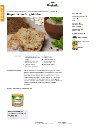 BONDUELLE / PRZEPIS / PRZYSTAWKA / WEGETARIAŃSKIE / WEGAŃSKI SMALEC Z JABŁKIEM Wegański smalec z jabłkiem ILOŚĆ PORCJI CZAS PRZYGOTOWANIA OCENA brak KATEGORIE WEGETARIAŃSKIE PRZYSTAWKA DODANE PRZEZ BONDUELLE PODOBNE PRZEPISY Buraki z jabłkiem Sałata z grillowanymi warzywami Hummus SKŁADNIKI: SPOSÓB PRZYGOTOWANIA: Biała Fasola Cannellini PAKOWANA PRÓŻNIOWO (425 g) Ziele angielskie (1 szt.) Jałowiec (do smaku) Lubczyk (1/4 łyż.) Sól i pieprz (do smaku) Cebula (2 szt.) Jabłko (1 szt.) Liście laurowe (2 szt.) Goździki (do smaku) Majeranek (1/2 łyż.) Sos sojowy (1 łyż.) Cebulę i jabłko pokroić w kostkę. Na patelni rozgrzać olej i dodać posiekaną cebulkę oraz jabłko wraz z zielem, jałowcem, goździkiem i liśćmi laurowymi. Smażyć na małym ogniu do czasu, aż cebulka będzie złota, a jabłka miękkie. Zmiksować fasolę razem z sosem sojowym, majerankiem, sporą szczyptą pieprzu, soli i 1/4 szklanki zimnej wody, odstawić. Z podsmażonej cebulki i jabłka wyłowić przyprawy. Cebulkę i jabłko dodać do zmiksowanej fasoli. Delikatnie zmiksować. Doprawić do smaku solą i pieprzem. Podawać schłodzone. PRODUKTY BONDUELLE UŻYTE W PRZEPISIE Biała Fasola Cannellini PAKOWANA PRÓŻNIOWO MASA NETTO: 310 g ODCIEK: 250 g POJEMNOŚĆ: 425 ml All rights reserved projekt i realizacja Copyright © 2012-2015 Bonduelle Agencja Reklamowa 4 ALL