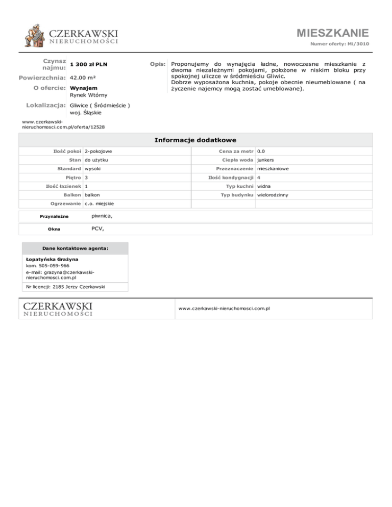 MIESZKANIE Numer oferty: Mi/3010 Czynsz 1 300 zł PLN najmu: Powierzchnia: 42.00 m² O ofercie: Wynajem Opis: Proponujemy do wynajęcia ładne, nowoczesne mieszkanie z dwoma niezależnymi pokojami, położone w niskim bloku przy spokojnej uliczce w śródmieściu Gliwic. Dobrze wyposażona kuchnia, pokoje obecnie nieumeblowane ( na życzenie najemcy mogą zostać umeblowane). Rynek Wtórny Lokalizacja: Gliwice ( Śródmieście ) woj. Śląskie www.czerkawskinieruchomosci.com.pl/oferta/12528 Informacje dodatkowe Ilość pokoi 2-pokojowe Stan do użytku Standard wysoki Piętro 3 Cena za metr 0.0 Ciepła woda junkers Przeznaczenie mieszkaniowe Ilość kondygnacji 4 Ilość łazienek 1 Typ kuchni widna Balkon balkon Typ budynku wielorodzinny Ogrzewanie c.o. miejskie Przynależne Okna piwnica, PCV, Dane kontaktowe agenta: Łopatyńska Grażyna kom. 505-059-966 e-mail: [email protected] Nr licencji: 2185 Jerzy Czerkawski www.czerkawski-nieruchomosci.com.pl