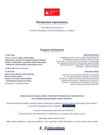 12.02.2013, Bydgoszcz, Hotel City Bydgoszcz, ul. 3 Maja 6 13.00-14.00 wykład autorski Joanny Ostrowskiej Aktywizacja uczniów na lekcjach je˛zyków obcych. Umysł i osobowość w procesie uczenia sie ˛ je˛zyka – efektywne wykorzystanie potencjału ucznia. 14.00-14.30 Przerwa kawowa 14.30-16.30 Wie ich aus meinem Unterricht das Beste machen kann? Lehren und Lernen durch Spiele – methodische Tipps und Tricks. Prowadzenie: Alexander Alisch 08.02.2013 r.