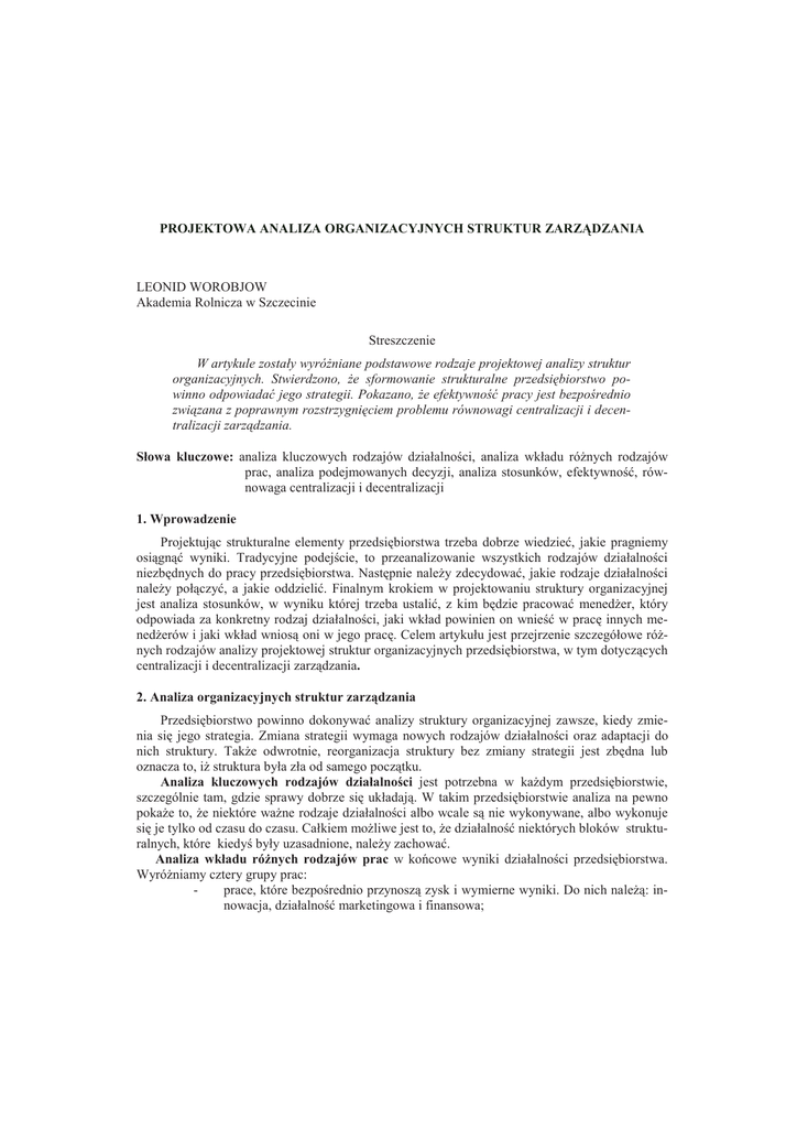 PROJEKTOWA ANALIZA ORGANIZACYJNYCH STRUKTUR ZARZDZANIA LEONID WOROBJOW Akademia Rolnicza w Szczecinie Streszczenie W artykule zostały wyróniane podstawowe rodzaje projektowej analizy struktur organizacyjnych. Stwierdzono, e sformowanie strukturalne przedsibiorstwo powinno odpowiada jego strategii. Pokazano, e efektywno pracy jest bezporednio zwizana z poprawnym rozstrzygniciem problemu równowagi centralizacji i decentralizacji zarzdzania. Słowa kluczowe: analiza kluczowych rodzajów działalnoci, analiza wkładu rónych rodzajów prac, analiza podejmowanych decyzji, analiza stosunków, efektywno, równowaga centralizacji i decentralizacji 1. Wprowadzenie Projektujc strukturalne elementy przedsibiorstwa trzeba dobrze wiedzie, jakie pragniemy osign wyniki. Tradycyjne podejcie, to przeanalizowanie wszystkich rodzajów działalnoci niezbdnych do pracy przedsibiorstwa. Nastpnie naley zdecydowa, jakie rodzaje działalnoci naley połczy, a jakie oddzieli. Finalnym krokiem w projektowaniu struktury organizacyjnej jest analiza stosunków, w wyniku której trzeba ustali, z kim bdzie pracowa meneder, który odpowiada za konkretny rodzaj działalnoci, jaki wkład powinien on wnie w prac innych menederów i jaki wkład wnios oni w jego prac. Celem artykułu jest przejrzenie szczegółowe rónych rodzajów analizy projektowej struktur organizacyjnych przedsibiorstwa, w tym dotyczcych centralizacji i decentralizacji zarzdzania. 2. Analiza organizacyjnych struktur zarz dzania Przedsibiorstwo powinno dokonywa analizy struktury organizacyjnej zawsze, kiedy zmienia si jego strategia. Zmiana strategii wymaga nowych rodzajów działalnoci oraz adaptacji do nich struktury. Take odwrotnie, reorganizacja struktury bez zmiany strategii jest zbdna lub oznacza to, i struktura była zła od samego pocztku. Analiza kluczowych rodzajów działalnoci jest potrzebna w kadym przedsibiorstwie, szczególnie tam, gdzie sprawy dobrze si układaj. W takim przedsibiorstwie analiza na pewno pokae to, e niektóre wane rodzaje działalnoci albo wcale s nie wykonywane, albo wykonuje si je tylko od czasu do czasu. Całkiem moliwe jest to, e działalno niektórych bloków strukturalnych, które kiedy były uzasadnione, naley zachowa. Analiza wkładu rónych rodzajów prac w ko cowe wyniki działalnoci przedsibiorstwa. Wyróniamy cztery grupy prac: prace, które bezporednio przynosz zysk i wymierne wyniki. Do nich nale: innowacja, działalno marketingowa i finansowa; Leonid Worobjow Projektowa analiza organizacyjnych struktur zarzdzania 192 - nauka i przekwalifikowanie pracowników, działalno produkcyjno–techniczna i zaopatrzeniowa; działalno informacyjna; wspomagajce rodzaje działalnoci (sprztanie i utrzymywanie w czystoci pomieszcze , praca w stołówkach, kabinach natryskowych, punktach medycznych, archiwach itd.). Wszystkie rodzaje tych prac same nie daj bezporednich wyników, ale wnosz wkład w wyniki ogólne poprzez przedstawienie swoich wyrobów lub usług. Klasyfikacja pracy jest potrzebna do tego, eby nie myli prac wspomagajcych z pracami, które przynosz zysk i daj wymierne korzyci. Wkład tego lub innego rodzaju prac powinno wyznaczy jego miejsce i rang. Prace kluczowe nigdy nie powinny podporzdkowywa si wtórnym pracom. Analiza podejmowanych decyzji. Podział pełnomocnictw i odpowiedzialnoci za podejmowane decyzje wymaga ich klasyfikacji. Istot kadej decyzji menederskiej okrelaj nastpujce charakterystyki: charakterystyka czasowa, tj. w jakim terminie w przyszłoci decyzja ta bdzie obowizywa w przedsibiorstwie i jak szybko mona j zmieni, wpływ decyzji na inne funkcje przedsibiorstwa lub na przedsibiorstwo w całoci. Jeeli decyzja dotyczy tylko jednej funkcji, to jest decyzj niszego szczebla. W innym przypadku decyzje mona podejmowa na wyszym szczeblu, na którym mona ocenia jej wpływ na wszystkie funkcje. Optymalizacja jednej z funkcji nie powinna by wykonywana dziki innym funkcjom, decyzja wyznaczana jest poprzez szereg wskaników (wartoci etyczne, socjalne oraz polityczne przekonania, zasady zachowania itp.). W tym przypadku, gdy wskaniki te bierze si pod uwag, to decyzje powinny by podejmowane na wyszym szczeblu. Biorc pod uwag to, e najwaniejszym produkcyjnym czynnikiem s ludzie, wszystkie decyzje dotyczce personelu powinny by podejmowane przez kierownictwo wyszego szczebla przedsibiorstwa, - decyzje dziel si na: rutynowe, rzadkie i unikalne. Rutynowa decyzja wymaga ogólnego przepisu, tj. decyzji jako zasady i podejmuje si j na wyszym szczeblu. Wykorzystywanie tego sposobu podczas rozwizywania konkretnego zadania moe zosta przeniesione na niszy szczebel. Rzadkie decyzje odbierane s jako unikalne i wymagaj specjalnego opracowania. Optymalnie decyzja powinna by podejmowana na najniszym szczeblu, jak najbliej miejsca jej zastosowania. Wówczas decyzja ta uwzgldnia wszystkie rodzaje działalnoci i zadania których dotyczy. Analiza stosunków. Podstawowe prawo, które odnosi si do rozmieszczenia kadego rodzaju działalnoci w strukturze zarzdzania przedsibiorstwem, mówi: „strukturalne komórki powinny by zwizane z minimalnymi stosunkami”. Wówczas stosunki, od których zaley sukces i efektywny wkład konkretnego działu, powinny by wygodne. Wizi naley sprowadzi do minimum, ale kada wi powinna bezporednio odnosi si do sprawy. W niewielkim przedsibiorstwie wszystkie wymienione rodzaje analizy, podczas projektowania organizacyjnej struktury zarzdzania, zostan wykonane w cigu kilku godzin. W wielkich i skomplikowanych przedsibiorstwach te analizy mog zaj miesice i lata cikiej pracy. W procesie analizy projektowej struktur organizacyjnych zaleca si take zwrócenie uwagi na obecno jawnych oznak mismenedmentu (z ang. „mismanagement” – złe zarzdzanie). Najpowaniejsza oznaka to zwikszenie szczebli w hierarchii. Kady dodatkowy szczebel zarzdzania pogarsza informacje i utrudnia wzajemne rozumienie. Powstaje „efekt koca”. Najbardziej posze- POLSKIE STOWARZYSZENIE ZARZDZANIA WIEDZ Seria: Studia i Materiały,