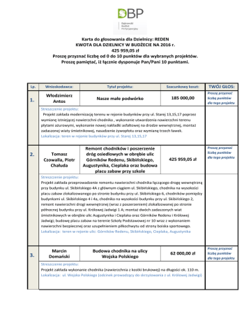 Karta do głosowania dla Dzielnicy: REDEN KWOTA DLA DZIELNICY W BUDŻECIE NA 2016 r. 425 959,05 zł Proszę przyznać liczbę od 0 do 10 punktów dla wybranych projektów. Proszę pamiętać, iż łącznie dysponuje Pan/Pani 10 punktami. Lp. Wnioskodawca: 1. Włodzimierz Antos Tytuł projektu: Nasze małe podwórko Szacunkowy koszt: TWÓJ GŁOS: 185 000,00 Proszę przyznać liczbę punktów dla tego projektu Streszczenie projektu: Projekt zakłada modernizację terenu w rejonie budynków przy ul. Starej 13,15,17 poprzez wymianę istniejącej nawierzchni chodnika , wykonanie utwardzenia nawierzchni terenu płytami ażurowymi, wykonanie nowej nakładki asfaltowej na drodze wewnętrznej, montaż zadaszonej wiaty śmietnikowej, nasadzenie żywopłotu oraz wymianę trzech ławek. Lokalizacja: teren w rejonie budynków przy ul. Starej 13,15,17 2. Tomasz Czowalla, Piotr Chałuda Remont chodników i poszerzenie dróg osiedlowych w obrębie ulic Górników Redenu, Skibińskiego, Augustynika, Cieplaka oraz budowa placu zabaw przy szkole 425 959,05 zł Proszę przyznać liczbę punktów dla tego projektu Streszczenie projektu: Projekt zakłada przeprowadzenie remontu nawierzchni chodnika łączącego drogę wewnętrzną przy budynku ul. Skibińskiego 4A z głównym ciągiem ul. Skibińskiego, chodnika na wysokości placu zabaw zlokalizowanego po stronie budynku przy ul. Skibińskiego 6, chodników pomiędzy budynkami ul. Skibińskiego 4 i 4a, chodnika na wysokości budynku przy ul. Skibińskiego 2, remont nawierzchni drogi wewnętrznej (wraz z poszerzeniem) zlokalizowanej po stronie północnej budynku przy ul. Królowej Jadwigi 1 A; montaż dwóch zadaszonych wiat śmietnikowych w obrębie ulic Augustynika i Cieplaka oraz Górników Redenu i Królowej Jadwigi; budowę placu zabaw na terenie Szkoły Podstawowej nr 10 wraz z wykonaniem nawierzchni bezpiecznej oraz uzupełnieniem piłkochwytu od strony boiska sportowego. Lokalizacja: teren w rejonie ulic: Górników Redenu, Skibińskiego, Cieplaka, Augustynika 3. Marcin Domański Budowa chodnika na ulicy Wojska Polskiego 62 000,00 zł Streszczenie projektu: Projekt zakłada wykonanie chodnika (nawierzchnia z kostki brukowej) na długości ok. 110 m. Lokalizacja: ul. Wojska Polskiego (odcinek prowadzący do skrzyżowania z ul. Królowej Jadwigi) Proszę przyznać liczbę punktów dla tego projektu 4. Jan Gertner Modernizacja terenu w rejonie Pomnika Pamięci 10 Powieszonych z Huty Bankowej 160 000,00 zł Proszę przyznać liczbę punktów dla tego projektu Streszczenie projektu: Projekt zakłada wykonanie remontu chodnika oraz schodów terenowych zlokalizowanych 2 równolegle do budynku przy ul. Augustynika 9 (ok. 350 m ) wraz z nasadzeniem zieleni niskiej oraz wykonaniem nowych schodów. Lokalizacja: teren przy pomniku w rejonie budynków przy ul. Augustynika 9,11 Jan Sabatura 5. 400 000,00 zł Proszę przyznać liczbę punktów dla tego projektu Streszczenie projektu: Projekt zakłada przeprowadzenie remontu nawierzchni chodnika od ul. Królowej Jadwigi wzdłuż budynków przy ul. Reymonta 14,16 do skrzyżowania z ul. Augustynika oraz od pawilonów handlowych wzdłuż parkingu do budynku Reymonta 1 wraz z chodnikiem prowadzącym pomiędzy budynkami Kopernika 42 a, 42 c; budowę placu zabaw: montaż zestawu zabawowego „Julek A’, huśtawki podwójnej „Kasia 2:, huśtawka „bocianie gniazdo”, piaskownica „malwa”, trzy kiwaki sprężynowe, urządzenie ruchowe „Żółw wersja II, karuzela krzyżowa „Jaś”, wykonanie nawierzchni bezpiecznej pod urządzeniami zabawowymi, wykonanie ogrodzenia placu zabaw Lokalizacja: ul. Reymonta 14,16, teren w rejonie bloków przy ul. Kopernika 42 a, 42 c, skwer pomiędzy ul. Reymonta i ul. Kopernika Danuta Wojciechowska 6. Remont ciągów komunikacji pieszej oraz wykonanie placu zabaw w rejonie ul. Reymonta i Kopernika Spotkajmy się w Bibliotece 90 000,00 zł Streszczenie projektu: Projekt zakłada doposażenie Filii nr 4 Miejskiej Biblioteki Publicznej poprzez zakup m.in. książek, komputerów, oprogramowania, drukarki, telewizora, sprzętu biurowego, multimediów i materiałów edukacyjnych dla dzieci; organizację warsztatów i projektów edukacyjnych. Lokalizacja: Filia nr 4 Miejskiej Biblioteki Publicznej Biuro Organizacji Pozarządowych i Aktywności Obywatelskiej, Urząd Miejski w Dąbrowie Górniczej, ul. Graniczna 21, Tel. 32 295-67-41, 32 295-96-38, mail: [email protected] Proszę przyznać liczbę punktów dla tego projektu *Oświadczam, że w dniu oddania głosu ukończyłem(-am) 16 lat, zamieszkuję pod wskazanym poniżej adresem, a dane, które zawarłem(-am) w karcie do głosowania są zgodne z prawdą. Jednocześnie jestem świadomy(-a) odpowiedzialności wynikającej z podawania nieprawdziwych informacji i składania nieprawdziwych oświadczeń. ** Na podstawie art.7 pkt 5 ustawy z dnia 29 sierpnia 1997 r. o ochronie danych osobowych (t.j. Dz. U z 2014 r. poz. 1182 z póżn.zm.) wyrażam zgodę na przetwarzanie moich danych osobowych przez Prezydenta Miasta Dąbrowa Górnicza w celu opracowania wyników głosowania w ramach prowadzonych konsultacji wydatków z budżetu Miasta Dąbrowa Górnicza, czyli Budżetu Partycypacyjnego. *** Administratorem danych jest Prezydent Miasta Dąbrowa Górnicza, ul.Graniczna 21, 41-300 Dąbrowa Górnicza. Dane osobowe przetwarzane są wyłącznie w celu realizacji konsultacji wydatków z budżetu Miasta Dąbrowa Górnicza, czyli Budżetu Partycypacyjnego na 2016 rok i nie będą przekazywane innym odbiorcom. Osobie, której dane dotyczą przysługuje prawo dostępu do treści zawartych danych. Podanie danych jest dobrowolne jednak bez ich podania nie jest możliwe uczestnictwo w głosowaniu. Imię i nazwisko głosującego: (PROSZĘ WYPEŁNIĆ DRUKOWANYMI LITERAMI) Adres zamieszkania: (PROSZĘ WYPEŁNIĆ DRUKOWANYMI LITERAMI) PESEL: Podpis: Biuro Organizacji Pozarządowych i Aktywności Obywatelskiej, Urząd Miejski w Dąbrowie Górniczej, ul. Graniczn