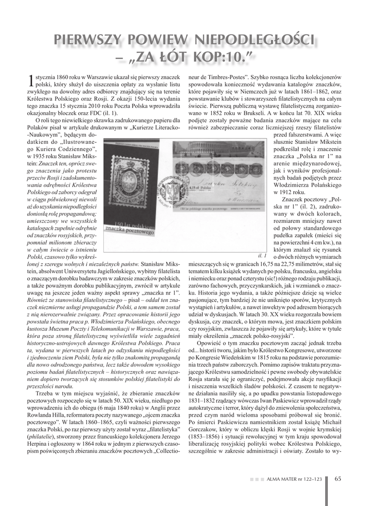 PIERWSZY POWIEW NIEPODLEGŁOŚCI – „ZA ŁÓT KOP:10.” 1 stycznia 1860 roku w Warszawie ukazał się pierwszy znaczek polski, który służył do uiszczenia opłaty za wysłanie listu zwykłego na dowolny adres odbiorcy znajdujący się na terenie Królestwa Polskiego oraz Rosji. Z okazji 150-lecia wydania tego znaczka 15 stycznia 2010 roku Poczta Polska wprowadziła okazjonalny bloczek oraz FDC (il. 1). O roli tego niewielkiego skrawka zadrukowanego papieru dla Polaków pisał w artykule drukowanym w „Kurierze Literacko-Naukowym”, będącym dodatkiem do „Ilustrowanego Kuriera Codziennego”, w 1935 roku Stanisław Mikstein: Znaczek ten, oprócz swego znaczenia jako protestu przeciw Rosji i zadokumentowania odrębności Królestwa Polskiego od zaborcy odegrał w ciągu półwiekowej niewoli aż do uzyskania niepodległości doniosłą rolę propagandową; umieszczony we wszystkich katalogach zupełnie odrębnie od znaczków rosyjskich, przypomniał milionom zbieraczy w całym świecie o istnieniu Polski, czasowo tylko wykreślonej z szeregu wolnych i niezależnych państw. Stanisław Mikstein, absolwent Uniwersytetu Jagiellońskiego, wybitny filatelista o znaczącym dorobku badawczym w zakresie znaczków polskich, a także poważnym dorobku publikacyjnym, zwrócił w artykule uwagę na jeszcze jeden ważny aspekt sprawy „znaczka nr 1”. Również ze stanowiska filatelistycznego – pisał – oddał ten znaczek niezmierne usługi propagandzie Polski, a tem samem został z nią nierozerwalnie związany. Przez opracowanie historii jego powstała świetna praca p. Włodzimierza Polańskiego, obecnego kustosza Muzeum Poczty i Telekomunikacji w Warszawie, praca, która poza stroną filatelistyczną wyświetliła wiele zagadnień historyczno-ustrojowych dawnego Królestwa Polskiego. Praca ta, wydana w pierwszych latach po odzyskaniu niepodległości i zjednoczeniu ziem Polski, była nie tylko znakomitą propagandą dla nowo odrodzonego państwa, lecz także dowodem wysokiego poziomu badań filatelistycznych – historycznych oraz nawiązaniem dopiero tworzących się stosunków polskiej filatelistyki do przeszłości narodu. Trzeba w tym miejscu wyjaśnić, że zbieranie znaczków pocztowych rozpoczęło się w latach 50. XIX wieku, niedługo po wprowadzeniu ich do obiegu (6 maja 1840 roku) w Anglii przez Rowlanda Hilla, reformatora poczty nazywanego „ojcem znaczka pocztowego”. W latach 1860–1865, czyli ważności pierwszego znaczka Polski, po raz pierwszy użyty został wyraz „filatelistyka” (philatelie), stworzony przez francuskiego kolekcjonera Jerzego Herpina i ogłoszony w 1864 roku w jednym z pierwszych czasopism poświęconych zbieraniu znaczków pocztowych „Collectio- neur de Timbres-Postes”. Szybko rosnąca liczba kolekcjonerów spowodowała konieczność wydawania katalogów znaczków, które pojawiły się w Niemczech już w latach 1861–1862, oraz powstawanie klubów i stowarzyszeń filatelistycznych na całym świecie. Pierwszą publiczną wystawę filatelistyczną zorganizowano w 1852 roku w Brukseli. A w końcu lat 70. XIX wieku podjęte zostały poważne badania znaczków mające na celu również zabezpieczanie coraz liczniejszej rzeszy filatelistów przed fałszerstwami. A więc słusznie Stanisław Mikstein podkreślał rolę i znaczenie znaczka „Polska nr 1” na arenie międzynarodowej, jak i wyników profesjonalnych badań podjętych przez Włodzimierza Polańskiego w 1912 roku. Znaczek pocztowy „Polska nr 1” (il. 2), zadrukowany w dwóch kolorach, rozmiarem mniejszy nawet od połowy standardowego pudełka zapałek (mieści się na powierzchni 4 cm kw.), na którym znalazł się rysunek il. 1 o dwóch różnych wymiarach mieszczących się w granicach 16,75 na 22,75 milimetrów, stał się tematem kilku książek wydanych po polsku, francusku, angielsku i niemiecku oraz ponad czterystu (sic!) różnego rodzaju publikacji, zarówno fachowych, przyczynkarskich, jak i wzmianek o znaczku. Historia jego wydania, a także późniejsze dzieje są wielce pasjonujące, tym bardziej że nie uniknięto sporów, krytycznych wystąpień i artykułów, a nawet inwektyw pod adresem biorących udział w dyskusjach. W latach 30. XX wieku rozgorzała bowiem dyskusja, czy znaczek, o którym mowa, jest znaczkiem polskim czy rosyjskim, zwłaszcza że pojawiły się artykuły, które w tytule miały określenia „znaczek polsko-rosyjski”. Opowieść o tym znaczku pocztowym zacząć jednak trzeba od... historii tworu, jakim było Królestwo Kongresowe, utworzone po Kongresie Wiedeńskim w 1815 roku na podstawie porozumienia trzech państw zaborczych. Pomimo zapisów traktatu przyznającego Królestwu samodzielność i pewne swobody obywatelskie Rosja starała się je ograniczyć, podejmowała akcje rusyfikacji i niszczenia wszelkich śladów polskości. Z czasem te negatywne działania nasiliły się, a po upadku powstania listopadowego 1831–1832 rządzący wówczas Iwan Paskiewicz wprowadził rządy autokratyczne i terror, który dążył do zniewolenia społeczeństwa, przed czym naród wieloma sposobami próbował się bronić. Po śmierci Paskiewicza namiestnikiem został książę Michaił Gorczakow, który w obliczu klęski Rosji w wojnie krymskiej (1853–1856) i sytuacji rewolucyjnej w tym kraju spowodował liberalizację rosyjskiej polityki wobec Królestwa Polskiego, szczególnie w zakresie administracji i oświaty. Zostało to wy- ALMA MATER nr 122–123 65 korzystane, ze strony polskiej, do podporządkowania Zarządu Okręgu Poczty Królestwa Polskiego bezpośrednio namiestnikowi i Radzie Administracyjnej Królestwa Polskiego. Dzięki temu od dnia 1 września 1858 roku Poczta Królestwa Polskiego zyskała pewną autonomię, a tym samym prawo do opracowania własnych przepisów służbowych, taryfowych i organizacyjnych. Wydawano „Cyrkularz Zarządu Pocztowego Królestwa Polskiego” redagowany w języku polskim, który był jedynym urzędowy
