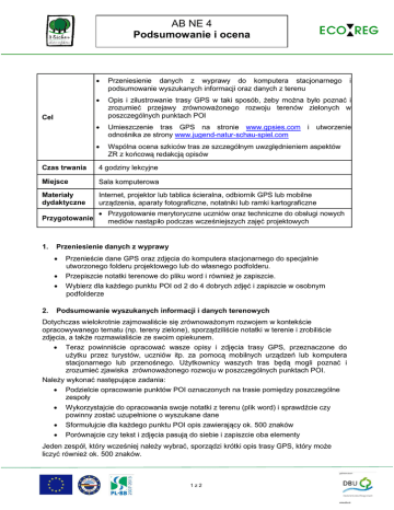 AB NE 4 Podsumowanie i ocena Przeniesienie danych z wyprawy do komputera stacjonarnego podsumowanie wyszukanych informacji oraz danych z terenu Opis i zilustrowanie trasy GPS w taki sposób, żeby można było poznać i zrozumieć przejawy zrównoważonego rozwoju terenów zielonych w poszczególnych punktach POI Umieszczenie tras GPS na stronie www.gpsies.com i utworzenie odnośnika ze strony www.jugend-natur-schau-spiel.com Wspólna ocena szkiców tras ze szczególnym uwzględnieniem aspektów ZR z końcową redakcją opisów Cel Czas trwania 4 godziny lekcyjne Miejsce Sala komputerowa Materiały dydaktyczne Internet, projektor lub tablica ścieralna, odbiornik GPS lub mobilne urządzenia, aparaty fotograficzne, notatniki lub ramki kartograficzne Przygotowanie Przygotowanie merytoryczne uczniów oraz techniczne do obsługi nowych mediów nastąpiło podczas wcześniejszych zajęć projektowych 1. Przeniesienie danych z wyprawy 2. Przenieście dane GPS oraz zdjęcia do komputera stacjonarnego do specjalnie utworzonego folderu projektowego lub do własnego podfolderu. Przepiszcie notatki terenowe do pliku word i również je zapiszcie. Wybierz dla każdego punktu POI od 2 do 4 dobrych zdjęć i zapiszcie w osobnym podfolderze Podsumowanie wyszukanych informacji i danych terenowych Dotychczas wielokrotnie zajmowaliście się zrównoważonym rozwojem w kontekście opracowywanego tematu (np. tereny zielone), sporządziliście notatki w terenie i zrobiliście zdjęcia, a także rozmawialiście ze swoim opiekunem. Teraz powinniście opracować wasze opisy i zdjęcia trasy GPS, przeznaczone do użytku przez turystów, uczniów itp. za pomocą mobilnych urządzeń lub komputera stacjonarnego lub przenośnego. Użytkownicy waszych tras będą mogli poznać i zrozumieć zjawiska zrównoważonego rozwoju w poszczególnych punktach POI. Należy wykonać następujące zadania: Podzielcie opracowanie punktów POI oznaczonych na trasie pomiędzy poszczególne zespoły Wykorzystajcie do opracowania swoje notatki z terenu (plik word) i sprawdźcie czy powinny zostać uzupełnione o wyszukane dane Sformułujcie dla każdego punktu POI opis zawierający ok. 500 znaków Porównajcie czy tekst i zdjęcia pasują do siebie i zapiszcie oba elementy Jeden zespół, który wcześniej należy wybrać, sporządzi krótki opis trasy GPS, który może liczyć również ok. 500 znaków. 1z2 i AB NE 4 Podsumowanie i ocena Podajcie przy tym siebie i swoją szkołę jako autora trasy i wymieńcie instytucję, która was wspierała w przy pracach projektowych. 3. Umieszczenie tras GPS na www.gpsies.com Wszelkie wymagane etapy pracy na www.gpsies.com już przećwiczyliście, i nie potrzebujecie już żadnych dodatkowych instrukcji. Wykonajcie następujące czynności: Umieśćcie tracka GPS z atrybutem „niepubliczny“ na www.gpsies.com. Skorygujcie przebieg tracka, dopasowując go do sieci dróg na mapach open street map (OSM). Sprawdźcie położenie i oznaczenie punktów POI; skorygujcie w razie potrzeby. Skopiujcie teksty do punktów POI oraz do ogólnego pola z opisem, wgrajcie zdjęcia na stronę internetową. Dodajcie do opisu POI linki do dalszych informacji Umieszczenie trasy GPS http://www.jugend-natur-schau-spiel.com/erlebnis/gpserlebnistouren.html musicie uzgodnić z panią Deponte z pro agro e.V.. 4. Wspólna ocena szkicu tras Obejrzyjcie trasę na stronie www.gpsies.com i wyraźcie zdanie na temat jej opisów i jakości. Zróbcie notatki. Zespoły przedstawią teraz na forum klasy opisy i zdjęcia punktów POI. Przedyskutujcie, czy twierdzenia dotyczące zrównoważonego rozwoju w danych punktach POI są zrozumiałe i opatrzone dobrymi zdjęciami i linkami. Określcie, co można poprawić (należy wcześniej wyznaczyć protokolanta). Zmieńcie trasę GPS w taki sposób, aby odpowiadała waszemu wyobrażeniu i opublikujcie ją zaznaczając atrybut „publiczna“. Wyślijcie link do trasy GPS do instytucji wspierającej merytorycznie i poproście je także o ocenę trasy. Ocena powinna zostać z Wami przedyskutowana. Wskazówki możecie odpowiednio wprowadzić na stronie www.gpsies.com. Notatki: 2z2