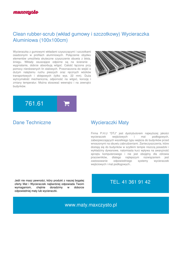 Clean rubber-scrub (wkład gumowy i szczotkowy) Wycieraczka Aluminiowa (100x100cm) Wycieraczka z gumowymi wkładami czyszczącymi i szczotkami osadzonymi w profilach aluminiowych. Połączenie obydwu elementów umożliwia skuteczne czyszczenie obuwia z błota, śniegu. Wkłady osuszające odporne są na ścieranie , wygniatanie, dobrze absorbują wilgoć. Całość łączona przy pomocy nierdzewnych lin stalowych. Przeznaczona do wejść o dużym natężeniu ruchu pieszych oraz ręcznych wózków transportowych i sklepowych (tylko wys. 22 mm). Duża wytrzymałość mechaniczna, odporność na wilgoć, korozję i zmiany temperatur. Można stosować wewnątrz i na zewnątrz budynków. 761.61 Dane Techniczne Wycieraczki Maty Firma P.H.U "DTJ" jest dystrybutorem najwyższej jakości wycieraczek wejściowych i mat podłogowych, zabezpieczających wszelkiego typu wejścia do budynków przed wnoszonymi na obuwiu zabrudzeniami. Zanieczyszczenia, które dostają się do budynków w szybkim tempie niszczą posadzki i wykładziny dywanowe, natomiasta kurz wpływa na awaryjność sprzętu komputerowego i nie jest obojętny dla zdrowia pracowników, dlatego najlepszym rozwiązaniem jest zastosowanie odpowiedniego systemy wycieraczek wejściowych i mat podłogowych.. Jeśli nie masz pewności, który produkt z naszej bogatej oferty Mat i Wycieraczek najbardziej odpowiada Twoim wymaganiom, chętnie doradzimy w doborze odpowiedniej maty lub wycieraczki. TEL. 41 361 91 42 www.maty.maxczysto.pl 1/1 Powered by TCPDF (www.tcpdf.org)
