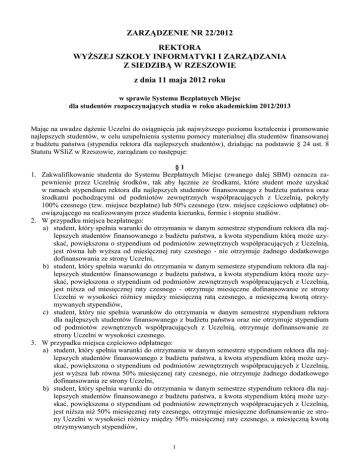 ZARZĄDZENIE NR 22/2012 REKTORA WYŻSZEJ SZKOŁY INFORMATYKI I ZARZĄDZANIA Z SIEDZIBĄ W RZESZOWIE z dnia 11 maja 2012 roku w sprawie Systemu Bezpłatnych Miejsc dla studentów rozpoczynających studia w roku akademickim 2012/2013 Mając na uwadze dążenie Uczelni do osiągnięcia jak najwyższego poziomu kształcenia i promowanie najlepszych studentów, w celu uzupełnienia systemu pomocy materialnej dla studentów finansowanej z budżetu państwa (stypendia rektora dla najlepszych studentów), działając na podstawie § 24 ust. 8 Statutu WSIiZ w Rzeszowie, zarządzam co następuje: §1 1. Zakwalifikowanie studenta do Systemu Bezpłatnych Miejsc (zwanego dalej SBM) oznacza zapewnienie przez Uczelnię środków, tak aby łącznie ze środkami, które student może uzyskać w ramach stypendium rektora dla najlepszych studentów finansowanego z budżetu państwa oraz środkami pochodzącymi od podmiotów zewnętrznych współpracujących z Uczelnią, pokryły 100% czesnego (tzw. miejsce bezpłatne) lub 50% czesnego (tzw. miejsce częściowo odpłatne) obowiązującego na realizowanym przez studenta kierunku, formie i stopniu studiów. 2. W przypadku miejsca bezpłatnego: a) student, który spełnia warunki do otrzymania w danym semestrze stypendium rektora dla najlepszych studentów finansowanego z budżetu państwa, a kwota stypendium którą może uzyskać, powiększona o stypendium od podmiotów zewnętrznych współpracujących z Uczelnią, jest równa lub wyższa od miesięcznej raty czesnego - nie otrzymuje żadnego dodatkowego dofinansowania ze strony Uczelni, b) student, który spełnia warunki do otrzymania w danym semestrze stypendium rektora dla najlepszych studentów finansowanego z budżetu państwa, a kwota stypendium którą może uzyskać, powiększona o stypendium od podmiotów zewnętrznych współpracujących z Uczelnią, jest niższa od miesięcznej raty czesnego - otrzymuje miesięczne dofinansowanie ze strony Uczelni w wysokości różnicy między miesięczną ratą czesnego, a miesięczną kwotą otrzymywanych stypendiów, c) student, który nie spełnia warunków do otrzymania w danym semestrze stypendium rektora dla najlepszych studentów finansowanego z budżetu państwa oraz nie otrzymuje stypendium od podmiotów zewnętrznych współpracujących z Uczelnią, otrzymuje dofinansowanie ze strony Uczelni w wysokości czesnego. 3. W przypadku miejsca częściowo odpłatnego: a) student, który spełnia warunki do otrzymania w danym semestrze stypendium rektora dla najlepszych studentów finansowanego z budżetu państwa, a kwota stypendium którą może uzyskać, powiększona o stypendium od podmiotów zewnętrznych współpracujących z Uczelnią, jest wyższa lub równa 50% miesięcznej raty czesnego, nie otrzymuje żadnego dodatkowego dofinansowania ze strony Uczelni, b) student, który spełnia warunki do otrzymania w danym semestrze stypendium rektora dla najlepszych studentów finansowanego z budżetu państwa, a kwota stypendium którą może uzyskać, powiększona o stypendium od podmiotów zewnętrznych współpracujących z Uczelnią, jest niższa niż 50% miesięcznej raty czesnego, otrzymuje miesięczne dofinansowanie ze strony Uczelni w wysokości różnicy między 50% miesięcznej raty czesnego, a miesięczną kwotą otrzymywanych stypendiów, 1 c) student, który nie spełnia warunków do otrzymania w danym semestrze stypendium rektora dla najlepszych studentów finansowanego z budżetu państwa oraz nie otrzymuje stypendium od podmiotów zewnętrznych współpracujących z Uczelnią, otrzymuje dofinansowanie ze strony Uczelni w wysokości 50% czesnego. §2 SBM obejmuje studentów pierwszego roku studiów pierwszego stopnia, z wyłączeniem studentów studiów stacjonarnych na kierunku Informatyka. §3 1. Nadzór organizacyjny nad SBM sprawuje Koordynator SBM, zwany dalej Koordynatorem. 2. Koordynator jest członkiem Komisji ds. SBM, o której mowa w § 10 ust. 2. §4 Zasady postępowania kwalifikacyjnego do SBM określają: 1) w przypadku naboru na semestr zimowy 2012/2013 - §§ 5 - 7 niniejszego zarządzenia, 2) w przypadku naboru na semestr letni 2012/2013 - §§ 8 - 10 niniejszego zarządzenia. §5 1. Postępowanie kwalifikacyjne do SBM na semestr zimowy 2012/2013 przeprowadzane jest w ramach postępowania rekrutacyjnego. 2. W przypadku ubiegania się o przyjęcie na stacjonarne studia pierwszego stopnia w postępowaniu kwalifikacyjnym do SBM mogą wziąć udział: a) absolwenci szkół średnich posiadający polskie obywatelstwo, którzy do 31 lipca 2012 roku złożą komplet dokumentów wymaganych w postępowaniu rekrutacyjnym na studia, b) absolwenci szkół średnich posiadający obywatelstwo następujących krajów: Rosji, Ukrainy, Białorusi, Mołdawii, Armenii, Kazachstanu lub innych krajów byłego Związku Radzieckiego, którzy do 31 lipca 2012 roku złożą komplet dokumentów wymaganych w postępowaniu rekrutacyjnym na studia oraz uzyskają w postępowaniu rekrutacyjnym co najmniej 25 punktów za świadectwo maturalne i świadectwo ukończenia szkoły średniej. 3. W przypadku ubiegania się o przyjęcie na niestacjonarne studia pierwszego stopnia, w postępowaniu kwalifikacyjnym do SBM mogą wziąć udział absolwenci szkół średnich, którzy do 31 lipca 2012 roku złożą komplet dokumentów wymaganych w postępowaniu rekrutacyjnym na studia oraz w postępowaniu rekrutacyjnym uzyskali co najmniej: a) 200 punktów za świadectwo maturalne w przypadku osób zdających nową maturę, b) 20 punktów za świadectwo maturalne i świadectwo ukończenia szkoły średniej w przypadku osób zdających starą maturę. 4. O zakwalifikowanie do SBM mogą ubiegać się wyłącznie osoby, które po raz pierwszy podejmują studia pierwszego stopnia w WSIiZ w Rzeszowie. 5. Postępowanie kwalifikacyjne przeprowadza Wydziałowa Komisja Rekrutacyjna. 6. Przy ustalaniu wyników postępowania kwalifikacyjnego Komisja uwzględnia liczbę punktów uzysk