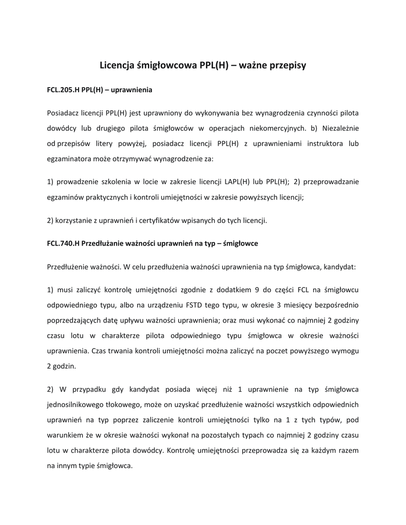 Licencja śmigłowcowa PPL(H) – ważne przepisy FCL.205.H PPL(H) – uprawnienia Posiadacz licencji PPL(H) jest uprawniony do wykonywania bez wynagrodzenia czynności pilota dowódcy lub drugiego pilota śmigłowców w operacjach niekomercyjnych. b) Niezależnie od przepisów litery powyżej, posiadacz licencji PPL(H) z uprawnieniami instruktora lub egzaminatora może otrzymywać wynagrodzenie za: 1) prowadzenie szkolenia w locie w zakresie licencji LAPL(H) lub PPL(H); 2) przeprowadzanie egzaminów praktycznych i kontroli umiejętności w zakresie powyższych licencji; 2) korzystanie z uprawnień i certyfikatów wpisanych do tych licencji. FCL.740.H Przedłużanie ważności uprawnień na typ – śmigłowce Przedłużenie ważności. W celu przedłużenia ważności uprawnienia na typ śmigłowca, kandydat: 1) musi zaliczyć kontrolę umiejętności zgodnie z dodatkiem 9 do części FCL na śmigłowcu odpowiedniego typu, albo na urządzeniu FSTD tego typu, w okresie 3 miesięcy bezpośrednio poprzedzających datę upływu ważności uprawnienia; oraz musi wykonać co najmniej 2 godziny czasu lotu w charakterze pilota odpowiedniego typu śmigłowca w okresie ważności uprawnienia. Czas trwania kontroli umiejętności można zaliczyć na poczet powyższego wymogu 2 godzin. 2) W przypadku gdy kandydat posiada więcej niż 1 uprawnienie na typ śmigłowca jednosilnikowego tłokowego, może on uzyskać przedłużenie ważności wszystkich odpowiednich uprawnień na typ poprzez zaliczenie kontroli umiejętności tylko na 1 z tych typów, pod warunkiem że w okresie ważności wykonał na pozostałych typach co najmniej 2 godziny czasu lotu w charakterze pilota dowódcy. Kontrolę umiejętności przeprowadza się za każdym razem na innym typie śmigłowca. 3) W przypadku gdy kandydat posiada więcej niż 1 uprawnienie na typ śmigłowca jednosilnikowego turbinowego o maksymalnej poświadczonej masie startowej nie większej niż 3 175 kg, może on uzyskać przedłużenie ważności wszystkich odpowiednich uprawnień na typ poprzez zaliczenie kontroli umiejętności tylko na 1 z tych typów, pod warunkiem że wykona: (i) 300 godzin czasu lotu w charakterze pilota dowódcy śmigłowca; (ii) 15 godzin czasu lotu na każdym z typów, na który posiada uprawnienia; oraz (iii) co najmniej 2 godziny czasu lotu w charakterze pilota dowódcy na każdym z pozostałych typów w okresie ważności uprawnienia. Kontrolę umiejętności przeprowadza się za każdym razem na innym typie śmigłowca. 5) Pilot, który zaliczył egzamin praktyczny przeprowadzany w celu wydania dodatkowego uprawnienia na typ, uzyskuje przedłużenie ważności innych odpowiednich uprawnień na typ w ramach grupy wspólnej zgodnie z pkt 3 i 4. 6) Przedłużenie ważności uprawnienia IR(H), jeżeli pilot takowe posiada, można połączyć z kontrolą umiejętności przeprowadzaną w celu przedłużenia ważności uprawnienia na typ. b) Kandydat, który nie zaliczy wszystkich sekcji kontroli umiejętności przed datą upływu ważności uprawnienia na typ, nie może korzystać z tego uprawnienia do czasu zaliczenia kontroli umiejętności. W przypadkach przewidzianych w lit. a) pkt 3 i lit. a) pkt 4, kandydat taki nie może korzystać z żadnego ze swoich uprawnień.