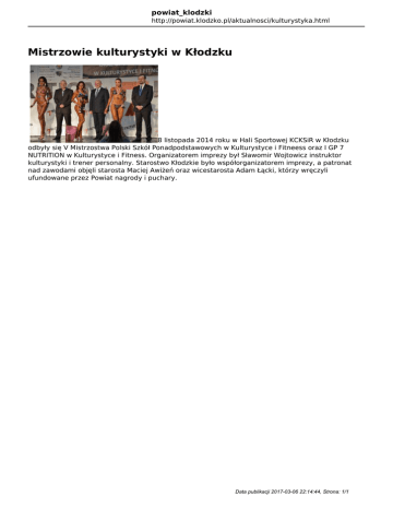 powiat_klodzki http://powiat.klodzko.pl/aktualnosci/kulturystyka.html Mistrzowie kulturystyki w Kłodzku 8 listopada 2014 roku w Hali Sportowej KCKSiR w Kłodzku odbyły się V Mistrzostwa Polski Szkół Ponadpodstawowych w Kulturystyce i Fitneess oraz I GP 7 NUTRITION w Kulturystyce i Fitness. Organizatorem imprezy był Sławomir Wojtowicz instruktor kulturystyki i trener personalny. Starostwo Kłodzkie było współorganizatorem imprezy, a patronat nad zawodami objęli starosta Maciej Awiżeń oraz wicestarosta Adam Łącki, którzy wręczyli ufundowane przez Powiat nagrody i puchary. Data publikacji 2017-03-06 22:14:44, Strona: 1/1