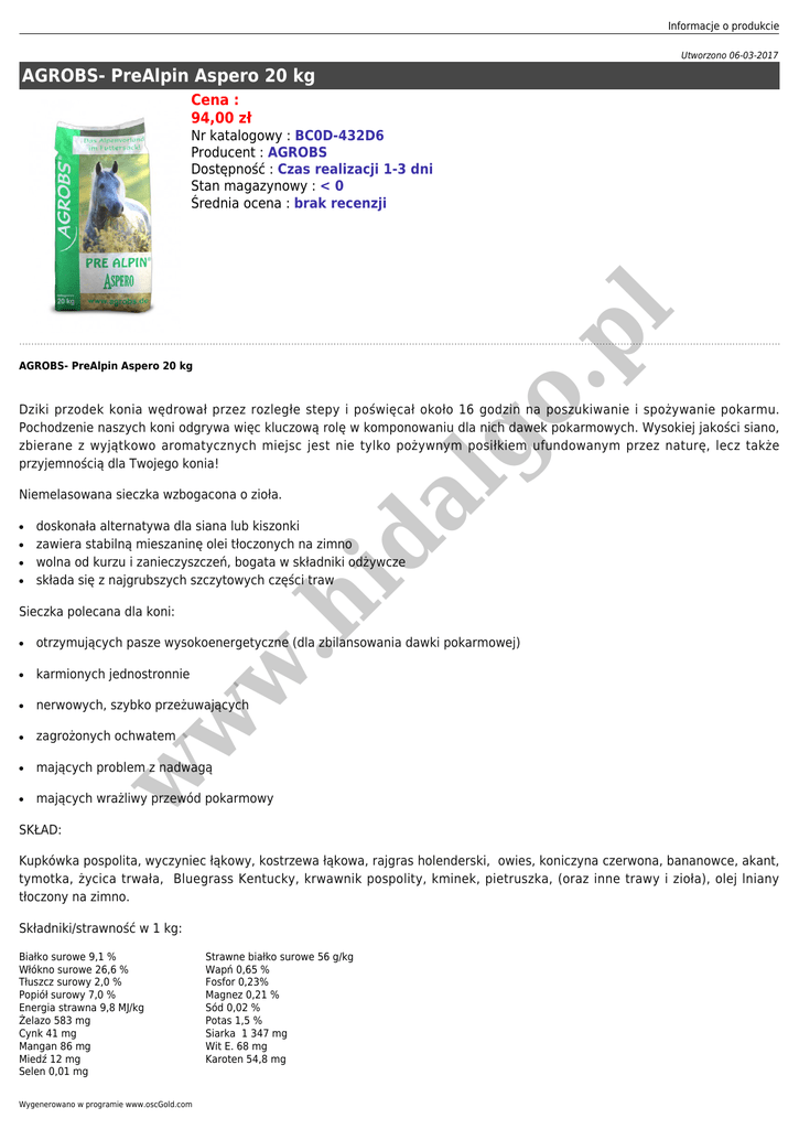 Informacje o produkcie Utworzono 06-03-2017 AGROBS- PreAlpin Aspero 20 kg Cena : 94,00 zł .p l Nr katalogowy : BC0D-432D6 Producent : AGROBS Dostępność : Czas realizacji 1-3 dni Stan magazynowy : < 0 Średnia ocena : brak recenzji al go AGROBS- PreAlpin Aspero 20 kg Dziki przodek konia wędrował przez rozległe stepy i poświęcał około 16 godzin na poszukiwanie i spożywanie pokarmu. Pochodzenie naszych koni odgrywa więc kluczową rolę w komponowaniu dla nich dawek pokarmowych. Wysokiej jakości siano, zbierane z wyjątkowo aromatycznych miejsc jest nie tylko pożywnym posiłkiem ufundowanym przez naturę, lecz także przyjemnością dla Twojego konia! Niemelasowana sieczka wzbogacona o zioła. ● ● doskonała alternatywa dla siana lub kiszonki zawiera stabilną mieszaninę olei tłoczonych na zimno wolna od kurzu i zanieczyszczeń, bogata w składniki odżywcze składa się z najgrubszych szczytowych części traw id ● Sieczka polecana dla koni: w .h ● otrzymujących pasze wysokoenergetyczne (dla zbilansowania dawki pokarmowej) ● karmionych jednostronnie ● nerwowych, szybko przeżuwających ● zagrożonych ochwatem ● mających problem z nadwagą ● mających wrażliwy przewód pokarmowy w w ● SKŁAD: Kupkówka pospolita, wyczyniec łąkowy, kostrzewa łąkowa, rajgras holenderski, owies, koniczyna czerwona, bananowce, akant, tymotka, życica trwała, Bluegrass Kentucky, krwawnik pospolity, kminek, pietruszka, (oraz inne trawy i zioła), olej lniany tłoczony na zimno. Składniki/strawność w 1 kg: Białko surowe 9,1 % Włókno surowe 26,6 % Tłuszcz surowy 2,0 % Popiół surowy 7,0 % Energia strawna 9,8 MJ/kg Żelazo 583 mg Cynk 41 mg Mangan 86 mg Miedź 12 mg Selen 0,01 mg Wygenerowano w programie www.oscGold.com Strawne białko surowe 56 g/kg Wapń 0,65 % Fosfor 0,23% Magnez 0,21 % Sód 0,02 % Potas 1,5 % Siarka 1 347 mg Wit E. 68 mg Karoten 54,8 mg Zalecane żywienie: w w w .h id al go .p l 0,4 kg-1 kg sieczki jako dodatek do dziennej racji paszy treściwej.