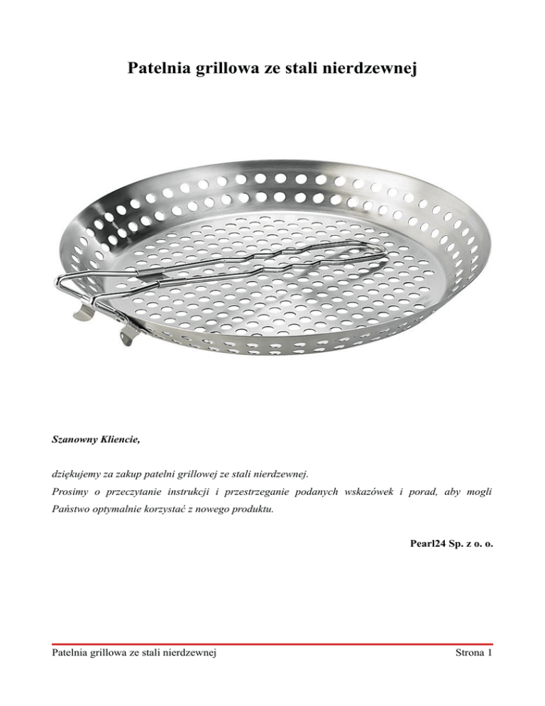 Patelnia grillowa ze stali nierdzewnej Szanowny Kliencie, dziękujemy za zakup patelni grillowej ze stali nierdzewnej. Prosimy o przeczytanie instrukcji i przestrzeganie podanych wskazówek i porad, aby mogli Państwo optymalnie korzystać z nowego produktu. Pearl24 Sp. z o. o. Patelnia grillowa ze stali nierdzewnej Strona 1 Zawartość zestawu • Patelnia grillowa • Instrukcja obsługi. Szczegóły produktu Użytkowanie Należy rozłożyć uchwyt, aż do zatrzaśnięcia. Składany uchwyt jest bardzo gorący podczas grillowania. Nie należy go dotykać bez rękawic ochronnych. Czyszczenie Przed czyszczeniem należy pozostawić patelnię do ostygnięcia. Patelnię można myć w zmywarce. Dane techniczne • Średnica: 30 cm • Wysokość: 4 cm • Składany uchwyt • Długość rączki: 28 cm • Materiał: stal nierdzewna. Patelnia grillowa ze stali nierdzewnej Strona 2 Bezpieczeństwo • Niniejsza instrukcja ma na celu zapoznanie Państwa z zasadami prawidłowego korzystania z produktu. Zaleca się przechowywanie instrukcji w łatwo dostępnym miejscu, aby w razie potrzeby mogli Państwo zweryfikować informacje. • Wszelkie modyfikacje produktu obniżają poziom jego bezpieczeństwa. UWAGA! Istnieje ryzyko obrażeń! • Zaleca się ostrożne obchodzenie się z produktem. Produkt może ulec uszkodzeniu w wyniku uderzenia, wstrząsów lub upadku nawet z niewielkiej wysokości. • Grill jest bardzo gorący podczas użytkowania. Zaleca się używanie rękawic ochronnych, celem uniknięcia poparzenia. • Nie należy używać patelni na kuchence elektrycznej etc. • Wszelkie prawa do wprowadzania zmian technicznych oraz eliminacji błędów są zastrzeżone. Patelnia grillowa ze stali nierdzewnej Strona 3