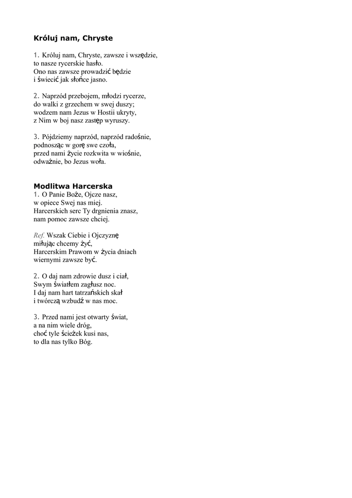 Króluj nam, Chryste 1. Króluj nam, Chryste, zawsze i wszędzie, to nasze rycerskie hasło. Ono nas zawsze prowadzić będzie i świecić jak słońce jasno. 2. Naprzód przebojem, młodzi rycerze, do walki z grzechem w swej duszy; wodzem nam Jezus w Hostii ukryty, z Nim w boj nasz zastęp wyruszy. 3. Pójdziemy naprzód, naprzód radośnie, podnosząc w gorę swe czoła, przed nami życie rozkwita w wiośnie, odważnie, bo Jezus woła. Modlitwa Harcerska 1. O Panie Boże, Ojcze nasz, w opiece Swej nas miej. Harcerskich serc Ty drgnienia znasz, nam pomoc zawsze chciej. Ref. Wszak Ciebie i Ojczyznę miłując chcemy żyć, Harcerskim Prawom w życia dniach wiernymi zawsze być. 2. O daj nam zdrowie dusz i ciał, Swym światłem zagłusz noc. I daj nam hart tatrzańskich skał i twórczą wzbudź w nas moc. 3. Przed nami jest otwarty świat, a na nim wiele dróg, choć tyle ścieżek kusi nas, to dla nas tylko Bóg.