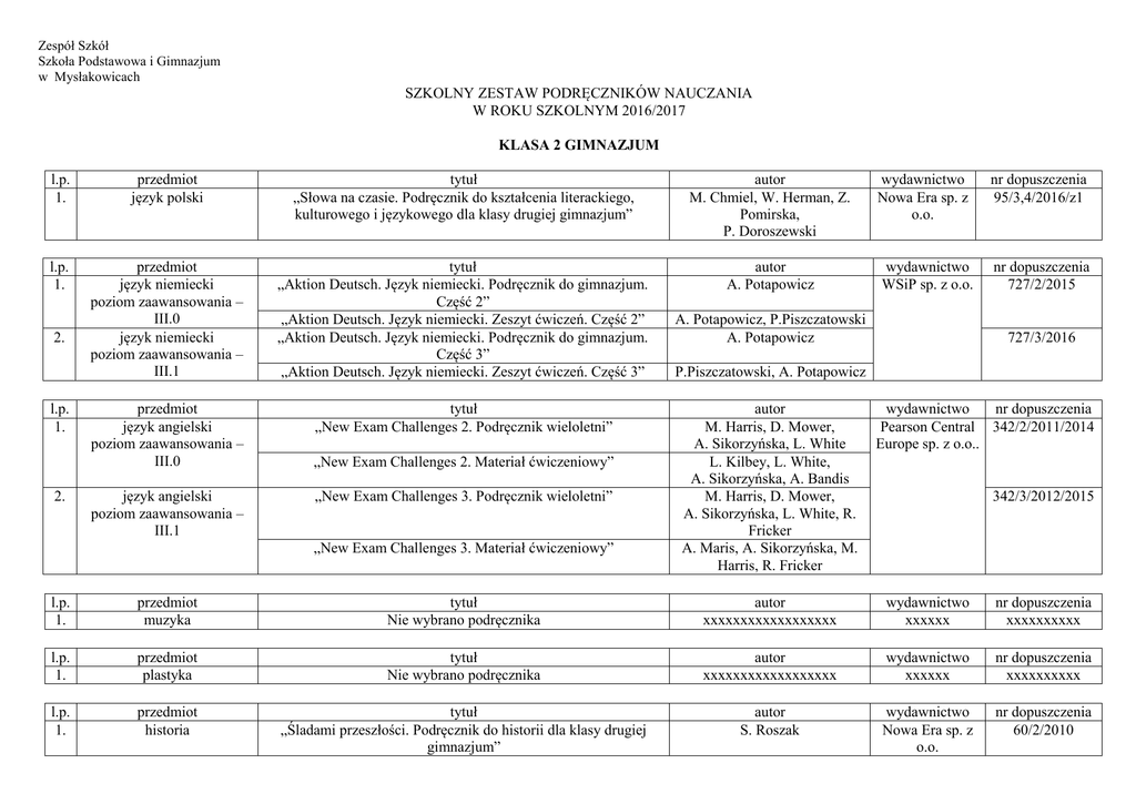Zespół Szkół Szkoła Podstawowa i Gimnazjum w Mysłakowicach SZKOLNY ZESTAW PODRĘCZNIKÓW NAUCZANIA W ROKU SZKOLNYM 2016/2017 KLASA 2 GIMNAZJUM l.p. 1. przedmiot język polski tytuł „Słowa na czasie. Podręcznik do kształcenia literackiego, kulturowego i językowego dla klasy drugiej gimnazjum” autor M. Chmiel, W. Herman, Z. Pomirska, P. Doroszewski l.p. 1. przedmiot język niemiecki poziom zaawansowania – III.0 język niemiecki poziom zaawansowania – III.1 tytuł „Aktion Deutsch. Język niemiecki. Podręcznik do gimnazjum. Część 2” „Aktion Deutsch. Język niemiecki. Zeszyt ćwiczeń. Część 2” „Aktion Deutsch. Język niemiecki. Podręcznik do gimnazjum. Część 3” „Aktion Deutsch. Język niemiecki. Zeszyt ćwiczeń. Część 3” autor A. Potapowicz przedmiot język angielski poziom zaawansowania – III.0 tytuł „New Exam Challenges 2. Podręcznik wieloletni” 2. l.p. 1. 2. język angielski poziom zaawansowania – III.1 „New Exam Challenges 2. Materiał ćwiczeniowy” „New Exam Challenges 3. Podręcznik wieloletni” „New Exam Challenges 3. Materiał ćwiczeniowy” wydawnictwo Nowa Era sp. z o.o. nr dopuszczenia 95/3,4/2016/z1 wydawnictwo WSiP sp. z o.o. nr dopuszczenia 727/2/2015 A. Potapowicz, P.Piszczatowski A. Potapowicz 727/3/2016 P.Piszczatowski, A. Potapowicz autor M. Harris, D. Mower, A. Sikorzyńska, L. White L. Kilbey, L. White, A. Sikorzyńska, A. Bandis M. Harris, D. Mower, A. Sikorzyńska, L. White, R. Fricker A. Maris, A. Sikorzyńska, M. Harris, R. Fricker wydawnictwo nr dopuszczenia Pearson Central 342/2/2011/2014 Europe sp. z o.o.. 342/3/2012/2015 l.p. 1. przedmiot muzyka tytuł Nie wybrano podręcznika autor xxxxxxxxxxxxxxxxxx wydawnictwo xxxxxx nr dopuszczenia xxxxxxxxxx l.p. 1. przedmiot plastyka tytuł Nie wybrano podręcznika autor xxxxxxxxxxxxxxxxxx wydawnictwo xxxxxx nr dopuszczenia xxxxxxxxxx l.p. 1. przedmiot historia tytuł „Śladami przeszłości. Podręcznik do historii dla klasy drugiej gimnazjum” autor S. Roszak wydawnictwo Nowa Era sp. z o.o. nr dopuszczenia 60/2/2010 l.p. 1. przedmiot wiedza o społeczeństwie tytuł „Dziś i jutro. Podręcznik do wiedzy o społeczeństwie dla gimnazjum. Część 1” autor I. Janicka, A. Kucia, T. Maćkowski wydawnictwo Nowa Era sp. z o.o. nr dopuszczenia 77/1/2009/2015 l.p. 1. przedmiot geografia tytuł „Puls Ziemi. Podręcznik do geografii dla klasy 2 gimnazjum. Część 2” autor B. Dobosik, A. Hibszer, J. Soja wydawnictwo Nowa Era sp. z o.o. nr dopuszczenia 5/2/2010/2015 l.p. 1. przedmiot biologia tytuł „Puls życia 2. Podręcznik do biologii dla gimnazjum” autor M. Jefimow wydawnictwo Nowa Era sp. z o.o. nr dopuszczenia 58/2/2009/2015 l.p. 1. przedmiot chemia tytuł „Chemia Nowej Ery. Podręcznik do chemii dla gimnazjum. Część 2” autor J. Kulawik, T. Kulawik, M. Litwin wydawnictwo Nowa Era sp. z o.o. nr dopuszczenia 49/2/2009/2015 l.p. 1. przedmiot fizyka tytuł „To jest fizyka. Podręcznik dla gimnazjum. Część 2” „To jest fizyka. Podręcznik dla gimnazjum. Część 3” autor M. Braun, W. Śliwa wydawnictwo Nowa Era sp. z o.o. nr dopuszczenia 73/2/2009/2015 73/3/2010/2015 l.p. 1. przedmiot matematyka tytuł „Matematyka na czasie. Podręcznik dla klasy 2 gimnazjum” autor W. Babiański, J. Janowicz, E. Szmytkiewicz, K. Wej wydawnictwo Nowa Era sp. z o.o. nr dopuszczenia 742/2/2016 l.p. 1. przedmiot informatyka tytuł Nie wybrano podręcznika autor xxxxxxxxxxxxxxxxxx wydawnictwo xxxxxx nr dopuszczenia xxxxxxxxxx l.p. 1. przedmiot edukacja dla bezpieczeństwa tytuł Nie wybrano podręcznika autor xxxxxxxxxxxxxxxxxx wydawnictwo xxxxxx nr dopuszczenia xxxxxxxxxx l.p. 1. przedmiot zajęcia artystyczne tytuł „Architektura. Zajęcia artystyczne. Zeszyt ćwiczeń. Gimnazjum” autor A. Przybyszewska - Pietrasiak wydawnictwo MAC Edukacja nr dopuszczenia xxxxxxxxx l.p. 1. przedmiot zajęcia techniczne tytuł Nie wybrano podręcznika autor xxxxxxxxxxxxxxxxxx wydawnictwo xxxxxx nr dopuszczenia xxxxxxxxxx l.p. 1. przedmiot religia tytuł „Jestem z wami” podręcznik do religii dla kl. 2 Gimn. autor ks. W. Kubik wydawnictwo WAM nr dopuszczenia AZ-32-01/10KR-3/12