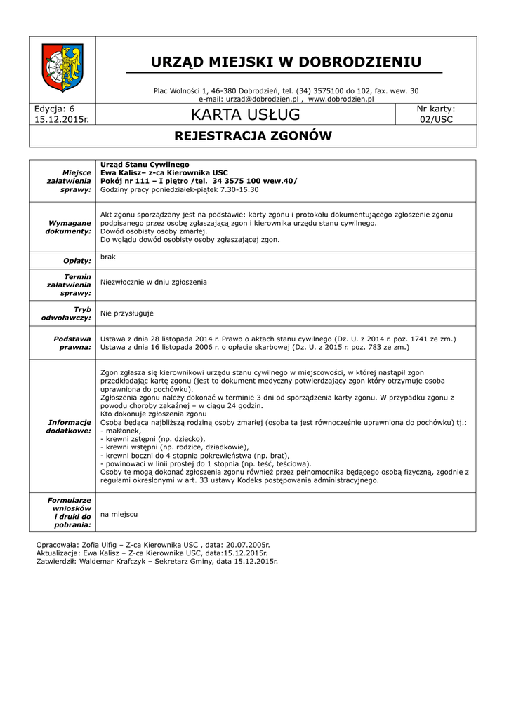 URZĄD MIEJSKI W DOBRODZIENIU Plac Wolności 1, 46-380 Dobrodzień, tel. (34) 3575100 do 102, fax. wew. 30 e-mail: [email protected] , www.dobrodzien.pl Edycja: 6 15.12.2015r. KARTA USŁUG Nr karty: 02/USC REJESTRACJA ZGONÓW Miejsce załatwienia sprawy: Wymagane dokumenty: Opłaty: Termin załatwienia sprawy: Tryb odwoławczy: Podstawa prawna: Urząd Stanu Cywilnego Ewa Kalisz– z-ca Kierownika USC Pokój nr 111 – I piętro /tel. 34 3575 100 wew.40/ Godziny pracy poniedziałek-piątek 7.30-15.30 Akt zgonu sporządzany jest na podstawie: karty zgonu i protokołu dokumentującego zgłoszenie zgonu podpisanego przez osobę zgłaszającą zgon i kierownika urzędu stanu cywilnego. Dowód osobisty osoby zmarłej. Do wglądu dowód osobisty osoby zgłaszającej zgon. brak Niezwłocznie w dniu zgłoszenia Nie przysługuje Ustawa z dnia 28 listopada 2014 r. Prawo o aktach stanu cywilnego (Dz. U. z 2014 r. poz. 1741 ze zm.) Ustawa z dnia 16 listopada 2006 r. o opłacie skarbowej (Dz. U. z 2015 r. poz. 783 ze zm.) Informacje dodatkowe: Zgon zgłasza się kierownikowi urzędu stanu cywilnego w miejscowości, w której nastąpił zgon przedkładając kartę zgonu (jest to dokument medyczny potwierdzający zgon który otrzymuje osoba uprawniona do pochówku). Zgłoszenia zgonu należy dokonać w terminie 3 dni od sporządzenia karty zgonu. W przypadku zgonu z powodu choroby zakaźnej – w ciągu 24 godzin. Kto dokonuje zgłoszenia zgonu Osoba będąca najbliższą rodziną osoby zmarłej (osoba ta jest równocześnie uprawniona do pochówku) tj.: - małżonek, - krewni zstępni (np. dziecko), - krewni wstępni (np. rodzice, dziadkowie), - krewni boczni do 4 stopnia pokrewieństwa (np. brat), - powinowaci w linii prostej do 1 stopnia (np. teść, teściowa). Osoby te mogą dokonać zgłoszenia zgonu również przez pełnomocnika będącego osobą fizyczną, zgodnie z regułami określonymi w art. 33 ustawy Kodeks postępowania administracyjnego. Formularze wniosków i druki do pobrania: na miejscu Opracowała: Zofia Ulfig – Z-ca Kierownika USC , data: 20.07.2005r. Aktualizacja: Ewa Kalisz – Z-ca Kierownika USC, data:15.12.2015r. Zatwierdził: Waldemar Krafczyk – Sekretarz Gminy, data 15.12.2015r.