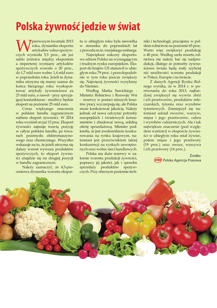 Polska żywność jedzie w świat W pierwszym kwartale 2015 roku, dynamika eksportu artykułów rolno-spożywczych wyniosła 5,5 proc., ale już saldo (różnica między eksportem a importem) wymiany artykułów spożywczych wzrosło o 20 proc., do 1,7 mld euro wobec 1,4 mld euro w poprzednim roku. Jeżeli ta dynamika utrzyma się mamy szanse do końca bieżącego roku wyeksportować artykuły żywnościowe za 23 mld euro, a nawet - przy sprzyjającej koniunkturze - możliwy będzie eksport na poziomie 25 mld euro. Coraz większego znaczenia w polskim handlu zagranicznym nabiera eksport żywności. W 2014 roku wyniósł on już 13 proc. Eksport żywności zajmuje trzecią pozycję w całym polskim handlu, po towarach przemysłu elektromaszynowego oraz chemicznego. Wszystko wskazuje na to, że jeżeli utrzyma się dalszy wzrost wywozu produktów spożywczych, to eksport żywności znajdzie się na drugiej pozycji w handlu zagranicznym. Należy zaznaczyć, że 4,5-procentowa dynamika wzrostu ekspor- tu w ubiegłym roku była niewielka w stosunku do poprzednich lat z powodu m.in. rosyjskiego embarga. Największe sukcesy eksportowe odnosi Polska na wymagającym i trudnym rynku europejskim. Eksport do krajów UE stanowił w ubiegłym roku 79 proc. i prawdopodobnie w tym roku jeszcze zwiększy się. Najwięcej żywności wysyłamy do Niemiec. Według Marka Sawickiego Ministra Rolnictwa i Rozwoju Wsi - rezerwy w postaci niższych kosztów pracy wyczerpują się, ale Polska może konkurować jakością. Należy jednak od nowa odczytać potrzeby europejskich i światowych konsumentów i zbudować nową, solidną ofertę sprzedażową. Minister podkreśla, że jest zwolennikiem konkurowania na rynku krajowym, natomiast jest przeciwnikiem takiej konkurencji na rynkach zewnętrznych oraz wobec sieci handlowych. Polska ma duże rezerwy w zakresie wzrostu produkcji żywności, poprawy jej jakości, jak i sposobu sprzedaży produktów spożywczych. Przy obecnym poziomie tech- niki i technologii, pracujemy w polskim rolnictwie na poziomie 65 proc. Warto więc zwiększyć produkcję o 40 proc. Według szefa resortu rolnictwa nie należy bać się nadprodukcji, dlatego że potrzeby żywnościowe świata będą rosły szybciej niż możliwości wzrostu produkcji w Polsce, Europie i na świecie. Z danych Agencji Rynku Rolnego wynika, że w 2014 r. w porównaniu do roku 2013, najbardziej zwiększył się wywóz zbóż i ich przetworów, produktów mleczarskich, tytoniu oraz wyrobów tytoniowych. Zmniejszył się natomiast udział owoców, warzyw, mięsa i jego przetworów, cukru i wyrobów cukierniczych. Ale i tak największe znaczenie (pod względem wartości) w eksporcie żywności w ubiegłym roku miał żywiec, potem mięso i jego przetwory (19 proc.) oraz owoce, warzywa i ich przetwory (14 proc.). Źródło: Polska Agencja Prasowa 1