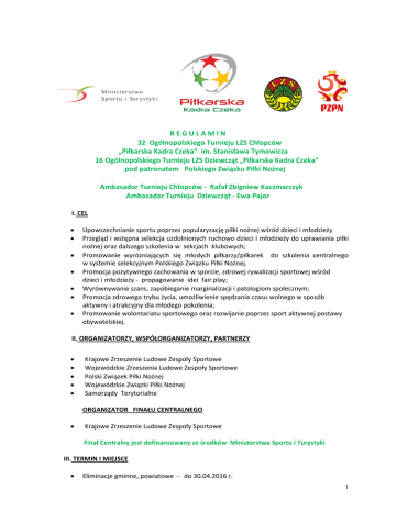 REGULAMIN 32 Ogólnopolskiego Turnieju LZS Chłopców „Piłkarska Kadra Czeka” im. Stanisława Tymowicza 16 Ogólnopolskiego Turnieju LZS Dziewcząt „Piłkarska Kadra Czeka” pod patronatem Polskiego Związku Piłki Nożnej Ambasador Turnieju Chłopców - Rafał Zbigniew Kaczmarczyk Ambasador Turnieju Dziewcząt - Ewa Pajor I. CEL Upowszechnianie sportu poprzez popularyzację piłki nożnej wśród dzieci i młodzieży Przegląd i wstępna selekcja uzdolnionych ruchowo dzieci i młodzieży do uprawiania piłki nożnej oraz dalszego szkolenia w sekcjach klubowych; Promowanie wyróżniających się młodych piłkarzy/piłkarek do szkolenia centralnego w systemie selekcyjnym Polskiego Związku Piłki Nożnej. Promocja pozytywnego zachowania w sporcie, zdrowej rywalizacji sportowej wśród dzieci i młodzieży - propagowanie idei fair play; Wyrównywanie szans, zapobieganie marginalizacji i patologiom społecznym; Promocja zdrowego trybu życia, umożliwienie spędzania czasu wolnego w sposób aktywny i atrakcyjny dla młodego pokolenia; Promowanie wolontariatu sportowego oraz rozwijanie poprzez sport aktywnej postawy obywatelskiej. II. ORGANIZATORZY, WSPÓŁORGANIZATORZY, PARTNERZY Krajowe Zrzeszenie Ludowe Zespoły Sportowe Wojewódzkie Zrzeszenia Ludowe Zespoły Sportowe Polski Związek Piłki Nożnej Wojewódzkie Związki Piłki Nożnej Samorządy Terytorialne ORGANIZATOR FINAŁU CENTRALNEGO Krajowe Zrzeszenie Ludowe Zespoły Sportowe Finał Centralny jest dofinansowany ze środków Ministerstwa Sportu i Turystyki III. TERMIN I MIEJSCE Eliminacje gminne, powiatowe - do 30.04.2016 r. 1 Finały wojewódzkie - do 24.06.2016 r. Finały Centralne: - chłopców w terminie 8 -14.08. 2016r., Słubice, woj. lubuskie. - dziewcząt w terminie 15-21.08. 2016r., Zamość, woj. lubelskie. IV. UCZESTNICTWO 1. W turnieju biorą udział drużyny w kategorii: chłopców: urodzonych w 2001r. i młodsi dziewcząt: urodzonych w 2001r. i młodsze. Do startu w obu ww. kategoriach mają prawo drużyny: a. z klubów Zrzeszenia LZS b. reprezentacje szkół złożone z uczniów danej szkoły będących członkami istniejącego w szkole LZS/ULKS z miejscowości do 20 tys. mieszkańców. 2. Lista imienna może liczyć maksymalnie 24 zawodników/czek i powinna być potwierdzona przez zgłaszającą jednostkę organizacyjną. Skład osobowy drużyn uczestniczących w turnieju nie może być zmieniony do rozgrywek wojewódzkich. Do finału centralnego w wyłonionej drużynie można wymienić 2 zawodników na zawodników z wszystkich drużyn uczestniczących w rozgrywkach wojewódzkich. Podczas turnieju na wszystkich szczeblach rozgrywek lista zgłoszonych do gry zawodników liczy 16 osób. 3. Wymagana dokumentacja do weryfikacji: aktualne legitymacje szkolne legitymacje LZS z opłaconymi składkami aktualne badania lekarskie karty sztywne z przynależnością klubową lub zaświadczenia z ZPN, wydruk z Extranet ubezpieczenie od nnw. V.ZAŁOŻENIA ORGANIZACYJNE 1.Organizatorami i koordynatorami turniejów eliminacyjnych są WZ LZS, organizatorem finału centralnego jest Krajowe Zrzeszenie LZS. 2.Organizatorzy poszczególnych etapów rozgrywek mają obowiązek dostarczenia zainteresowanym komunikatu organizacyjnego określającego miejsce, termin i inne dane informacyjne na minimum 14 dni przed rozpoczęciem zawodów oraz komunikatu końcowego po zakończeniu zawodów. 3. WZ LZS zobowiązane są przesłać do Krajowego Zrzeszenia LZS komunikaty oraz protokoły (kserokopie) z przeprowadzonych rozgrywek turniejów wojewódzkich bezpośrednio po ich zakończeniu. Zgłoszenie do Finału odbywa się na podstawie przesłanego do Krajowego Zrzeszenia LZS formularza według wzoru na załączniku nr 1 ( dziewczęta) i nr 2 (chłopcy) w terminie do 15.07.2016r. 4.Zabezpieczenie techniczne przygotowania zawodów (boiska, szatnie, protokoły sędziowskie, napoje) oraz obsady sędziowskiej i medycznej należy do bezpośredniego organizatora zawodów. 5. Promocję i reklamę rozgrywek w ramach turnieju „Piłkarska Kadra Czeka” prowadzą organizatorzy i współorganizatorzy oraz sponsorzy na wszystkich szczeblach rozgrywek. VI. SPRAWY FINANSOWE 2 1. Do szczebla eliminacji wojewódzkich wszelkie koszty ponoszą uczestnicy i organizatorzy, współorganizatorzy, sponsorzy. 2. Koszty organizacji, wyżywienia i zakwaterowania uczestników: 18 osób podczas Finału Centralnego w miarę możliwości pokrywa Krajowe Zrzeszenie LZS. Inne koszty, w tym wpisowego w wysokości 45 zł za I etap i 45 zł za II etap pokrywają uczestnicy. VII.REGULAMIN ROZGRYWEK W rozgrywkach obowiązują przepisy i postanowienia wydane przez PZPN dla kategorii juniora młodszego oraz ustalenia zawarte w niniejszym regulaminie. 1. Czas gry – w finale centralnym: 2 x 40 minut (lub krócej) z 10 minutową przerwą. Na pozostałych szczeblach rozgrywek system i czas rozgrywek ustala bezpośredni organizator w porozumieniu z Wojewódzkim Zrzeszeniem LZS. 2. Ubiór: stroje (koszulka, spodenki, getry) jednolite dla całej drużyny, obuwie piłkarskie z wyłączeniem wkrętów, obowiązkowe ochraniacze piłkarskie, zgodnie z przepisami PZPN. 3. Boisko - zgodnie z przepisami PZPN zweryfikowane przez lokalny PZPN. W przypadku braku weryfikacji decyzję podejmuje sędzia zawodów z uwagi na bezpieczeństwo uczestników. 4. Piłki: nożne nr 5. 5. Ilość zmian: 7 – na szczeblu Finału Centralnego, 7 – na pozostałych szczeblach rozgrywek, w tym bramkarza (nie ma zmian powrotnych). 6. Kary: wychowawcze – 3, 5, 10 minut oraz wykluczenie w meczu w przypadku otrzymania czerwonej kartki. Otrzymanie czerwonej kartki wyklucza zawodnika z udziału w kolejnym meczu na danym szczeblu rozgrywek. Wybitnie niesportowe zachowania będą rozpatrywane indywidualnie przez organizatorów. 7. Punktacja: a/ za zwycięstwo - 3 punkty b/ za remis - 1 punkt c/ za przegraną - 0 punktów Kolejność drużyn na wszystkich etapach rozgrywek ustala się wg następujących zasad: a/ li