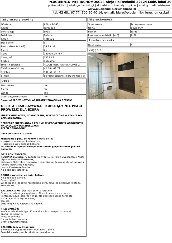 PŁUCIENNIK NIERUCHOMOŚCI | Aleja Politechniki 22/24 Łódź, lokal 201 pośrednictwo | obsługa transakcji | doradztwo | kredyty | opinie | analizy | administrowani _______________ www.pluciennik-nieruchomosci.pl _______________ tel. 42 681 67 77, 500 60 40 14, e-mail: [email protected] Informacje ogólne Nieruchomość Oferta nr ABL-MS-6451 Stan lokalu Do wprowadzenia Rodzaj sprzedaż Okna nowe PCV Lokalizacja Łódź Balkon taras Dzielnica Polesie Powierzchnia działki [m2] 0.00 Rejon Retkinia Ilość pokoi 1 Pow. całkowita [m2] 34.79 m² Piętro 2p Cena 220000.00 PLN Cena/m2 6323.66 Status aktualna Imię i nazwisko PŁUCIENNIK NIERUCHOMOŚCI Telefon komórkowy 42 681 67 77 Telefon 500 60 40 14 E-mail [email protected] Opis Plac zabaw nie Alarm nie Winda tak Drzwi antywłamaniowe nie Sprzedaż M-3 W NOWYM APARTAMENTOWCU NA RETKINI OFERTA EKSKLUZYWNA - KUPUJĄCY NIE PŁACI PROWIZJI DLA BIURA MIESZKANIE NOWE, NOWOCZESNE, WYKOŃCZONE W STANIE DO ZAMIESZKANIA. SPRZEDAŻ MIESZKANIA Z PEŁNYM WYPOSAŻENIEM WIDOCZNYM NA ZAŁĄCZONYCH ZDJĘCIACH. TEREN OGRODZONY Cena ofertowa 220.000zł Mieszkanie o pow. 34,79mkw składa się z; - pokoju z aneksem kuchennym, - łazienki z wc i dużego balkonu. Do mieszkania przynależy pomieszczenie gospodarcze w postaci komórki. OPIS POMIESZCZEŃ: KUCHNIA z oknem: w zabudowie typu Euro. Pełne wyposażenie AGD: płyta indukcyjna Elektrolux, piekarnik Elektrolux,lLodówka z zamrażarką Samsung dwudrzwiowa z funkcją nalewania napojów, pralka Elektrolux Inspire, Na podłodze terakota. POKÓJ z wyjściem na duży balkon: Na podłodze panele. Ściany gładź. Wyposażenie pokoju: rozkładana sofa, ława ze szklanym blatem, komoda rtv, TV ŁAZIENKA z WC: posiada okno z roletami Ściany wyłożone jasną glazurą. Nisze i dekory w ciemnym kontrastującym kolorze venge. Na podłodze jasna terakota. szklana kabina prysznicowa, toaleta, duża umywalka wsparta na szafce. PRZEDPOKÓJ: szafa w zabudowie typu Komandor z lustrzanymi drzwiami, szafka na obuwie, wieszak ścienny Na podłodze terakota. Drzwi antywłamaniowe. BALKON: duży w kwadracie. Sprzedaż z wyposażeniem- huśtawka i stolik. Posadzka wyłożona terakota mrozoodporną. Pomieszczenia Ilość pokoi Zdjęcia 1 Klientom chcemy poświęcać odpowiednią ilość czasu, prosimy o umawianie spotkań. PŁUCIENNIK NIERUCHOMOŚCI | Aleja Politechniki 22/24 Łódź, lokal 201 pośrednictwo | obsługa transakcji | doradztwo | kredyty | opinie | analizy | administrowani _______________ www.pluciennik-nieruchomosci.pl _______________ tel. 42 681 67 77, 500 60 40 14, [email protected]