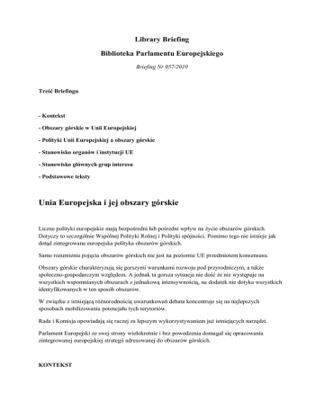 Library Briefing Biblioteka Parlamentu Europejskiego Briefing Nr 057/2010 Treść Briefingu - Kontekst - Obszary górskie w Unii Europejskiej - Polityki Unii Europejskiej a obszary górskie - Stanowisko organów i instytucji UE - Stanowisko głównych grup interesu - Podstawowe teksty Unia Europejska i jej obszary górskie Liczne polityki europejskie mają bezpośredni lub pośredni wpływ na życie obszarów górskich. Dotyczy to szczególnie Wspólnej Polityki Rolnej i Polityki spójności. Pomimo tego nie istnieje jak dotąd zintegrowana europejska polityka obszarów górskich. Samo rozumienie pojęcia obszarów górskich nie jest na poziomie UE przedmiotem konsensusu. Obszary górskie charakteryzują się gorszymi warunkami rozwoju pod przyrodniczym, a także społeczno-gospodarczym względem. A jednak ta gorsza sytuacja nie dość że nie występuje na wszystkich wspomnianych obszarach z jednakową intensywnością, na dodatek nie dotyka wszystkich identyfikowanych w ten sposób obszarów. W związku z istniejącą różnorodnością uwarunkowań debata koncentruje się na najlepszych sposobach mobilizowania potencjału tych terytoriów. Rada i Komisja opowiadają się raczej za lepszym wykorzystywaniem już istniejących narzędzi. Parlament Europejski ze swej strony wielokrotnie i bez powodzenia domagał się opracowania zintegrowanej europejskiej strategii adresowanej do obszarów górskich. KONTEKST Traktat Lizboński po raz pierwszy wprowadził odniesienie do terenów górskich do pierwotnego prawa UE: „Wśród regionów, o których mowa, szczególną uwagę poświęca się obszarom (…), które cierpią na skutek poważnych i trwałych niekorzystnych warunków przyrodniczych lub demograficznych, takim jak (…)regiony (…) górskie.” (Art. 174 TFUE). Traktat ten czyni także ze spójności terytorialnej główny cel polityczny UE (Artykuł 3 TUE). Agenda terytorialna UE1 na lata 2007-2011 podkreśla z kolei, że należy mobilizować potencjał ogółu tych obszarów, aby sprzyjać ich trwałemu wzrostowi gospodarczemu oraz tworzeniu miejsc pracy, tak jak zakłada to Strategia Lizbońska. Jednym z trzech priorytetów Strategii Europa 20202, która zostanie formalnie przyjęta przez Radę Europejską w czerwcu br., jest przy tym wzrost sprzyjający włączeniu społecznemu, a co za tym idzie, spójności terytorialnej. Niedawno przyjęta Zielona Księga w sprawie spójności terytorialnej3 (2008) stanowi ponadto zaproszenie do debaty nad zasadnością tworzenia specyficznych polityk obejmujących regiony o szczególnych cechach geograficznych, do których zalicza się obszary górskie. Europejska polityka obszarów górskich nie istnieje. A jednak liczne polityki UE mają wpływ na życie obszarów wiejskich. W ostatnim dziesięcioleciu , szczególnie ożywioną debatę na temat sposobów, w jakie UE powinna interweniować w regionach górskich, prowadzi się w Parlamencie Europejskim. Kwestie te pozostają w centrum refleksji nad przyszłością Wspólnej Polityki Rolnej (PAC) oraz Polityki spójności po 2013 roku. OBSZARY GÓRSKIE W UE Kłopoty z definicją Pojęcie „obszary górskie” nie jest tak łatwe do jednoznacznego zdefiniowania, jak się wydaje. Góry to zarazem rzeczywistość w sensie fizycznym i pojęcie względne o charakterze kulturowym. Im bardziej dany Kraj Członkowski UE jest górzysty, w tym większym stopniu jego pojmowanie tego, co stanowi „obszar górzysty” będzie miało restrykcyjny charakter. Dlatego właśnie w chwili obecnej w UE nie ma ustalonych jednolitych kryteriów definiowania kwalifikowalnych obszarów górskich. Niezależnie od tego, w Rozporządzeniu Rady nr 1257/994 dotyczącym wsparcia rozwoju wsi Wspólna Polityka Rolna dostarcza ogólnych kryteriów służących ich identyfikacji5. Kryteria te związane są z 1 http://www.eu-territorial-agenda.eu/Reference%20Documents/Territorial-Agenda-of-the-European-UnionAgreed-on-25-May-2007.pdf 2 http://ec.europa.eu/eu2020/index_fr.htm 3 http://ec.europa.eu/regional_policy/consultation/terco/paper_terco_fr.pdf 4 http://eur-lex.europa.eu/LexUriServ/LexUriServ.do?uri=CELEX:31999R1257:FR:HTML 5 Tereny górskie to takie, które charakteryzują się znacznymi ograniczeniami możliwości użytkowania ziemi i znacznym wzrostem kosztów pracy w związku z istnieniem z powodu wysokości, trudnych warunków klimatycznych, co skutkuje skróceniem okresu wegetacji, występowaniem, na niższych wysokościach, stromych pochyłości obejmujących większą część terenów uprawnych, uniemożliwiających użytkowanie normalnych warunkami wywierającymi wpływ na działalność rolniczą (klimat, wysokość nad poziomem morza, itp.). Każdy Kraj Członkowski odwołuje się do tych europejskich kryteriów, by wyznaczać granice własnych obszarów górskich. W 2004 roku analiza Nordregio6 wykonana na zlecenie Komisji Europejskiej ustaliła granice obszarów górskich UE w skali gmin (por. mapa w załączniku). Oprócz tego, w Zielonej Księdze w sprawie spójności terytorialnej, dany region uznawany jest za górski, jeśli co najmniej 50% jego mieszkańców żyje na terenach „górskich” zgodnie z granicami wytyczonymi w analizie Nordregio7. Niedawno powstały dokument roboczy Komisji (2009) stosuje to samo kryterium ludnościowe. Podejście polegające na posługiwaniu się pojęciem „masywu”8 uwzględnia szerszy, względnie spójny rejon, obejmujący nie tylko obszar gór ale również doliny i tereny podgórskie. PORTRET OBSZARÓW GÓRSKICH 21 Państw Członkowskich ma na swym terytorium regiony górskie spełniające kryteria podane w analizie Nordregio (to jest wszystkie poza Danią, Maltą, Republikami Bałtyckimi i Holandią). Według studium Nordregio, regiony górskie w UE obejmują obszar 1 564 000 km2 i są zamieszkane przez 85 300 000 mieszkańców (17,8% całej populacji UE). Proporcja tego terytorium wynosi jedynie 8% według kryteriów zastosowanych w dokumencie roboczym Komisji