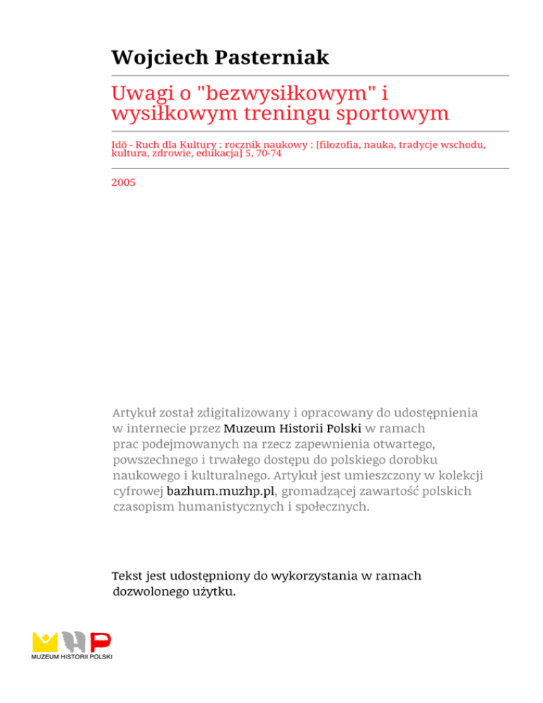 Wojciech Pasterniak Uwagi o "bezwysiłkowym" i wysiłkowym treningu sportowym Idō - Ruch dla Kultury : rocznik naukowy : [filozofia, nauka, tradycje wschodu, kultura, zdrowie, edukacja] 5, 70-74 2005 Prof. zw. dr hab. W ojciech P astem iak podejm uje tem at treningu sportow ego n a gru n cie podejścia sy stem o w eg o holistycznego i w oparciu o w łasne dośw iadczenie praktyczne. Problem je s t intrygujący i niech będzie w stępem do dyskusji o duchow ym w ym iarze przygotow ania startow ego sportow ca lub też w pływ ie czynników d u chow ych na stan je g o zdrow ia. W O JC IE C H P A S T E R N IA K U niw ersytet Zielonogórski Uwagi o „bezwysiłkowym ” i w ysiłkow ym treningu sportowym Słow a kluczowe: trening sportow y, trening bezw ysiłkow y, kontuzje fizyczne, psychiczne i duchow e, ocena przygotow ania startow ego zaw odnika Praw dopodobnie m iał rację Lew Szestow, gdy w sw ym znakom itym dziele D ostojew ski i Nietzsche m im ochodem zauw ażył, że „w głębinach myśli kryje się nierozerw alna sprzeczność” [Szestow 1987, s. 58]. I „sprzeczność tę, am biw alencję” odkryw am y także w tedy, gdy m yślim y 0 w yczynow ym treningu sportowym . Niewątpliwie wym aga on wysiłku, często - jak to się mówi - katorżniczego. W iemy, że niektó rych trenerów - przykładem najczęściej wymienianym może być Hubert W agner - nazywano wręcz „katami”, chociaż ich „wysiłkowa” praca owocowała największymi sukcesami sportowymi. A le - z drugiej strony - w ydaje się, że trening sportow y pow inien być w ręcz „bezw ysiłkow y” , który to term in opatruję cudzysłow em , albow iem jakaś absolutna bezw ysiłkow ość w treningu sportow ym je st - oczyw iście - niem ożliwa. Tak ja k nie m a jakiegoś niczym nie ograniczonego, najw yższego wysiłku, tak też nie istnieje jak iś absolutny bezwysiłek. M am y tu do czynienia z tz w . continuum , z dw om a biegunam i tego sam ego procesu. Zdecydow anie w ym agają one racjonalnego uw zględnienia w sportow ym treningu i zrów now ażenia. Przetrenow anie sportow ca jest równie groźne co jeg o niedotrenow anie. Toteż rzeczą niezbędną, naw et przed i po każdym treningu, je st pom iar w ytrenow ania (poziom u) różnych dyspozycji fizycznych, psychicznych 1 duchow ych, bądź pom iar bardziej ogólny, globalnie obejm ujący poziom przygotow ania fizycznego, psychicznego i duchowego. W ykonanie tego zadania tzw. metodami naukowymi jest - w krótkim czasie - bardzo trudne, a na wet niemożliwe. W yręczyć się tu można badaniami radiestezyjnymi, o których niżej szerzej napiszę. W ym iary treningu „bezw ysilkow ego” Jak identyfikow ać i m aksym alizow ać trening „bezw ysiłkow y”? O dpow iedź na to pytanie je st tylko częściow o możliwa. M ożemy m ianowicie w skazać tylko na pewne ogólne wym iary trenin gu bezw ysilkow ego, w iedząc jednocześnie, że ma on przede w szystkim wym iary indywidualne, zdeterm inow ane potencjałem fizycznym , psychicznym i duchow ym każdego sportow ca oraz sytuacją, najszerzej pojętą, w jakiej się znajduje. Chodzi tu zarów no o dyscyplinę sportow ą, ja k też aktualne przeżycia, m yśli, uczucia, przekonania, sam oocenę w ydolności psychicznej, fizycznej i duchowej itp., itd. Jeden czynnik wydaje się tu niesłychanie ważny: sam oocena m ożliwości perfekcyjnego w ykonania zadań startowych. Do najogólniejszych w ym iarów treningu „bezw ysilkow ego” należą czynności zew nętrzne i w ew nętrzne redukujące zm ęczenie, czynniki sprzyjające ekonom izacji w ysiłku sportow ego, przeżycia m otyw acyjne i inne, w tym katharktyczne, będące następstw em „treningow ej” dobrej roboty - ja k m ów ił T. K otarbiński - oraz szczególnego obcow ania z „oczyszczającym ” pięknem ruchu i głębszej percepcji św iata i własnej osoby. T rening powinien być radosny, atrakcyjny, urozm aicony, a tym sam ym redukujący zm ęcze nie, m onotonię, w ręcz nudę. Powinien być także ekonom iczny, to znaczy w ten sposób celowy, w ydajny i oszczędny - by, jak m ówi prakseologia, nie angażow ał zbędnie energii fizycznych, psychicznych i duchowych. Taki trening m oże być nazwany „treningiem kota” , gdyż to w łaśnie zw ierzę porusza się bezw ysiłkow o niem al, a w sw ych ruchach je st niezwykle sprawne. W treningu „bezw ysiłkow ym ” obow iązuje zasada pełnego zaufania do w łasnego organizm u i - tak na przykład u joginów - zdolność pełnego nad nim panowania. Zaw odnik przechodzi 70 wtedy - ja k to m iędzy innymi pokazują badania K. W ilbera, w w yższy stan św iadom ości zwany św iadom ością centaura [por.: W ilber 1996]. N ie idzie tu jednak - j a k u w ym ienionego badacza 0 oddzielenie ciała od ego, lecz o zjednoczenie w szystkich pierw iastków człow ieka, co stanowi zapow iedź uzyskania najw yższej św iadom ości. T rening „bezw ysiłkow y” m a sw oje tajem nice związane z relacją m iędzy zaw odnikiem a tre nerem. Jest ona przejaw em czegoś więcej niż zaufanie, w kracza w tajem nicę jedności dw u osób 1 m ożliw ości pozytyw nego energetycznego oddziaływ ania, naw et na odległość. K ontuzje fizyczne, psychiczne i duchowe Określona wyżej relacja Je d n o śc i”, wymagająca niewątpliwie oddzielnych badań, umożliwia trenerowi leczenie - w sensie dosłownym i przenośnym - różnych blokad i kontuzji zawodnika, co wydaje się trudne do uwierzenia, a jednak faktycznie istnieje. Dw a lata opiekowałem się zawod nikami ekstraligowej drużyny zielonogórskich pingpongistów, ponad dwa lata współpracowałem (trening to przede wszystkim współpraca) i współpracuję z czołowymi polskimi tenisistami: Radosławem Nijakim, a głównie z Jakubem Nijakim, sporadycznie z żużlowcami (Huszcza, Kasprowiak), piłkarzami, siatkarzami i innymi sportowcami. Ku ich zdumieniu - wspierając się na badaniach LeShana, medycynie Dalekiego Wschodu, doświadczeniach my