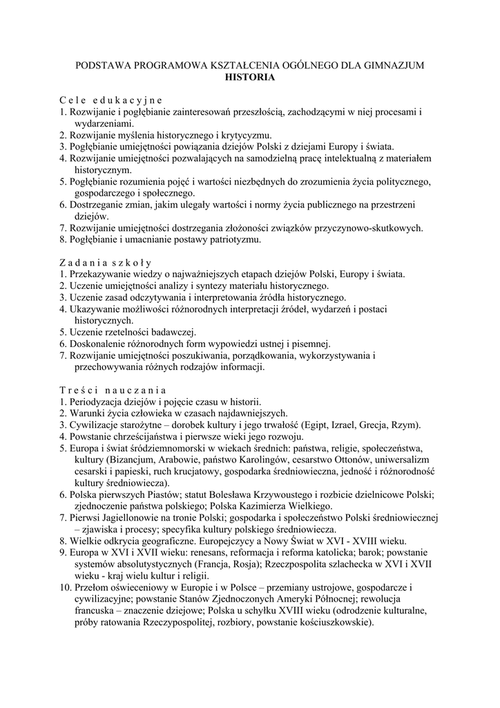 PODSTAWA PROGRAMOWA KSZTAŁCENIA OGÓLNEGO DLA GIMNAZJUM HISTORIA Cele edukacyjne 1. Rozwijanie i pogłębianie zainteresowań przeszłością, zachodzącymi w niej procesami i wydarzeniami. 2. Rozwijanie myślenia historycznego i krytycyzmu. 3. Pogłębianie umiejętności powiązania dziejów Polski z dziejami Europy i świata. 4. Rozwijanie umiejętności pozwalających na samodzielną pracę intelektualną z materiałem historycznym. 5. Pogłębianie rozumienia pojęć i wartości niezbędnych do zrozumienia życia politycznego, gospodarczego i społecznego. 6. Dostrzeganie zmian, jakim ulegały wartości i normy życia publicznego na przestrzeni dziejów. 7. Rozwijanie umiejętności dostrzegania złożoności związków przyczynowo-skutkowych. 8. Pogłębianie i umacnianie postawy patriotyzmu. Zadania szkoły 1. Przekazywanie wiedzy o najważniejszych etapach dziejów Polski, Europy i świata. 2. Uczenie umiejętności analizy i syntezy materiału historycznego. 3. Uczenie zasad odczytywania i interpretowania źródła historycznego. 4. Ukazywanie możliwości różnorodnych interpretacji źródeł, wydarzeń i postaci historycznych. 5. Uczenie rzetelności badawczej. 6. Doskonalenie różnorodnych form wypowiedzi ustnej i pisemnej. 7. Rozwijanie umiejętności poszukiwania, porządkowania, wykorzystywania i przechowywania różnych rodzajów informacji. Treści nauczania 1. Periodyzacja dziejów i pojęcie czasu w historii. 2. Warunki życia człowieka w czasach najdawniejszych. 3. Cywilizacje starożytne – dorobek kultury i jego trwałość (Egipt, Izrael, Grecja, Rzym). 4. Powstanie chrześcijaństwa i pierwsze wieki jego rozwoju. 5. Europa i świat śródziemnomorski w wiekach średnich: państwa, religie, społeczeństwa, kultury (Bizancjum, Arabowie, państwo Karolingów, cesarstwo Ottonów, uniwersalizm cesarski i papieski, ruch krucjatowy, gospodarka średniowieczna, jedność i różnorodność kultury średniowiecza). 6. Polska pierwszych Piastów; statut Bolesława Krzywoustego i rozbicie dzielnicowe Polski; zjednoczenie państwa polskiego; Polska Kazimierza Wielkiego. 7. Pierwsi Jagiellonowie na tronie Polski; gospodarka i społeczeństwo Polski średniowiecznej – zjawiska i procesy; specyfika kultury polskiego średniowiecza. 8. Wielkie odkrycia geograficzne. Europejczycy a Nowy Świat w XVI - XVIII wieku. 9. Europa w XVI i XVII wieku: renesans, reformacja i reforma katolicka; barok; powstanie systemów absolutystycznych (Francja, Rosja); Rzeczpospolita szlachecka w XVI i XVII wieku - kraj wielu kultur i religii. 10. Przełom oświeceniowy w Europie i w Polsce – przemiany ustrojowe, gospodarcze i cywilizacyjne; powstanie Stanów Zjednoczonych Ameryki Północnej; rewolucja francuska – znaczenie dziejowe; Polska u schyłku XVIII wieku (odrodzenie kulturalne, próby ratowania Rzeczypospolitej, rozbiory, powstanie kościuszkowskie). 11. Przemiany społeczne i cywilizacyjne XIX wieku: epoka napoleońska; tworzenie podstaw nowoczesnej demokracji w Europie i Ameryce Północnej; przemiany na mapie politycznej Europy i świata; kolonializm; rozwój ekonomiczny i społeczny w XIX wieku. 12. Losy i postawy Polaków w warunkach braku niepodległości: powstania narodowe, koncepcje pracy organicznej, losy Polaków na emigracji. 13. I wojna światowa; rewolucje rosyjskie. 14. Świat między wojnami: kryzys demokracji (systemy totalitarne, hitleryzm i komunizm); najistotniejsze problemy gospodarcze, społeczne i polityczne świata. 15. Odrodzone państwo polskie: budowa państwowości, walka o granice; ewolucja ustrojowa; główne problemy gospodarcze i społeczne; polityka zagraniczna i miejsce Polski w Europie międzywojennej. 16. II wojna światowa; pakt Ribbentrop - Mołotow i jego realizacja, momenty przełomowe wojny, budowa koalicji antyhitlerowskiej; eksterminacja narodów na terenach okupowanych; obozy koncentracyjne i łagry; Holocaust. 17. Polska w latach 1939-1945: dwie okupacje; Katyń; formy i miejsca walk o niepodległość polskie państwo podziemne; Powstanie Warszawskie; losy Polaków w kraju i na obczyźnie. 18. Świat powojenny; postęp cywilizacyjny, przemiany polityczne i kulturowe; konflikt Wschód-Zachód, nowe zjawiska polityczno-społeczne i przyspieszenie cywilizacyjne, dekolonizacja; nowe zjawiska w kulturze masowej. 19. Polska po 1945 roku: walka o kształt państwa, polski stalinizm; przemiany gospodarczospołeczne w Polskiej Rzeczypospolitej Ludowej; kryzysy polityczne lat 1956, 1968, 1970; wybór Polaka na papieża, rok 1980 i powstanie „Solidarności”, stan wojenny i lata osiemdziesiąte; przełom roku 1989, proces budowy III Rzeczypospolitej w oparciu o wartości demokratyczne i normy demokratycznego państwa prawa. Osiągnięcia 1. Rozpoznawanie miejsca człowieka w czasie historycznym, jego relacji z przyrodą, społecznością lokalną, ojczyzną, kręgiem kulturowym, innymi narodami i religiami. 2. Operowanie podstawowymi kategoriami historycznymi: czasem, przestrzenią, ciągłością, zmiennością. 3. Wykorzystywanie podstawowej wiedzy o najważniejszych etapach dziejów do powiązania zjawisk historycznych z zakresu dziejów powszechnych z historią Polski. 4. Ujmowanie treści historycznych w związkach przyczynowo-skutkowych. 5. Ocenianie faktów i wydarzeń historycznych. 6. Interpretacja różnego rodzaju źródeł historycznych. 7. Docieranie do różnych źródeł informacji historycznej, integracja wiedzy uzyskanej z różnych źródeł informacji.