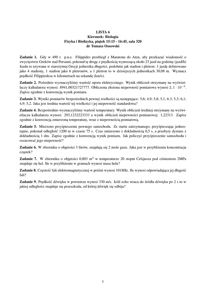 LISTA 6 Kierunek: Biologia Fizyka i Biofizyka, piatek ˛ 15:15 - 16:45, sala 320 dr Tomasz Ossowski Zadanie 1. Gdy w 490 r. p.n.e. Filippides przebiegł z Maratonu do Aten, aby przekazać wiadomość o zwyci˛estwie Greków nad Persami, pokonał t˛e drog˛e z pr˛edkościa˛ wynoszac ˛ a˛ około 23 jazd na godzin˛e (jazd/h) Jazda to używana w starożytnej Grecji jednostka długości, podobnie jak stadion i pletron: 1 jazd˛e defniowano jako 4 stadiony, 1 stadion jako 6 pletronów, a 1 pletron to w dzisiejszych jednostkach 30,08 m. Wyznacz pr˛edkość Filippiedesa w kilometrach na sekund˛e (km/s). Zadanie 2. Pośrednio wyznaczyliśmy wartość oporu elektrycznego. Wynik obliczeń otrzymany na wyświetlaczy kalkulatora wynosi: 8941,00321727777. Obliczona złożona niepewność pomiarowa wynosi 2, 1 · 10−3 . Zapisz zgodnie z konwencja˛ wynik pomiaru. Zadanie 3. Wyniki pomiarów bezpośrednich pewnej wielkości sa˛ nast˛epujace: ˛ 5,6; 4,9; 5,8; 5,1; 6.3; 5,3; 6,1; 4,9; 5,2. Jaka jest średnia wartość tej wielkości i jej niepewność standardowa? Zadanie 4. Bezpośrednio wyznaczyliśmy wartość temperatury. Wynik obliczeń średniej otrzymany na wyświetlaczu kalkulatora wynosi: 293,1232223333 a wynik obliczeń niepewności pomiarowej: 1,22313. Zapisz zgodnie z konwencja˛ zmierzona˛ temperatur˛e, wraz z niepewnościa˛ pomiarowa.˛ Zadanie 5. Mierzono przyśpieszenie pewnego samochodu. Ze startu zatrzymanego, przyśpieszajac ˛ jednostajnie, pokonał odległość 1200 m w czasie 75 s. Czas zmierzono z dokładnościa˛ 0,5 s, a przebyty dystans z dokładnościa˛ 1 dm. Zapisz zgodnie z konwencja˛ wynik pomiaru. Jak policzyć przyśpieszenie samochodu i oszacować jego niepewność? Zadanie 6. W zbiorniku o obj˛etości 3 litrów, znajduja˛ si˛e 2 mole gazu. Jaka jest w przybliżeniu koncentracja czastek? ˛ Zadanie 7. W zbiorniku o obj˛etości 0,003 m3 w temperaturze 20 stopni Celsjusza pod ciśnieniem 2MPa znajduje si˛e hel. Ile w przybliżeniu w gramach wynosi masa helu? Zadanie 8. Cz˛estość fali elektromagnetycznej w próżni wynosi 1018Hz. Ile wynosi odpowiadajaca ˛ jej długość fali? Zadanie 9. Pr˛edkość dźwi˛eku w powietrzu wynosi 330 m/s. Jeśli echo wraca do źródła dźwi˛eku po 2 s to w jakiej odległości znajduje si˛e przeszkoda, od której dźwi˛ek si˛e odbija? 1