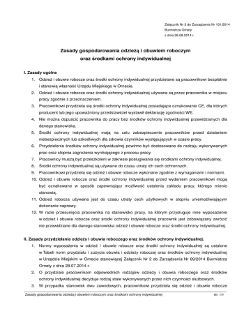 Załącznik Nr 3 do Zarządzenia Nr 101/2014 Burmistrza Ornety z dnia 26.08.2014 r. Zasady gospodarowania odzieŜą i obuwiem roboczym oraz środkami ochrony indywidualnej I. Zasady ogólne 1. OdzieŜ i obuwie robocze oraz środki ochrony indywidualnej przydzielane są pracownikowi bezpłatnie i stanowią własność Urzędu Miejskiego w Ornecie. 2. OdzieŜ i obuwie robocze oraz środki ochrony indywidualnej uŜywane są przez pracownika w miejscu pracy zgodnie z przeznaczeniem. 3. Pracownikowi przydziela się środki ochrony indywidualnej posiadające oznakowanie CE, dla których producent lub jego upowaŜniony przedstawiciel wystawił deklarację zgodności WE. 4. Nie moŜna dopuścić pracownika do pracy bez środków ochrony indywidualnej przewidzianych dla danego stanowiska. 5. Środki ochrony indywidualnej mają na celu zabezpieczenie pracowników przed działaniem niebezpiecznych lub szkodliwych dla zdrowia czynników występujących w czasie pracy. 6. Przydzielenie środków ochrony indywidualnej powinno być dostosowane do rodzaju wykonywanych prac oraz stopnia zagroŜenia wynikającego z procesu pracy. 7. Pracownicy muszą być przeszkoleni w zakresie posługiwania się środkami ochrony indywidualnej. 8. Środki ochrony indywidualnej są uŜywane do czasu utraty ich cech ochronnych. 9. Pracownikowi przydziela się odzieŜ i obuwie robocze wykonane zgodnie z wymaganiami i normami. 10. OdzieŜ i obuwie robocze oraz środki ochrony indywidualnej przed wydaniem pracownikowi mogą być oznakowane w sposób zapewniający moŜliwość ustalenia zakładu pracy, którego mienie stanowią. 11. OdzieŜ robocza uŜywana jest do czasu utraty cech uŜytkowych w stopniu uniemoŜliwiającym dokonanie naprawy. 12. W razie przesunięcia pracownika na stanowisko pracy, na którym przysługuje inne wyposaŜenie w odzieŜ i obuwie robocze oraz środki ochrony indywidualnej pracownik jest zobowiązany zwrócić nie przewidziane dla danego stanowiska odzieŜ i obuwie robocze oraz środki ochrony indywidualnej. II. Zasady przydzielania odzieŜy i obuwia roboczego oraz środków ochrony indywidualnej. 1. Normy wyposaŜenia w odzieŜ i obuwie robocze oraz środki ochrony indywidualnej są ustalone w Tabeli norm przydziału i zuŜycia obuwia i odzieŜy roboczej oraz środków ochrony indywidualnej w Urzędzie Miejskim w Ornecie stanowiącej Załącznik Nr 2 do Zarządzenia Nr 89/2014 Burmistrza Ornety z dnia 28.07.2014 r. 2. O przydziale pracownikom odpowiednich rodzajów odzieŜy i obuwia roboczego oraz środków ochrony indywidualnej decyduje rodzaj stale wykonywanych przez nich czynności słuŜbowych. 3. W przypadku stanowisk dwu zawodowych, pracownikowi przydziela się odzieŜ i obuwie robocze Zasady gospodarowania odzieŜą i obuwiem roboczym oraz środkami ochrony indywidualnej str. 1/4 oraz środki ochrony indywidualnej z korzystniejszej dla pracownika pozycji tabeli. 4. Okresy uŜywalności odzieŜy i obuwia roboczego oraz środków ochrony indywidualnej ustalone są w miesiącach kalendarzowych, natomiast odzieŜy zimowej w okresach zimowych. 5. Do rozliczeń przyjmuje się, Ŝe okres zimowy trwa 5 miesięcy, tj. od 1 listopada do 31 marca roku następnego. 6. Pracownicy po raz pierwszy podejmujący pracę zawodową nabywają uprawnienia do odzieŜy i obuwia roboczego z dniem przystąpienia do pracy. 7. Pracownikom zatrudnionym w niepełnym wymiarze czasu pracy, okres uŜywalności przydzielonej odzieŜy i obuwia roboczego oraz środków ochrony indywidualnej, naleŜy odpowiednio wydłuŜyć proporcjonalnie do czasu pracy. 8. Pracownik pobraną odzieŜ i obuwie robocze oraz sprzęt ochronny potwierdza własnoręcznym podpisem w wymaganych dokumentach. 9. Przy ustalaniu rzeczywistego czasu uŜywania odzieŜy i obuwia roboczego oraz środków ochrony indywidualnej uwzględnia się czas przepracowany wraz z urlopem wypoczynkowym i urlopem dodatkowym. 10. Nieobecność pracownika w pracy nieprzerwanie przez okres 30 dni, niezaleŜnie od przyczyn, które je spowodowały powoduje przedłuŜenie normatywnego okresu uŜywalności odzieŜy i obuwia roboczego oraz środków ochrony indywidualnej o okres nieobecności w pracy danego pracownika. 11. W razie utraty lub zniszczenia całości lub części odzieŜy i obuwia roboczego bez winy pracownika przed upływem okresu uŜywalności, pracownik otrzymuje brakujące przedmioty bezpłatnie. 12. Fakt zniszczenia odzieŜy i obuwia roboczego powinien być protokolarnie stwierdzony przez osobę odpowiedzialną za sprawy bezpieczeństwa i higieny pracy. 13. W razie rozwiązania stosunku pracy pracownik jest zobowiązany zwrócić zakładowi pracy odzieŜ i obuwie robocze oraz środki ochrony indywidualnej. 14. Pracownik moŜe przejąć na własność odzieŜ i obuwie robocze za wyjątkiem odzieŜy i obuwia skaŜonego bakteriologicznie lub substancjami szkodliwymi, ze zwrotem ustalonej wartości. Wartość tę zakład moŜe obniŜyć jeŜeli uzasadnia to rzeczywisty stopień zuŜycia rzeczy. 15. OdzieŜ i obuwie robocze nie podlega zwrotowi w razie: przejścia pracownika na emeryturę lub rentę; śmierci pracownika; uŜywanie tych przedmiotów przed rozwiązaniem stosunku pracy przez okres przekraczający 75% okresu uŜywalności określonego w tabeli norm przydziału. 16. OdzieŜ i obuwie robocze wydane do stałego indywidualnego uŜywania, którego po upływie okresu uŜywalności ustalonego w tabeli norm, zachowały cechy uŜytkowe, powinny być przez pracowników nadal uŜywane zgodnie z przeznaczeniem do czasu zuŜycia. 17. Konserwacja, naprawa, pranie odzieŜy roboczej odywa się na koszt zakładu pracy. 18. W razie niedostarczenia odzieŜy i obuwia roboczego przez pracodawcę, pracownikowi naleŜy się ekwiwalent za uŜywanie własnej odzieŜy. Ekwiwalent naleŜy się po okresie uŜywalności w wysokości ustalonej przez pracodawcę. Zasady gospodarowania odzieŜą i obuwiem roboczym oraz środkami ochrony indywidualnej str. 2/4 III. Obowiązki pracownik