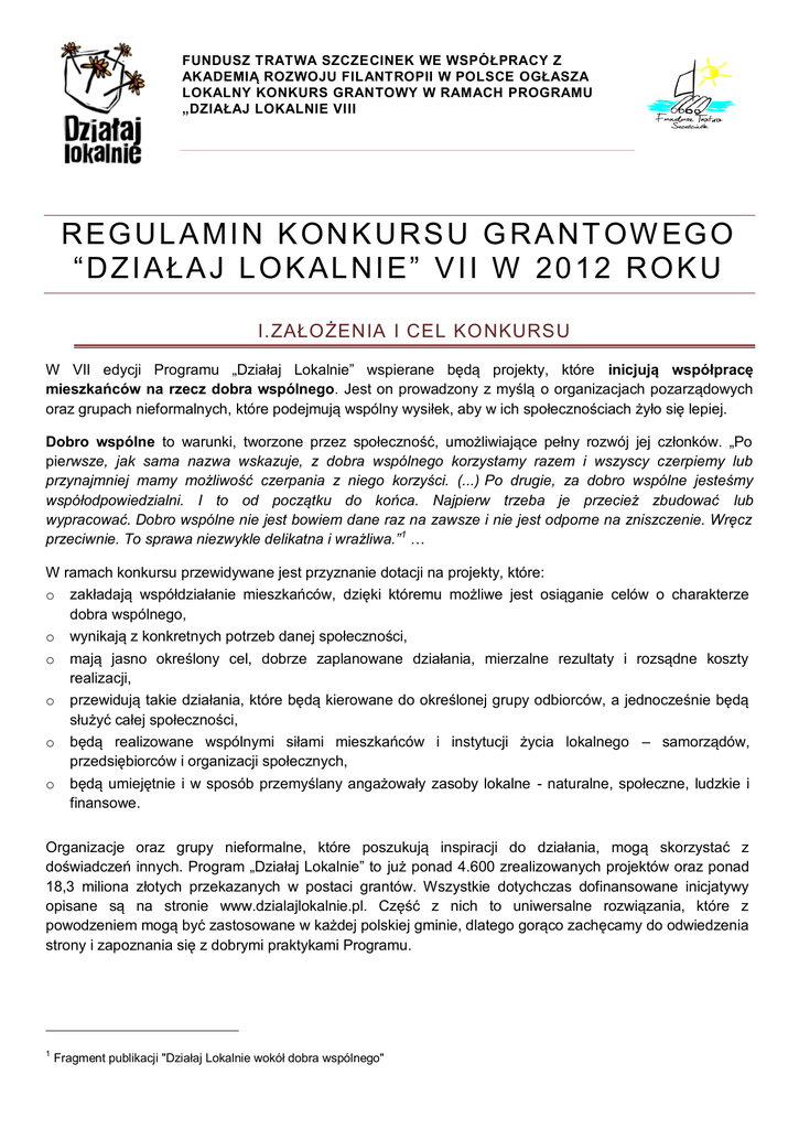FUNDUSZ TRATWA SZCZECINEK WE WSPÓŁPRACY Z AKADEMIĄ ROZWOJU FILANTROPII W POLSCE OGŁASZA LOKALNY KONKURS GRANTOWY W RAMACH PROGRAMU „DZIAŁAJ LOKALNIE VIII R E G U L A M I N K O N K U R S U G R A N T OW EG O “DZIAŁAJ LOKALNIE” VII W 2012 ROKU I.ZAŁOŻENIA I CEL KO NKURSU W VII edycji Programu „Działaj Lokalnie” wspierane będą projekty, które inicjują współpracę mieszkańców na rzecz dobra wspólnego. Jest on prowadzony z myślą o organizacjach pozarządowych oraz grupach nieformalnych, które podejmują wspólny wysiłek, aby w ich społecznościach żyło się lepiej. Dobro wspólne to warunki, tworzone przez społeczność, umożliwiające pełny rozwój jej członków. „Po pierwsze, jak sama nazwa wskazuje, z dobra wspólnego korzystamy razem i wszyscy czerpiemy lub przynajmniej mamy możliwość czerpania z niego korzyści. (...) Po drugie, za dobro wspólne jesteśmy współodpowiedzialni. I to od początku do końca. Najpierw trzeba je przecież zbudować lub wypracować. Dobro wspólne nie jest bowiem dane raz na zawsze i nie jest odporne na zniszczenie. Wręcz przeciwnie. To sprawa niezwykle delikatna i wrażliwa.” 1 … W ramach konkursu przewidywane jest przyznanie dotacji na projekty, które: o o o zakładają współdziałanie mieszkańców, dzięki któremu możliwe jest osiąganie celów o charakterze dobra wspólnego, wynikają z konkretnych potrzeb danej społeczności, mają jasno określony cel, dobrze zaplanowane działania, mierzalne rezultaty i rozsądne koszty realizacji, o przewidują takie działania, które będą kierowane do określonej grupy odbiorców, a jednocześnie będą służyć całej społeczności, o będą realizowane wspólnymi siłami mieszkańców i instytucji życia lokalnego – samorządów, przedsiębiorców i organizacji społecznych, o będą umiejętnie i w sposób przemyślany angażowały zasoby lokalne - naturalne, społeczne, ludzkie i finansowe. Organizacje oraz grupy nieformalne, które poszukują inspiracji do działania, mogą skorzystać z doświadczeń innych. Program „Działaj Lokalnie” to już ponad 4.600 zrealizowanych projektów oraz ponad 18,3 miliona złotych przekazanych w postaci grantów. Wszystkie dotychczas dofinansowane inicjatywy opisane są na stronie www.dzialajlokalnie.pl. Część z nich to uniwersalne rozwiązania, które z powodzeniem mogą być zastosowane w każdej polskiej gminie, dlatego gorąco zachęcamy do odwiedzenia strony i zapoznania się z dobrymi praktykami Programu. 1 Fragment publikacji "Działaj Lokalnie wokół dobra wspólnego" II. KTO MOŻE UBIEGAĆ SIĘ O DOTACJE? Program adresowany jest do: o organizacji pozarządowych posiadających osobowość prawną (tj. fundacji, stowarzyszeń, oddziałów Caritas zarejestrowanych w KRS lub klubów sportowych zarejestrowanych w ewidencji Starosty Powiatowego), z wyłączeniem fundacji skarbu państwa i ich oddziałów, spółdzielni socjalnych i mieszkaniowych, stowarzyszeń samorządów lokalnych, Lokalnych Grup Działania i Lokalnych Grup Rybackich, Lokalnych Organizacji Turystycznych (działających na podstawie Ustawy z dnia 25 czerwca 1999 r. o Polskiej Organizacji Turystycznej i w oparciu o ustawę prawo o stowarzyszeniach, zgodnie z Art. 4. ustawy o POT) oraz związków stowarzyszeń. o grup nieformalnych (w tym także oddziałów terenowych organizacji nieposiadających osobowości prawnej), w których imieniu wniosek złoży organizacja pozarządowa (jak wyżej) lub jedna z następujących instytucji publicznych: przedszkole publiczne, szkoła publiczna, instytucja kultury, biblioteka publiczna, ośrodek pomocy społecznej. Instytucje te muszą posiadać osobowość prawną lub dysponować stosownym pełnomocnictwem od organu, któremu podlegają, do reprezentowania go w zakresie umożliwiającym przeprowadzenie planowanych działań, podpisanie umowy oraz rozliczenie projektu. Do konkursu można składać nieograniczoną liczbę wniosków (zarówno przez wnioskodawców 2, jak i realizatorów3), jednak jeden realizator będzie mógł dostać dofinansowanie na realizację najwyżej jednego projektu. W konkursie mogą wziąć udział te organizacje i instytucje oraz grupy, które: o mają siedzibę w gminach: miejska Szczecinek, wiejska Szczecinek, Borne Sulinowo, Barwice, Grzmiąca. o planują prowadzić działania na terenie jednej z wymienionych gmin. III. SPOSÓB W YŁANIANIA GRANTOBIORCÓW Ośrodek „Działaj Lokalnie” dokona oceny formalnej w oparciu o następujące kryteria: 1. projekt został złożony w terminie, tj. do 30.04.2012 r. do godziny 15.00 2. projekt jest napisany według formularza wniosku Programu „Działaj Lokalnie VII” 2012, jest czytelny i kompletny. 3. projekt jest złożony przez organizację, instytucję lub grupę uprawnioną do udziału w konkursie, zgodnie z wytycznymi przedstawionymi w części II Regulaminu. 4. organizacja/instytucja ubiegająca się o dotację załączyła do wniosku dokument potwierdzający posiadanie osobowości prawnej lub stosowne pełnomocnictwo od organu, któremu podlega, do samodzielnego zaciągania zobowiązań oraz prowadzenia działań zaplanowanych w ramach projektu 4. 5. projekt jest adresowany do społeczności do około 20.000 mieszkańców (lub większej, objętej konkursem miejscowości5), która mieści się w zasięgu działania ODL, a siedziba wnioskodawcy (organizacji, oddziału) znajduje się na obszarze objętym konkursem przez ODL. 2 organizacja lub instytucja posiadająca osobowość prawną, aplikująca w imieniu grupy nieformalnej, lub w imieniu własnym grupa nieformalna, która będzie realizować projekt 4 nie dotyczy Inicjatywy DL 3 5 Za zgodą ARFP regulamin lokalnego konkursu grantowego w 2012 r., strona 2 z 9 6. projekt dotyczy aktywizowania lokalnych społeczności wokół celów o charakterze dobra wspólnego. 7. harmonogram minimum 3-miesięcznego, max. 6-miesięcznego projektu jest przewidziany na okres między 15.05.2
