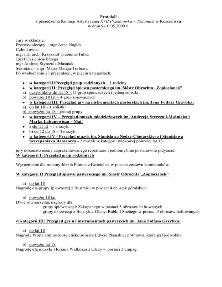 Protokół z posiedzenia Komisji Artystycznej XVII Przednówka w Polanach w Kościelisku w dniu 9-10.05.2009 r. Jury w składzie: Przewodniczący – mgr Anna Naglak Członkowie: mgr inż. arch. Krzysztof Trebunia-Tutka Józef Gąsienica-Brzega mgr Andrzej Styrczula-Maśniak Sekretarz – mgr Maria Mateja-Torbiarz Po wysłuchaniu 27 prezentacji, w pięciu kategoriach: a) b) a) b) w kategorii I:Przegląd grup rodzinnych – 1 rodziny w kategorii II: Przegląd śpiewu pasterskiego im. Sióstr Obrochta „Zopłocianek” uczestników do lat 18 - 12 grup śpiewaczych i jednej solistki powyżej 18 lat – 4 grup śpiewaczych w kategorii III: Przegląd gry na instrumentach pasterskich im. Jana Folfasa Grzybka: do lat 18 – 1 solistki powyżej lat 18 – jednej grupy w kategorii IV – Przegląd muzyk młodzieżowych im. Andrzeja Styrczuli-Maśniaka i Marka Łabunowicza – Mai: a)do lat 12 – 1 muzyki b) od 12 do 18 – 4 muzyk w kategorii V - Przegląd muzyk im. Stanisława Nędzy-Chotarskiego i Stanisława Szczepaniaka Bańscorza - 2 muzyk w kategorii wiekowej powyżej lat 18 jury dokonało oceny zaprezentowanego repertuaru i jednomyślnie postanowiło przyznać: W kategorii I: Przegląd grup rodzinnych Wyróżnienie dla rodziny Józefa Pitonia z Kościelisk w postaci zestawu kamienioków W kategorii II Przegląd śpiewu pasterskiego im. Sióstr Obrochta „Zopłocianek” a) do lat 18 Nagrodę dla grupy śpiewaczej z Bustryku w postaci 4 chustek góralskich b) powyżej 18 lat Dwie równorzędne nagrody dla: - grupy śpiewaczej z Zakopanego w postaci 5 obrusów haftowanych - grupy dziewcząt z Bustryku, Olczy, Rabki i Suchego w postaci 5 obrusów haftowanych w kategorii III: Przegląd gry na instrumentach pasterskich im. Jana Folfasa Grzybka: a) do lat 18 Nagrody Wójta Gminy Kościelisko solistce Edycie Pisarskiej z Witowa, którą jest jedwobka b) powyżej lat 18 Nagrodę dla muzyki Floriana Walkosza z Olczy w postaci 3 ciupag w kategorii IV – Przegląd muzyk młodzieżowych im. Andrzeja Styrczuli-Maśniaka i Marka Łabunowicza – Mai: a) do lat 12 Nagrodę dla muzyki Andrzeja Szczepaniaka Bańscorza z TCKiS „Jutrzenka” w postaci 3 kompletów strun b) w przedziale wiekowym lat 12 do 18 – ex equo: - Nagrodę dla muzyki z Zaskala w postaci 4 cyrpoków - Nagrodę dla muzyki zespołu „Zbójnicek” z Zębu w postaci 4 piórek w kategorii V – przegląd muzyk im. Stanisława Nędzy-Chotarskiego i Stanisława SzczepaniakaBańscorza – powyżej lat 18 Nagrodę dla muzyki z Kościelisk z prymistą Marcinem Gąsienicą-Matusem w postaci 4 kompletów strun „Tomastick” Ponadto jury przyznało: Nagrodę Dyrektora GOKR Kościelisko dla grupy śpiewaczej do lat 18 dla Witowianiek w postaci bonu do sklepu „Gorsecik” Nagrodę Prezesa Związku Podhalan w Kościelisku dla grupy starszej zespołu „Białcanie” z Białki Tatrzańskiej w postaci szkatułki i chustki góralskiej. Specjalną Nagrodę Wójta Gminy Kościelisko dla Floriana Walkosza za bogactwo prezentacji wykonanych własnoręcznie instrumentów pasterskich . Wyróżnienie w kategorii śpiewu pasterskiego dla grupy „Sykowni” z Załucznego w postaci 3 chustek góralskich Wyróżnienie w kategorii śpiewu pasterskiego do 18 lat dla Alicji Masny z „Młodych Klimków” w postaci zielonej tybetki W kategorii Muzyk powyżej 18 lat wyróżnienie dla Muzyki z Kościelisk z prymistą Maciejem StopkąFaktorem w postaci 4 ciupag. Jury stwierdza wysoki i wyrównany poziom tegorocznych prezentacji z „Przednówka”. Jury zwraca uwagę na dostosowanie ubioru do rodzaju prezentacji zwłaszcza w kategorii śpiewu pasterskiego i gry na instrumentach pasterskich. Zachęcamy do wykorzystania elementów takich jak: wyskanie, zawołania pasterskie oraz dobór repertuaru o charakterze pasterskim. Prezentowanie gry na instrumentach pasterskich winno odbywać się w zgodzie z tradycją. Komisja zachęca również do bardziej licznego udziału w przeglądzie grup rodzinnych odzwierciedlającym tradycyjny sposób przekazu kultury regionu. Jury gratuluje organizacji imprezy i wyraża uznanie dla jej sprawnego przebiegu. Na tym protokół zakończono i podpisano.