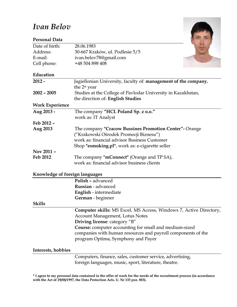 Ivan Belov Personal Data Date of birth: Address: E-mail: Cell phone: Education 2012 2002 – 2005 Work Experience Aug 2013 Feb 2012 – Aug 2013 Nov 2011 – Feb 2012 28.06.1983 30-667 Kraków, ul. Podlesie 5/5 [email protected] +48 504 898 408 Jagiellonian University, faculty of: management of the company, the 2st year Studies at the College of Pavlodar University in Kazakhstan, the direction of: English Studies The company “HCL Poland Sp. z o.o.” work as: IT Analyst The company "Cracow Bussines Promotion Center”- Orange (“Krakowski Ośrodek Promocji Biznesu”) work as: financial advisor Business Customer Shop "esmoking.pl", work as: e-cigarette seller The company "mConnect" (Orange and TP SA), work as: financial advisor business clients Knowledge of foreign languages Polish – advanced Russian - advanced English - intermediate German - beginner Skills Computer skills: MS Excel, MS Access, Windows 7, Active Directory, Account Management, Lotus Notes Driving license: category “B” Course: computer accounting for small and medium-sized companies with human resources and payroll components of the program Optima, Symphony and Payer Interests, hobbies Computers, finance, sales, customer service, advertising, foreign languages, music, sport, literature, theatre. * I agree to my personal data contained in the offer of work for the needs of the recruitment process (in accordance with the Act of 29/08/1997, the Data Protection Acts. U. Nr 133 poz. 883).