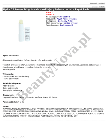 Informacje o produkcie Utworzono 06-03-2017 Hydra 24 Levres Długotrwale nawilżający balsam do ust - Payot Paris Cena : 46,00 zł ov a. pl Nr katalogowy : 65108988 Producent : Payot Paris - Francja Dostępność : Dostępny 7 dni Stan magazynowy : bardzo wysoki Średnia ocena : brak recenzji Hydra 24+ Lvres Długotrwale nawilżający balsam do ust z olej ogórecznika ea Składniki aktywne: Masło z karite Olej z ogórecznika Stearyl glycyrrhetinate ut Wskazania: - do wszystkich rodzajów skóry - skóra odwodniona yN Ten stick przynosi komfort, nawilżenie i miękkość do suchych i zniszczonych ust. Nawilża, uzdrawia, odbudowuje i chroni przed szkodliwymi czynnikami atmosferycznymi. Bez alergenów. B Stosowanie: Preparat idealny o każdej porze roku, zarówno latem, jak i zimą. Pojemność: Sztyft w 4 g Skład: PARAFFINUM LIQUIDUM (MINERAL OIL) PARAFFIN CERA MICROCRISTALLINA (MICROCRYSTALLINE WAX) COPERNICIA CERIFERA CERA (COPERNICIA CERIFERA (CARNAUBA) WAX) BUTYROSPERMUM PARKII (SHEA) BUTTER C12-13 ALKYL LACTATE CERA ALBA (BEESWAX) CETYL ALCOHOL BORAGO OFFICINALIS SEED OIL TOCOPHERYL ACETATE STEARYL GLYCYRRHETINATE PARFUM (FRAGRANCE) ASCORBYL PALMITATE TOCOPHEROL BHT Wygenerowano w programie www.oscGold.com