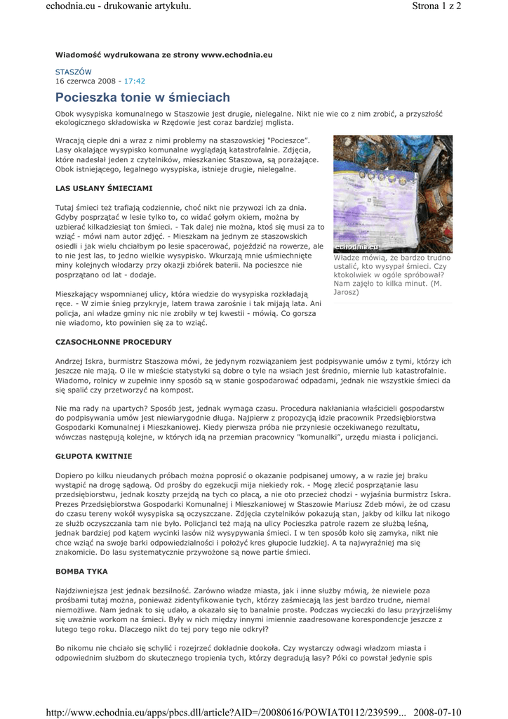 echodnia.eu - drukowanie artykułu. Strona 1 z 2 Wiadomość wydrukowana ze strony www.echodnia.eu STASZÓW 16 czerwca 2008 - 17:42 Pocieszka tonie w śmieciach Obok wysypiska komunalnego w Staszowie jest drugie, nielegalne. Nikt nie wie co z nim zrobić, a przyszłość ekologicznego składowiska w Rzędowie jest coraz bardziej mglista. Wracają ciepłe dni a wraz z nimi problemy na staszowskiej "Pocieszce”. Lasy okalające wysypisko komunalne wyglądają katastrofalnie. Zdjęcia, które nadesłał jeden z czytelników, mieszkaniec Staszowa, są poraŜające. Obok istniejącego, legalnego wysypiska, istnieje drugie, nielegalne. LAS USŁANY ŚMIECIAMI Tutaj śmieci teŜ trafiają codziennie, choć nikt nie przywozi ich za dnia. Gdyby posprzątać w lesie tylko to, co widać gołym okiem, moŜna by uzbierać kilkadziesiąt ton śmieci. - Tak dalej nie moŜna, ktoś się musi za to wziąć - mówi nam autor zdjęć. - Mieszkam na jednym ze staszowskich osiedli i jak wielu chciałbym po lesie spacerować, pojeździć na rowerze, ale to nie jest las, to jedno wielkie wysypisko. Wkurzają mnie uśmiechnięte miny kolejnych włodarzy przy okazji zbiórek baterii. Na pocieszce nie posprzątano od lat - dodaje. Mieszkający wspomnianej ulicy, która wiedzie do wysypiska rozkładają ręce. - W zimie śnieg przykryje, latem trawa zarośnie i tak mijają lata. Ani policja, ani władze gminy nic nie zrobiły w tej kwestii - mówią. Co gorsza nie wiadomo, kto powinien się za to wziąć. Władze mówią, Ŝe bardzo trudno ustalić, kto wysypał śmieci. Czy ktokolwiek w ogóle spróbował? Nam zajęło to kilka minut. (M. Jarosz) CZASOCHŁONNE PROCEDURY Andrzej Iskra, burmistrz Staszowa mówi, Ŝe jedynym rozwiązaniem jest podpisywanie umów z tymi, którzy ich jeszcze nie mają. O ile w mieście statystyki są dobre o tyle na wsiach jest średnio, miernie lub katastrofalnie. Wiadomo, rolnicy w zupełnie inny sposób są w stanie gospodarować odpadami, jednak nie wszystkie śmieci da się spalić czy przetworzyć na kompost. Nie ma rady na upartych? Sposób jest, jednak wymaga czasu. Procedura nakłaniania właścicieli gospodarstw do podpisywania umów jest niewiarygodnie długa. Najpierw z propozycją idzie pracownik Przedsiębiorstwa Gospodarki Komunalnej i Mieszkaniowej. Kiedy pierwsza próba nie przyniesie oczekiwanego rezultatu, wówczas następują kolejne, w których idą na przemian pracownicy "komunalki”, urzędu miasta i policjanci. GŁUPOTA KWITNIE Dopiero po kilku nieudanych próbach moŜna poprosić o okazanie podpisanej umowy, a w razie jej braku wystąpić na drogę sądową. Od prośby do egzekucji mija niekiedy rok. - Mogę zlecić posprzątanie lasu przedsiębiorstwu, jednak koszty przejdą na tych co płacą, a nie oto przecieŜ chodzi - wyjaśnia burmistrz Iskra. Prezes Przedsiębiorstwa Gospodarki Komunalnej i Mieszkaniowej w Staszowie Mariusz Zdeb mówi, Ŝe od czasu do czasu tereny wokół wysypiska są oczyszczane. Zdjęcia czytelników pokazują stan, jakby od kilku lat nikogo ze słuŜb oczyszczania tam nie było. Policjanci teŜ mają na ulicy Pocieszka patrole razem ze słuŜbą leśną, jednak bardziej pod kątem wycinki lasów niŜ wysypywania śmieci. I w ten sposób koło się zamyka, nikt nie chce wziąć na swoje barki odpowiedzialności i połoŜyć kres głupocie ludzkiej. A ta najwyraźniej ma się znakomicie. Do lasu systematycznie przywoŜone są nowe partie śmieci. BOMBA TYKA Najdziwniejsza jest jednak bezsilność. Zarówno władze miasta, jak i inne słuŜby mówią, Ŝe niewiele poza prośbami tutaj moŜna, poniewaŜ zidentyfikowanie tych, którzy zaśmiecają las jest bardzo trudne, niemal niemoŜliwe. Nam jednak to się udało, a okazało się to banalnie proste. Podczas wycieczki do lasu przyjrzeliśmy się uwaŜnie workom na śmieci. Były w nich między innymi imiennie zaadresowane korespondencje jeszcze z lutego tego roku. Dlaczego nikt do tej pory tego nie odkrył? Bo nikomu nie chciało się schylić i rozejrzeć dokładnie dookoła. Czy wystarczy odwagi władzom miasta i odpowiednim słuŜbom do skutecznego tropienia tych, którzy degradują lasy? Póki co powstał jedynie spis http://www.echodnia.eu/apps/pbcs.dll/article?AID=/20080616/POWIAT0112/239599... 2008-07-10 echodnia.eu - drukowanie artykułu. Strona 2 z 2 dzikich wysypisk z ładnymi zdjęciami. W przyszłym roku trzeba go będzie powiększyć o kolejne wpisy. MARZENIA O RZĘDOWIE Staszów ma jeszcze inny problem, a chodzi o planowaną budowę składowiska w Rzędowie na granicy gmin Staszów i Tuczępy. Starania o budowę ekologicznego składowiska odpadów przypominają bicie głową w mur. Inwestycja, która miała zostać uruchomiona jeszcze przed końcem 2009 roku jest w sferze planów, a ich realizacja coraz bardziej oddala się w czasie. Nie ma na nią przyobiecanych pieniędzy, coraz głośniejsze są protesty mieszkańców, nawet poszczególne gminy wchodzące w skład ekologicznego związku zaczynają mieć coraz więcej wątpliwości. Echo Media sp. z o.o. http://www.echodnia.eu/apps/pbcs.dll/article?AID=/20080616/POWIAT0112/239599... 2008-07-10