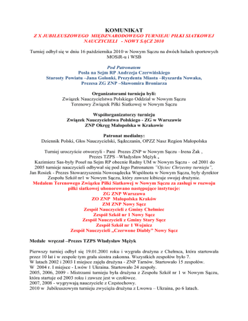 KOMUNIKAT Z X JUBILEUSZOWEGO MIĘDZNARODOWEGO TURNIEJU PIŁKI SIATKOWEJ NAUCZYCIELI - NOWY SĄCZ 2010 Turniej odbył się w dniu 16 pażdziernika 2010 w Nowym Sączu na dwóch halach sportowych MOSiR-u i WSB Pod Patronatem Posła na Sejm RP Andrzeja Czerwińskiego Starosty Powiatu –Jana Golonki, Prezydenta Miasta –Ryszarda Nowaka, Prezesa ZG ZNP –Sławomira Broniarza Organizatorami turnieju byli: Związek Nauczycielstwa Polskiego Oddział w Nowym Sączu Terenowy Związek Piłki Siatkowej w Nowym Sączu Współorganizatorzy turnieju Związek Nauczycielstwa Polskiego - ZG w Warszawie ZNP Okręg Małopolska w Krakowie Patronat medialny: Dziennik Polski, Głos Nauczycielski, Sądeczanin, OPZZ Nasz Region Małopolska Turniej uroczyście otworzyli - Pani Prezes ZNP w Nowym Sączu –Irena Żak , Prezes TZPS –Władysław Mężyk , Kazimierz Sas-były Poseł na Sejm RP obecnie Radny UM w Nowym Sączu - od 2001 do 2005 turnieje nauczycieli odbywał się pod Jego Patronatem ”Ojciec Chrzestny turnieju”, Jan Rosiek - Prezes Stowarzyszenia Nowosądecka Wspólnota w Nowym Sączu, były dyrektor Zespołu Szkół nr1 w Nowym Sączu, który zawsze kibicuje swojej drużynie. Medalem Terenowego Związku Piłki Siatkowej w Nowym Sączu za zasługi w rozwoju piłki siatkowej uhonorowano następujące instytucje: ZG ZNP Warszawa ZO ZNP Małopolska Kraków ZM ZNP Nowy Sącz Zespól Nauczycieli z Gminy Chełmiec Zespół Szkół nr 1 Nowy Sącz Zespół Nauczycieli z Gminy Stary Sącz Zespół Szkół nr 1 Wojnicz Zespół Nauczycieli „Czerwone Diabły” Nowy Sącz Medale wręczał –Prezes TZPS Władysław Mężyk Pierwszy turniej odbył się 19.01.2001 roku i wygrała drużyna z Chełmca, która startowała przez 10 lat i w zespole tym grała siostra zakonna. Wszystkich zespołów było 7. W latach 2002 i 2003 I miejsce zajęła drużyna - ZNP Tarnów. Startowało 15 zespołów. W 2004 r. I miejsce - Lwów 1 Ukraina. Startowało 24 zespoły. 2005, 2006, 2009 - Mistrzami turnieju była drużyna z Zespołu Szkół nr 1 w Nowym Sączu, która startuje od 2003 roku i zawsze jest w czołówce. 2007, 2008 - wygrywają nauczyciele z Częstochowy. 2010 w Jubileuszowym turnieju zwycięża drużyna z Lwowa – Ukraina, po 6 latach. Łącznie w 10-ciu turniejach wystartowało 152 zespołów, w tym z Nowego Sącza 19 zespołów. W zawodach brali udział nauczyciele, księża i siostra zakonna. Na zakończenie turnieju odbyła się uroczysta kolacja , na której nagrody wręczali - Kazimierz Sas i Władysław Mężyk Statuetki złotych siatkarzy ZG ZNP Otrzymali: Jan Golonka –Starosta Powiatu Nowosądeckiego Ryszard Nowak –Prezydent Miasta Nowego Sącza ZM ZNP Nowy Sącz Zespół Solanka z Ukrainy Zespół Szkół nr 1 w Nowym Sączu Wszystkie drużyny otrzymały pamiątkowe statuetki, proporczyki, dyplomy, upominki a najlepsze drużyny otrzymały puchary i medale. Wybrano najlepszą siatkarkę turnieju - Anna Załęska-Zespół Szkól nr 1 Nowy Sącz Najlepszym siatkarzem został - Kaliy Yuriy -Lwów Sędzią głównym turnieju był: Lechosław Ziębowicz Kierownikiem zawodów była: Grażyna Cempa Pulit Do zawodów zgłosiło się 14 zespołów, podzielono na 4 grupy w grupach rozegrano mecze „każdy z każdym” do dwóch wygranych setów do 25 punktów, a następnie rozegrano mecze półfinałowe i finałowe. Łącznie rozegrano 31 meczy w których wystartowało 103 zawodników. WYNIKI TECHNICZNE TURNIEJU Miejsce I II III -/Miejsce I II III IV GRUPA A Solanka -Lwów-I ZNP Grybów Biadoliny Szlacheckie GRUPA C Stary Sącz Solanka-Lwów II ZNP Bobowa Czerwone Diabły Punkty 4(4-0) 3(2-2) 2(0-4) Miejsce I II III IV GRUPA B Chełmiec ZNP Rybnik 35 Nowy Sącz ZNP Łużna Punkty 6(6-0) 5(4-2) 4(2-4) 3(0-6) Punkty Miejsce GRUPA D Punkty 6(6-1) I Zespół Szkół nr1 4(4-0) 5(4-3) II Kamionka W. 3(0-4) 4(3-5) III Wojnicz 2(0-4) 3(2-6) MECZE PÓŁFINAŁOWE Grupa E zespoły Wynik Grupa F Zespoły Wynik -Łużna Czerwone DA4-B-4 C4-D4 Biadoliny- 35 N. Sącz Bobowa-Wojnicz A3-B3 0-2 C3-D3 1-2 Grybów-Rybnik Lwów-2-Kamionka W 0-2 A2-B2 0-2 C2-D2 Lwów-IChełmiec St. Sącz- Zespół Sz nr1 0-2 A1-B1 2-0 C1-D1 MECZE FINAŁOWE Miejsce Zespoły Wynik 13-14 wygrany E-4-F-4 Łużna- Czerwone Diabły 0-2(9-25,20-25) 11-12 przegrany E-3-F-3 Biadoliny-Bobowa 0-2(16-25,20-25) 9-10 wygrany E-3-F-3 35-Nowy Sącz-Wojnicz 2-0(25-17,25,17) 7-8 przegrany E-2-F-2 Grybów-Lwów-2 2-0(25-15,25-18) 5-6 wygrany E-2-F-2 Rybnik-Kamionka Wielka 0-2(18-25,20-25) 3-4 1-2 przegrany wygrany MIEJSCE I II III IV V VI VII VIII IX X XI XII XIII XIV E-1-F-1 Chełmiec-Stary Sącz 2-0(25-22,25-16) E-1-F1 Lwów-1-ZSz nr N. Sącz 2-1(23-25,25-22,15-10 OSTATECZNA KOLEJNOŚĆ ZESPÓŁ KAPITAN Salonka –Lwów-1-Ukraina Vlodymir Sidun Zespół Szkół nr1 Nowy Sącz Robert Król Gmina Chełmiec-nowosądecki Dariusz Ruchała Gmina Stary Sącz-nowosądecki Dorota Postrożny Młyńska ZNP Kamionka Wielka-nowosądecki Sławomir Poremba ZNP Rybnik –Woj. .Śląskie Artur Duda ZNP Grybów-nowosądecki Paweł Wysowski Salonka –Lwów-2 Vlodymir Kit 35-Nowy Sącz Joanna Kotlicka Zespół SZiT Wojnicz-tarnowski Janusz Kuboń ZNP Bobowa-Gorlicki Wiesław Oratowski Biadoliny Szlacheckie-tarnowski Dariusz Kuta Czerwone Diabły Nowy Sącz Małgorzata Janik ZNP- Łużna -gorlicki Bogusław Janek Serdecznie dziękuję wszystkim zawodnikom za udział, współorganizatorom i sponsorom za pomoc przy organizacji zawodów. Grażyna Cempa Pulit
