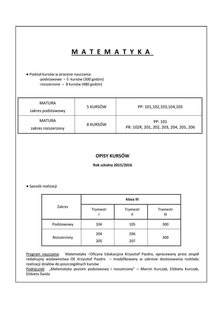M A T E M A T Y K A ● Podział kursów w procesie nauczania: -podstawowe – 5 kursów (300 godzin) -rozszerzone – 8 kursów (480 godzin) MATURA zakres podstawowy MATURA zakres rozszerzony 5 KURSÓW PP: 101,102,103,104,105 8 KURSÓW PP: 101 PR: 102R, 201, 202, 203, 204, 205, 206 OPISY KURSÓW Rok szkolny 2015/2016 ● Sposób realizacji klasa III Zakres Podstawowy Rozszerzony Trymestr I Trymestr II Trymestr III 104 105 300 204 206 205 207 300 Program nauczania: Matematyka –Oficyna Edukacyjna Krzysztof Pazdro, opracowany przez zespół redakcyjny wydawnictwa OE Krzysztof Pazdro – modyfikowany w zakresie dostosowania rozkładu realizacji działów do poszczególnych kursów Podręcznik: „Matematyka poziom podstawowy i rozszerzony” – Marcin Kurczab, Elżbieta Kurczab, Elżbieta Świda ● Opisy kursów: Zakres podstawowy: KURS 104 Geometria płaska - pola czworokątów. (5) Wielomiany. (8) Ułamki algebraiczne. Równania wymierne. (11) Ciągi. (11) Potęgi. Logarytmy. Funkcja wykładnicza. (12) Elementy geometrii analitycznej. (6) KURS 105 Elementy kombinatoryki i rachunku prawdopodobieństwa. (8) Elementy statystyki opisowej. (3) Stereometria. (16) Rozwiązywanie arkuszy maturalnych. (30) ***** Zakres rozszerzony: KURS 204 Wielomiany cz. II (14) Wyrażenia wymierne, funkcja wymierna (20) Ciągi cz. I (zakres podstawowy) (11) KURS 205 Trygonometria. (17) Funkcja wykładnicza i funkcja logarytmiczna. (20) Geometria analityczna. (13) KURS 206 Ciągi cz. II (zakres rozszerzony) (6) Elementy analizy matematycznej. (27) Kombinatoryka i rachunek prawdopodobieństwa. (17) Statystyka. (3) KURS 207 Stereometria. (19) Rozwiązywanie testów maturalnych (40) Sposób realizacji klasa II Zakres Podstawowy Rozszerzony* Trymestr I Trymestr II Trymestr III 102P 103 103 203 204 102R 202 * dotyczy specjalizacji z rozszerzoną matematyką poza specjalizacją medyczną Sposób realizacji – specjalizacja medyczna z matematyką rozszerzoną klasa II Zakres Rozszerzony Trymestr I 102R 201 Trymestr II Trymestr III 202 203 Program nauczania: Matematyka –Oficyna Edukacyjna Krzysztof Pazdro, opracowany przez zespół redakcyjny wydawnictwa OE Krzysztof Pazdro – modyfikowany w zakresie dostosowania rozkładu realizacji działów do poszczególnych kursów Podręcznik: „Matematyka poziom podstawowy i rozszerzony” – Marcin Kurczab, Elżbieta Kurczab, Elżbieta Świda Opisy kursów: Zakres podstawowy: KURS 102P Geometria płaska – trójkąty. (16) Trygonometria kąta wypukłego. (14) Geometria płaska – pole koła, pole trójkąta.(10) Funkcje i ich własności.(17) KURS 103 Przekształcenia wykresów funkcji (10) Funkcja liniowa (13) Funkcja kwadratowa (18) Geometria płaska – czworokąty (13) ***** Zakres rozszerzony: KURS 102R Geometria płaska – trójkąty (15) Trygonometria (15) Pole koła i trójkąta (9) KURS 201 Funkcje i ich własności (16) Przekształcenia wykresów funkcji (10) Funkcja liniowa (20) KURS 202 Funkcja kwadratowa (25) Geometria płaska – czworokąty i ich pola (25) KURS 203 Wielomiany (24) Ułamki algebraiczne, równania i nierówności wymierne (16) Ciągi cz. I (12) KURS 204 Ciągi cz. II (6) Trygonometria (17) Funkcja wykładnicza i logarytmiczna (20) Statystyka (3) Sposób realizacji klasa I Zakres Trymestr I Trymestr II Trymestr III Podstawowy 101 101 102P Rozszerzony* 101 101 102R 201 * specjalizacja medyczna z rozszerzoną matematyką nie realizuje kursu 201 Program nauczania: Matematyka –Oficyna Edukacyjna Krzysztof Pazdro, opracowany przez zespół redakcyjny wydawnictwa OE Krzysztof Pazdro – modyfikowany w zakresie dostosowania rozkładu realizacji działów do poszczególnych kursów Podręcznik: „Matematyka poziom podstawowy i rozszerzony” – Marcin Kurczab, Elżbieta Kurczab, Elżbieta Świda Opis kursów: Zakres podstawowy: KURS 101 Wprowadzenie do matematyki. Pojęcia wstępne (10) Działania na zbiorach liczbowych (16) Wyrażenia algebraiczne (23) Geometria płaska – pojęcia wstępne (12) KURS 102P Geometria płaska – trójkąty (16) Trygonometria kąta wypukłego (14) Geometria płaska – pole koła, pole trójkąta (10) Funkcje i ich własności (17) ***** Zakres rozszerzony: KURS 101 Wprowadzenie do matematyki. Pojęcia wstępne (10) Działania na zbiorach liczbowych (16) Wyrażenia algebraiczne (23) Geometria płaska – pojęcia wstępne (12) KURS 102R Geometria płaska – trójkąty (15) Trygonometria kąta wypukłego (15) Pole koła i trójkąta (9) KURS 201 Funkcje i ich własności (16) Przekształcenia wykresów funkcji (10) Funkcja liniowa (20)