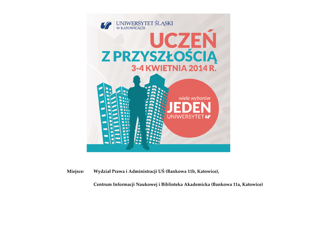 Miejsce: Wydział Prawa i Administracji UŚ (Bankowa 11b, Katowice), Centrum Informacji Naukowej i Biblioteka Akademicka (Bankowa 11a, Katowice) 3 KWIETNIA 2014 r. (Wydział Prawa i Administracji, Bankowa 11b, Katowice) 9.00 Uroczyste otwarcie dr hab. prof. UŚ Ryszard Koziołek, Prorektor ds. Kształcenia i Studentów mgr Stanisław Faber, Śląski Kurator Oświaty 9.30 Wykład inauguracyjny dr. hab. prof. UŚ Ryszarda Koziołka, Prorektora ds. Kształcenia i Studentów 3 KWIETNIA Miejsce: Wydział Prawa i Administracji UŚ (Bankowa 11b, Katowice), Centrum Informacji Naukowej i Biblioteka Akademicka (Bankowa 11a, Katowice) 10.30 Wykład pn. „Rola i zadania Samorządowych Kolegiów Odwoławczych" - dr hab. prof. UŚ Czesław Martysz, Prezes Samorządowego Kolegium Odwoławczego w Katowicach (aula nr 8, Wydział Prawa i Administracji) – 300 osób 10.30 Spotkanie z doradcą zawodowym (aula nr 7, Wydział Prawa i Administracji) – 250 osób 3.20 (WPiA) 3.50 (WPiA) 3.48 (WPiA) 3.51 (WPiA) 3.52 (WPiA) 10.30 – 12.00 Strój ludowy dawniej i dziś wobec wyzwań etnologów i muzealników (20 osób) 10.30 – 12.30 10.30 – 12.00 Rozmowa rekrutacyjna i planowanie kariery zawodowej (20 osób) Wykonywanie zawodu radcy prawnego (20 osób) 10.30 – 14.30 12.15 – 13.15 Każdy z nas może zostać odkrywcą dziedzictwa kulturowego (15 osób) 13.30 – 14.30 Stereotypowe myślenie o współczesnych zawodach (20 osób) 12.15 – 13.45 Ambasadorzy Niemożliwego (15 osób) 12.45 – 14.15 Bezpieczeństwo w naszych rękach. Jak się nie bać przemocy? (20 osób) Wykonywanie zawodu radcy prawnego (20 osób) 10.30 – 13.30 Wyższy poziom kariery – jak się do tego przygotować? (18 osób) Sala Dydaktyczna Poziom 0 (CINiBA) Sala Seminaryjna Poziom 2 (CINiBA) Sala Konferencyjna Poziom 0 (CINiBA) 10.30 -12.00 Moja zawodowa przyszłość, jak ją odkryć? Źródła wiedzy wsparciem indywidualnego wyboru, wartościowanie informacji (30 osób) 10.30 – 12.30 10.30 – 12.30 Rozmowa rekrutacyjna i planowanie kariery zawodowej (20 osób) Rozmowa rekrutacyjna i planowanie kariery zawodowej (20 osób) 12.15 – 13.45 12.45 - 12.45 – 14.30 Teatr bez tabu. O tym, że studiowanie kulturoznawstwa może być intrygujące (20 osób) Rzecznik Praw Obywatelskich w ochronie praw i wolności (20 osób) Podstawy warsztatu dziennikarskiego (30 osób) 4 KWIETNIA 9.00 – 10. 15 Spotkanie z doradcą zawodowym (aula nr 7, Wydział Prawa i Administracji) - 250 osób 3.20 (WPiA) 3.50 (WPiA) 9.30 – 10.30 3.48 (WPiA) 3.52 (WPiA) 10.30 – 12.00 Każdy z nas może zostać odkrywcą dziedzictwa kulturowego (20 osób) Bezpieczeństwo w naszych rękach. Jak się nie bać przemocy? (20 osób) 10.30 – 13.30 10.30 – 14.30 Wyższy poziom kariery – jak się do tego przygotować? (18 osób) Ambasadorzy Niemożliwego (15 osób) 10.45 – 11.45 12.15 – 14.00 Stereotypowe myślenie o współczesnych zawodach (20 osób) Podstawy warsztatu dziennikarskiego (20 osób) Sala Konferencyjna Poziom 0 (CINiBA) Sala Dydaktyczna Poziom 0 (CINiBA) Sala Seminaryjna Poziom 2 (CINiBA) 10.30-12.00 9:00 – 11:00. 10.30-14.00 Procedura doboru do służby w Policji oraz zasady naboru na stanowiska cywilne w Policji – jak zostać policjantem lub pracownikiem cywilnym w Policji? (90 osób) Budynki, które chronią klimat. O zastosowaniu OZE w budownictwie energooszczędnym. (30 osób) Chcesz mieć perspektywy? Zacznij od wykształcenia! Kreatywne wykorzystanie zdobytego wykształcenia w celu tworzenia innowacyjnej gospodarki (40 osób) 12.15 – 14.15 11.15 -12.45 Zintegrowany system informatyczny jako narzędzie do zarządzania przedsiębiorstwem – polski system klasy ERP II – IMPULS EVO firmy BPSC SA (50 osób) Moja zawodowa przyszłość, jak ją odkryć? Źródła wiedzy wsparciem indywidualnego wyboru, wartościowanie informacji (30 osób)