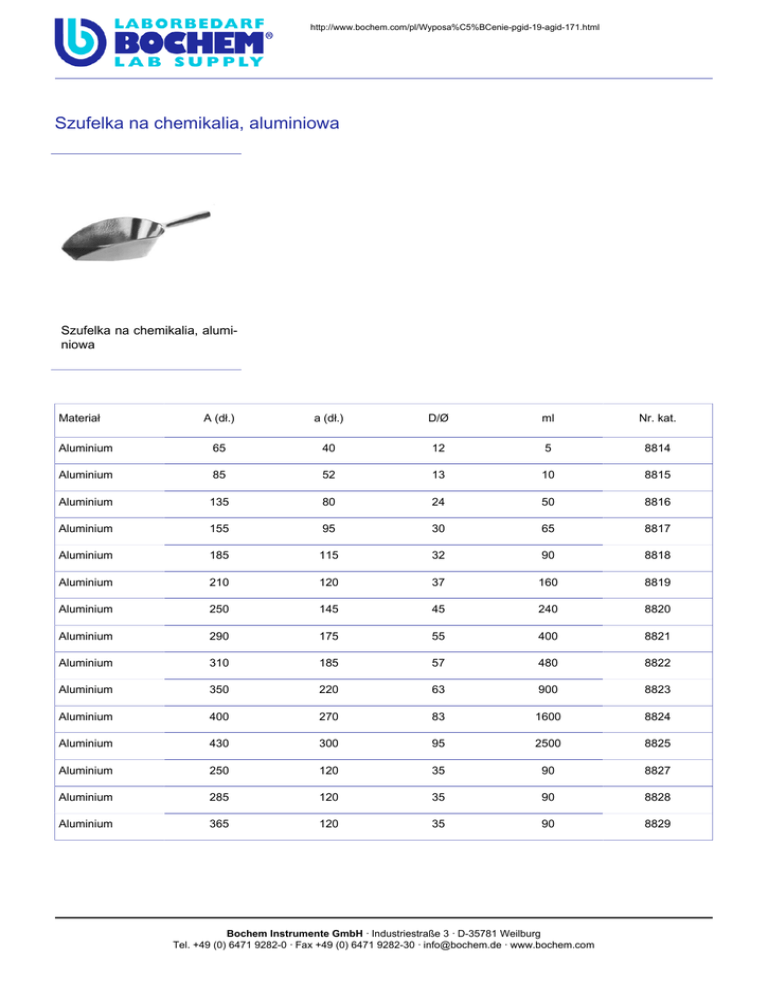 http://www.bochem.com/pl/Wyposa%C5%BCenie-pgid-19-agid-171.html Szufelka�na�chemikalia,�aluminiowa Szufelka�na�chemikalia,�aluminiowa Materiał A�(dł.) a�(dł.) D/Ø ml Nr.�kat. Aluminium 65 40 12 5 8814 Aluminium 85 52 13 10 8815 Aluminium 135 80 24 50 8816 Aluminium 155 95 30 65 8817 Aluminium 185 115 32 90 8818 Aluminium 210 120 37 160 8819 Aluminium 250 145 45 240 8820 Aluminium 290 175 55 400 8821 Aluminium 310 185 57 480 8822 Aluminium 350 220 63 900 8823 Aluminium 400 270 83 1600 8824 Aluminium 430 300 95 2500 8825 Aluminium 250 120 35 90 8827 Aluminium 285 120 35 90 8828 Aluminium 365 120 35 90 8829 Bochem Instrumente GmbH · Industriestraße 3 · D-35781 Weilburg Tel. +49 (0) 6471 9282-0 · Fax +49 (0) 6471 9282-30 · [email protected] · www.bochem.com