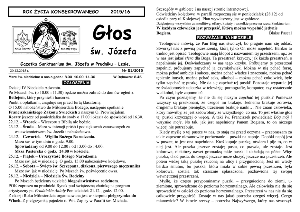ROK ŻYCIA KONSEKROWANEGO 2015/16 Głos św. Józefa Gazetka Sanktuarium św. Józefa w Prudniku – Lesie. Nr 51/2015 20.12.2015 r. Msze św. niedzielne u nas o godz.: 8.00 10.00 11.30 W Dębowcu: 8.45 OGŁOSZENIA Dzisiaj IV Niedziela Adwentu. Po Mszach św. (o 10.00 i 11.30) będzie można zabrać do domów ogień z Betlejem, który przynieśli harcerze. Punkt z opłatkami, znajduje się przed furtą klasztorną. O 15.00 nabożeństwo do Miłosierdzia Bożego, następnie spotkanie Franciszkańskiego Zakonu Świeckich z naszym O. Prowincjałem. Roraty jeszcze od poniedziałku do środy o 17.00 i okazja do spowiedzi od 16.30. 22.12. - Wtorek – Wieczoru z Biblią nie będzie. 23.12. - Środa – Msza w intencji próśb i podziękowań zanoszonych za wstawiennictwem św. Józefa i nabożeństwo. 24.12. - Czwartek – Wigilia Bożego Narodzenia. Msza św. w tym dniu o godz. 9.00. Spowiadamy od 9.00 do 12.00 i od 13.00 do 14.00. Msza Pasterska o godz. 24.00 w kościele. 25.12. - Piątek – Uroczystość Bożego Narodzenia Msze św. jak w niedzielę. O godz. 15.00 nabożeństwo kolędowe. 26.12. - Sobota – Święto św. Szczepana, diakona, pierwszego męczennika Msze św. jak w niedzielę. Po Mszach św. poświęcenie owsa. 28.12. - Niedziela – Niedziela Św. Rodziny Po Mszach będziemy udzielać błogosławieństwa rodzinom. POK zaprasza na prudnicki Rynek pod świąteczną choinkę na program artystyczny pt. Prudnickie Anioły Poniedziałek 21.12., godz. 12.00. Z okazji Roku Miłosierdzia organizowana jest w sierpniu pielgrzymka do Włoch. Z pielgrzymką pojedzie o. Wit. Zapisy w Parafii św. Michała. Szczegóły w gablotce i na naszej stronie internetowej. Odwiedziny kolędowe w parafii rozpoczną się w poniedziałek (28.12) od osiedla przy ul Kolejowej. Plan wywieszony jest w gablotce. Dziękujemy wszystkim za modlitwę, ofiary, kwiaty i wszelkie prace na rzecz Sanktuarium. W każdym człowieku jest przepaść, Którą można wypełnić jedynie Bogiem. Blaise Pascal ROZWAŻANIE NA NIEDZIELĘ Teologowie mówią, że Pan Bóg nas stworzył, bo pragnie nam się oddać. Stworzył nas z pewną przestrzenią, którą tylko On może napełnić. Bardzo to trudno jest opisać. Teologowie mają kłopot z nazwaniem tej przestrzeni, np.: że w nas jest jakaś sfera dla Boga. Ta przestrzeń krzyczy, jak każda przestrzeń, o napełnienie jej. Doświadczamy w nas tego krzyku. Próbujemy tę przestrzeń zapełnić, próbujemy zapychać ją czymkolwiek. Można w nią pchać forsę, można pchać ambicje i sukces, można pchać władzę i znaczenie, można pchać tępienie innych, można pchać seks, alkohol – można pchać cokolwiek, byle tylko zapchać tę pustkę. Nie da się zapchać tej pustki! Pozostaje wyparcie jej ze świadomości: ucieczka w telewizję, pornografię, komputer, czy ostatecznie w alkohol, byle zapomnieć. Po czym poznajemy, że nie da się niczym zapchać tej pustki? Ponieważ wszyscy są przekonani, że czegoś im brakuje. Jednemu brakuje zdrowia, drugiemu brakuje pieniędzy, trzeciemu brakuje nauki… Nie znam człowieka, który mówiłby, że jest zadowolony ze wszystkiego, co ma. To jest właśnie głos tej pustki krzyczącej o więcej. A taki św. Franciszek powiedział: Bóg mój i wszystko moje. No tak, jak jest napełniony Panem Bogiem, to on niczego więcej nie potrzebuje. Kiedy myślę o tej pustce w nas, to stają mi przed oczyma – przepraszam za takie zapewne niesamowite porównanie – puszki na napoje. Dopóki napój jest w puszce, to jest ona napełniona. Ktoś kupuje puszkę, otwiera i pije to, co w niej jest. Ale puszka jeszcze zostaje; pusta, co prawda, ale zostaje. Jest kolorowa, niektórzy nawet gromadzą takie puszki i układają na półce. Więc puszka, choć pusta, do czegoś jeszcze może służyć, jeszcze ma przestrzeń. Ale potem widzę taką puszkę rzuconą na ulicy i przygniecioną. Jest mi wtedy bardzo smutno, bo puszka, która miała w sobie pewną przestrzeń, była kolorowa, została tak strasznie spłaszczona, pozbawiona tej swojej wewnętrznej przestrzeni. Myślę, że często przypominamy puszki – przygniecione do ziemi, uziemione, sprowadzone do poziomu horyzontalnego. Ale człowieka nie da się sprowadzić w całości do poziomu horyzontalnego. Przestrzeń w nas nie da się całkowicie przygnieść. Zostaje w nas jakaś potrzeba czegoś więcej. Czego mianowicie? W istocie rzeczy – potrzeba Najwyższego, który nas stworzył. Człowiek jest stworzony. I myślę, że my, kapłani, jako pomocnicy rozwoju duchowego, powinniśmy o tym przypominać, że jesteśmy stworzeni. Prowadzi do tego spotkania życie wewnętrzne. Stajemy przed następnym pytaniem: Co to jest życie wewnętrzne? Czy to jest jakaś nauka jak matematyki czy historii? Nie, to nie o to chodzi. Chodzi właśnie o życie w tym naszym wnętrzu stworzonym przez Pana Boga i dla Pana Boga. Pierwszy filar – to modlitwa. Bez modlitwy zagubimy siew życiu. Benedykt XVI mówił podczas spotkania z młodzieżą w Kolonii, że gdzie nie ma adoracji, gdzie nie ma oddania czci Bogu, tam rzeczywistość człowieka jest dla nas niejasna. Człowiek jest w relacji do Pana Boga i wobec tego modlitwa jest konieczna. Św. Benedykt, pisząc swoja Regułę tysiąc pięćset lat temu, jako pierwszą zasadę życia podaje modlitwę. Ponieważ zaś człowiek żyje w czasie, określony czas jest mu dany, dlatego na wszystko należy w życiu znaleźć czas. Problem życia wewnętrznego to problem znalezienia czasu. Wszystko wymaga czasu. Także modlitwa wymaga czasu. Jak powinna wyglądać modlitwa? Z wielką nieśmiałością zabieram głos w tej sprawie. Modlitwa jest w nas dziełem Ducha Świętego. Mistrzowie modlitwy uczą, że nie ma człowieka, który by mnie miał danej sobie łaski modlitwy. Trzeba zatem szukać swojego sposobu dogadania się z Panem Bogiem. Mówi się o modlitwie myślnej, o medytacji, o kontemplacji. Gdy uczniowie prosili Pana Jezusa, by ich nauczył modlić s