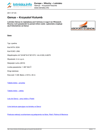 Europa » Włochy » Lotnisko Genua – Krzysztof Kolumb www.lotniska.info 2011-07-23 - Genua – Krzysztof Kolumb Lotnisko Genua to największy port lotniczy w Liguri we Włoszech. Roczny ruch pasażerski to ponad milion osób. Lądowisko znajduje się 9 kilometrów od Genui Dane Typ: cywilne Kod IATA: GOA Kod ICAO: LIMJ Współrzędne 44°24'48″N 8°50'15″E / 44.41333, 8.8375 Wysokość: 4 m n.p.m. Statystyki ruchu (2010) Liczba pasażerów: 1 287 524 ▲ Drogi startowe Kierunek 11/29: Beton, 2 915 x 45 m Tabela lotów – przyloty Tabela lotów – odloty Loty do Genui - ceny lotów z Polski Linie lotnicze operujące na lotnisku w Genui Podczas wakacji uruchamiane są połączenia na Ibize, Rodi i Palma di Mariorca http://www.lotniska.info/lotnisko,genua-krzysztof-kolumb,63.html strona 1 / 4 Europa » Włochy » Lotnisko Genua – Krzysztof Kolumb www.lotniska.info HISTORIA Budowa portu rozpoczęła się w 1954 roku a jego inauguracja w 1962 roku. Na początku pas startowy liczył sobie 2285 metrów, aktualnie długość pasa startowego wynosi 3065 metrów. Terminal początkowo prowizoryczny w 1986 roku został przebudowany. Obszar lotniska znajduje się na sztucznej półwyspie, okres budowy trwał prawie 8 lat. Port lotniczy w Genui służy głównie jako dodatkowy port zapleczowy dla lotnisk na północy Włoch. Gdy często występujące mgły uniemożliwiające lądowanie na lotniskach w Turynie czy też Mediolanie wtedy pojawia się lotnisko w Genui jako lądowisko zastępcze. Lądowanie na lotnisku w Genui, lotnisku położonym na półwyspie (video) DOJAZD Autobus Fima VOLABUS Lotnisko w Genui – Genua Czas podróży to około 30 minut. Cena biletu 6 euro Godziny kursowania: http://www.airport.genova.it/v2/images/pdf/volabus%20s2011.pdf Linia I24 Lotnisko Genua – dworzec główny Genua Cena biletu 2,5 EUR Taxi Cennik: Lotnisko Genua – dworzec Genua (7-8 EUR) http://www.airport.genova.it/file/prezzitaxi.pdf http://www.lotniska.info/lotnisko,genua-krzysztof-kolumb,63.html strona 2 / 4 Europa » Włochy » Lotnisko Genua – Krzysztof Kolumb www.lotniska.info www.solotaxi.it Wynajem samochodów na lotnisku w Genui Auto Europa T. 010.6591536 Sito web: Sbc.it Avis T. 010.6507280 Sito web: Avisautonoleggio.it E-sixt T. 010.6512111 Sito web: E-sixt.it Europcar T. 010.6504881 Sito web: Europcar.it Hertz T. 010.6512422 Sito web: Hertz.it Maggiore T. 010.6512467 Sito web: Maggiore.it TRAVELCAR T. 010 - 6533573 Sito web: travelcar.it STATYSTYKI http://www.lotniska.info/lotnisko,genua-krzysztof-kolumb,63.html strona 3 / 4 Europa » Włochy » Lotnisko Genua – Krzysztof Kolumb www.lotniska.info 2000 1.063.146 2001 1.001.494 5,8% 2002 1.040.442 3,9% 2003 1.057.663 1,7% 2004 1.074.951 1,6% 2005 1.013.288 5,7% 2006 1.080.001 6,5% 2007 1.128.399 4,5% 2008 1.202.168 6,5% 2009 1.136.798 5,4% 2010 1.287.524 13,26% http://www.lotniska.info/lotnisko,genua-krzysztof-kolumb,63.html http://www.lotniska.info/lotnisko,genua-krzysztof-kolumb,63.html Powered by TCPDF (www.tcpdf.org) strona 4 / 4