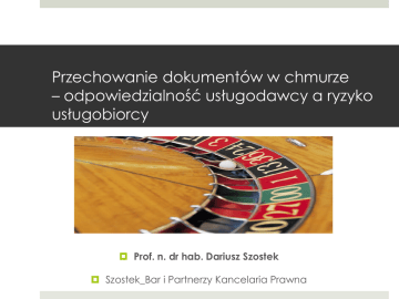 Przechowanie dokumentów w chmurze – odpowiedzialność usługodawcy a ryzyko usługobiorcy  Prof. n. dr hab. Dariusz Szostek  Szostek_Bar i Partnerzy Kancelaria Prawna Czym jest dokument w ujęciu przechowywania w chmurze ?  Dokumentem jest nośnik informacji umożliwiający jej odtworzenie (proj. def. k.c.)  Dokument elektroniczny – każda treść przechowywana w postaci elektronicznej w szczególności tekst lub nagrania dźwiękowe, wizualne lub audiowizualne (eIDAS)  Jednym z elementów dokumentu są dane Wady przechowywania danych w chmurze  Utrata fizycznej kontroli nad nośnikami  Brak wpływu na lokalizację nośników na których zapisane są dane  Ryzyko związane z ograniczeniem przez usługodawcę dostępu do danych (awaria, upadłość, działania podmiotów trzecich)  Ryzyko uzależnienia swojej działalności gospodarczej (dostępu do danych) od podmiotu trzeciego (casus rosyjski)  Problem uzależnienia się od jednego dostawcy     Problem „zwrotu danych” Problem dyslokacji i przeniesienia danych Problem skasowania danych Problem interoperacyjności danych z usługami dostawcy chmury (np. linkowanie treści), w konsekwencji uzależniającymi od jednego dostawcy – np. Facebook Wady przechowywania danych w chmurze  Ryzyko, w przypadku przechowywania danych w Państwie trzecim dotyczącę wymagań prawnych (obniżone bezpieczeństwo) co do transferu danych  Ryzyko zmieniania się ról uczestników procesów w chmurze w zależności od warunków  Podpowierzanie  Nierówna pozycja stron umowy o usługi chmurowe  Problem mapowania i alokacji zasobów (w skrajnych przypadkach ze względu na jeden pomiot/incydent brak dostępu do całej infrastruktury chmury dla innych podmiotów/usługobiorców Jak się zabezpieczyć  Odpowiednio skonstruowana umowa  wybór właściwego prawa w przypadku usługodawcy zagranicznego  Odpowiednie regulaminy, weryfikacja klauzul abuzywnych  Zagwarantowanie w umowie prawa do audytów i weryfikacji bezpieczeństwa (certyfikaty)  Tak konstrukcja kontraktu aby usługodawca odpowiadał na podstawie europejskich norm dotyczących:  Odpowiedzialności kontraktowej  Odpowiedzialności deliktowej  Odpowiedzialności świadczącego usługi drogą elektroniczną Dekalog Umowy  Zagwarantowanie w umowie prawa do informacji o fizycznej lokalizacji serwerów na których są lub mogą być przetwarzane dane  Zmiana lokalizacji powinna być podana z rozsądnym wyprzedzeniem  Prawnie zagwarantowany dostęp do dokumentacji dotyczącej zasad bezpieczeństwa oraz środków technicznych przyjmowanych w poszczególnych centrach przetwarzania danych  Jest to tajemnica przedsiębiorstwa  Pełna informacja dotycząca podwykonawców i instytucji uczestniczących w realizacji usługi chmury Dekalog Umowy  Zagwarantowanie w umowie, iż każdy z podwykonawców i instytucji będzie związany takimi samymi klauzulami umownymi jak dostarczyciel usług chmury  Podwykonawcy powinni działać wyłącznie zgodnie z instrukcjami usługodawcy  Usługobiorca powinien pozostawać wyłącznym administratorem danych przekazanych do chmury  Niektóre usługi dodane np. synchronizacja kalendarza i kontaktów powodują, iż usługodawca zostaje także administratorem przetworzonych danych  Usługodawca nie powinien mieć prawa do decydowania o celach i sposobach przetwarzania danych Dekalog Umowy  Zagwarantowanie informacji o zobowiązaniach usługodawcy względem organów państwa: policji, prokuratury, służb specjalnych, organów ścigania  Por ECPA Electronic Communications Privacy ACT  Dostęp służb USA do danych innych podmiotów niż obywatele amerykańscy (The Patriot Act)  Informowanie usługobiorcy o wszelkich wnioskach dotyczących udostępnienia danych, a także o samym udostępnieniu Dekalog Umowy  Dokładne ustalenie w umowie zasad przeszukiwania, retencji i usuwania danych dostarczanych przez usługodawcę  Zagwarantowanie w umowie raportowania usługobiorcy o wszelkich incydentach bezpieczeństwa danych. Pomoc przy zwalczaniu skutków takich incydentów  Dokładne określenie w umowie zasad wyłączenia lub ograniczenia odpowiedzialności dostarczyciela usługi przy jej realizacji  Minimalizacja niebezpieczeństwa „przywiązania” do pojedynczego dostarczyciela usług  Zapewnienie interoperacyjności i przenaszalności danych Umowa o usługi chmury z konsumentem Czyli niebezpieczeństw część dalsza…… i to tylko pod warunkiem wyboru polskiego prawa….. Związanie wzorcem umownym, regulaminem  Art. 384 k.c. Ustalony przez jedną ze stron wzorzec umowy, w szczególności ogólne warunki umów, wzór umowy, regulamin, wiąże drugą stronę jeżeli został jej doręczony przed zawarciem umowy  §2 w razie gdy posługiwanie się wzorcem w stosunkach danego rodzaju jest zwyczajowo przyjęte wiąże on także gdy strona mogła z łatwością się dowiedzieć o jego treści  Nie dotyczy to umów z konsumentami , z wyjątkiem umów drobnych, w bieżących sprawach życia codziennego Związanie wzorcem umownym, regulaminem  . 3851. 142) § 1. Postanowienia umowy zawieranej z konsumentem nieuzgodnione indywidualnie nie wiążą go,  jeżeli kształtują jego prawa i obowiązki w sposób sprzeczny z dobrymi obyczajami, rażąco naruszając jego interesy (niedozwolone postanowienia umowne).  Nie dotyczy to postanowień określających główne świadczenia stron, w tym cenę lub wynagrodzenie, jeżeli zostały sformułowane w sposób jednoznaczny. Związanie wzorcem umownym, regulaminem  Art.. 3851. § 3. Nieuzgodnione indywidualnie są te postanowienia umowy, na których treść konsument nie miał rzeczywistego wpływu.  W szczególności odnosi się to do postanowień umowy przejętych z wzorca umowy zaproponowanego konsumentowi przez kontrahenta.  § 4. Ciężar dowodu, że postanowienie zostało uzgodnione indywidualnie, spoczywa na tym, kto się na to powołuje. Klauzule abuzywne  Art. 3853. W razie wątpliwości uważa się, że niedozwolonymi postanowieniami u