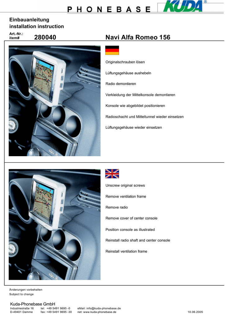 Einbauanleitung installation instruction Art.-Nr.: item# 280040 Navi Alfa Romeo 156 Originalschrauben lösen Lüftungsgehäuse aushebeln Radio demontieren Verkleidung der Mittelkonsole demontieren Konsole wie abgebildet positionieren Radioschacht und Mitteltunnel wieder einsetzen Lüftungsgehäuse wieder einsetzen Unscrew original screws Remove ventilation frame Remove radio Remove cover of center console Position console as illustrated Reinstall radio shaft and center console Reinstall ventilation frame Änderungen vorbehalten Subject to change Kuda-Phonebase GmbH Industriestraße 16 D-49401 Damme tel: +49 5491 9695 -0 fax: +49 5491 9695 -30 eMail: [email protected] net: www.kuda-phonebase.de 10.06.2005 Instructions d´ installation instrucciones de instalación art: 280040 Navi Alfa Romeo 156 Desserrez les vis originales Tirez la grille de buse d´aération Démontez l’autoradio Démontez la couverture de la console centrale du véhicule Positionnez la console comme illustré Posez de nouveau le puits de la radio et le tunnel central du véhicule Montez de nouveau le grille de buse d´aération Suelte los tornillos originales Desmonte la carcasa de ventilación Desmonte la radio Desmonte el revestimiento de la consola central Posicione la consola como mostrado Reinstale el pozo de la radio y la consola central Reinstale la carcasa de ventilación Nous nous réservons la possibilité de modification Salvo posibles modificaciones Kuda-Phonebase GmbH Industriestraße 16 D-49401 Damme tel: +49 5491 9695 -0 fax: +49 5491 9695 -30 eMail: [email protected] net: www.kuda-phonebase.de 10.06.2005 installatie instructie instrukcja montazu . art: 280040 Navi Alfa Romeo 156 Originele schroefen losdraaien Luchtroosterhuis uitnemen Radio demonteren Bekleding van middenconsole demonteren Konsole zoals afgebeeld positioneren Radioschacht en middentunnel weer bevestigen Luchtroosterhuis weer monteren Poluzowac oryginalna srubes Wywazyc ramke wylotów powietrza Zdemontowac radio Tapicerke srodkowej konsoli zdemontuj Uchwyt umiescic jak na przedstawionym zdjeciu. Zamontowac ponownie ramke wokól radia oraz tunel srodkowy Ponownie osadzic ramke wylotów powietrza Nous nous réservons la possibilité de modification Salvo posibles modificaciones Kuda-Phonebase GmbH Industriestraße 16 D-49401 Damme tel: +49 5491 9695 -0 fax: +49 5491 9695 -30 eMail: [email protected] net: www.kuda-phonebase.de 10.06.2005