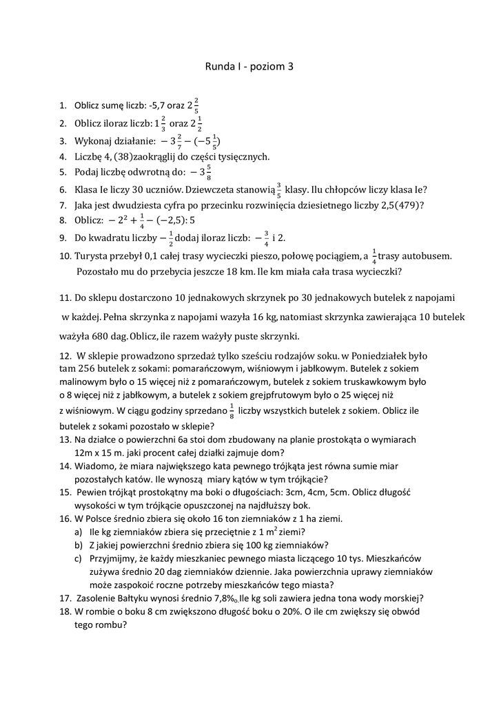 Runda I - poziom 3 1. Oblicz sumę liczb: -5,7 oraz 2 2. Oblicz iloraz liczb: 1 oraz 2 3. Wykonaj działanie: − 3 − (−5 ) 4. Liczbę 4, (38)zaokrąglij do części tysięcznych. 5. Podaj liczbę odwrotną do: − 3 6. Klasa Ie liczy 30 uczniów. Dziewczeta stanowią klasy. Ilu chłopców liczy klasa Ie? 7. Jaka jest dwudziesta cyfra po przecinku rozwinięcia dziesietnego liczby 2,5(479)? 8. Oblicz: − 2 + − (−2,5): 5 9. Do kwadratu liczby − dodaj iloraz liczb: − i 2. 10. Turysta przebył 0,1 całej trasy wycieczki pieszo, połowę pociągiem, a trasy autobusem. Pozostało mu do przebycia jeszcze 18 km. Ile km miała cała trasa wycieczki? 11. Do sklepu dostarczono 10 jednakowych skrzynek po 30 jednakowych butelek z napojami w każdej. Pełna skrzynka z napojami wazyła 16 kg, natomiast skrzynka zawierająca 10 butelek ważyła 680 dag. Oblicz, ile razem ważyły puste skrzynki. 12. W sklepie prowadzono sprzedaż tylko sześciu rodzajów soku. w Poniedziałek było tam 256 butelek z sokami: pomarańczowym, wiśniowym i jabłkowym. Butelek z sokiem malinowym było o 15 więcej niż z pomarańczowym, butelek z sokiem truskawkowym było o 8 więcej niż z jabłkowym, a butelek z sokiem grejpfrutowym było o 25 więcej niż z wiśniowym. W ciągu godziny sprzedano liczby wszystkich butelek z sokiem. Oblicz ile butelek z sokami pozostało w sklepie? 13. Na działce o powierzchni 6a stoi dom zbudowany na planie prostokąta o wymiarach 12m x 15 m. jaki procent całej działki zajmuje dom? 14. Wiadomo, że miara największego kata pewnego trójkąta jest równa sumie miar pozostałych katów. Ile wynoszą miary kątów w tym trójkącie? 15. Pewien trójkąt prostokątny ma boki o długościach: 3cm, 4cm, 5cm. Oblicz długość wysokości w tym trójkącie opuszczonej na najdłuższy bok. 16. W Polsce średnio zbiera się około 16 ton ziemniaków z 1 ha ziemi. a) Ile kg ziemniaków zbiera się przeciętnie z 1 m2 ziemi? b) Z jakiej powierzchni średnio zbiera się 100 kg ziemniaków? c) Przyjmijmy, że każdy mieszkaniec pewnego miasta liczącego 10 tys. Mieszkańców zużywa średnio 20 dag ziemniaków dziennie. Jaka powierzchnia uprawy ziemniaków może zaspokoić roczne potrzeby mieszkańców tego miasta? 17. Zasolenie Bałtyku wynosi średnio 7,8%o.Ile kg soli zawiera jedna tona wody morskiej? 18. W rombie o boku 8 cm zwiększono długość boku o 20%. O ile cm zwiększy się obwód tego rombu? 19. Po obniżce o 5% cena 1m2 paneli wynosiła 57 zł. Ile złotych zaoszczędził pan Jan przy zakupie 45 m2 paneli? 20. Rowerzysta przejechał 48 km i ma jeszcze do przejechania 1/3 trasy. Jaka długa jest cała trasa? 21. Źródło wody o wydajności 80 litrów na minutę zasila dwie fontanny, z których jedna pobiera 4 razy więcej wody niż druga. Ile wody w ciągu minuty pobiera ta, która pobiera jej więcej? 22. Wiadomo, że świeże grzyby zawierają ok. 90% wody, a w trakcie suszenia tracą prawie 80% posiadanej wody. Krzyś zebrał 10 kg grzybów. Oblicz, ile kg grzybów zostanie po wysuszeniu. 23. W zakładzie na jednej zmianiewyprodukowano537 kg cukierków, które następnie pakowano bezpośrednio do kartonów po 6,5 kg. Po zapakowaniu każdych 10 kartonów kontroler zabierał z taśmy produkcyjnej3 kg cukierków do laboratorium. Ile co najmniej kartonów było potrzebnych do zapakowania cukierków? 24. W pudełku jest 12 guzików żółtych i 25 czerwonych. Ile należy wyjąć guzików czerwonych, aby guziki żółte stanowiły 60% wszystkich guzików w pudełku. 25. Boisko do siatkówki ma długość 18m i szerokość 9m. a) Ile sekund potrzebuje siatkarz, aby po obwodzie obiec boisko, jeśli jego prędkość wynosi 6m/s. b) Ile minut potrzebuje pracownik, aby umyć powierzchnię boiska, jeśli używając mopa, w ciągu minuty myje 15m2 powierzchni? 26. Ułamek 10/37 zapisz w postaci ułamka okresowego. Oblicz sumę stu początkowych cyfr po przecinku tego ułamka. 27. W trzech meczach koszykarz zdobywał średnio 12 punktów. W czwartym zdobył 20 punktów powiększając swoją średnią. Ile wynosiła ta średnia po czterech meczach? 28. Pan Kowalski potrzebuje 12 minut, aby obejść kwadratowy plac dookoła. Ile minut zajmie mu obejście w tym samym tempie placu o czterokrotnie większej powierzchni? 29. Na ułożenie podłogi w łazience potrzeba 620 płytek o wymiarach 30cmx 40 cm. Z Ilu płytek o wymiarach 20cmx30cm można ułożyć tę podłogę . 30. Obwód rombu wynosi 16,8 cm a jego wysokość jest o 1,2cm krótsza od boku. Oblicz pole tego rombu.
