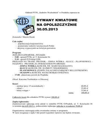 Oddział PTTK „Sudetów Wschodnich” w Prudniku zaprasza na DYWANY KWIATOWE NA OPOLSZCZYŹNIE 30.05.2013 Komandor: Marcin Husak Cele rajdu: - popularyzacja krajoznawstwa - poznawanie walorów turystycznych Polski - aktywny wypoczynek na świeżym powietrzu Program: 30.05.2013 CZWARTEK - WYJAZD: - 5:00 - sprzed PTTK, ul. T. Kościuszki 56 - 5:10 - sprzed ZUS/sklep LIDL PRZEJAZD NA TRASIE: PRUDNIK - ZIMNA WÓDKA - KLUCZ - PŁAWNIOWICE OLSZOWA - PRUDNIK ZE ZWIEDZANIEM PO DRODZE: - ZIMNA WÓDKA (KOŚCIÓŁ ŚW. MARII MAGDALENY) - KLUCZ (KOŚCIÓŁ ŚW. ELŻBIETY WĘGIERSKIEJ) - PŁAWNIOWICE (ZESPÓŁ PAŁACOWO-PARKOWY BELLESTREMÓW) - OLSZOWA (KOŚCIÓŁ MATKI BOSKIEJ ŚNIEŻNEJ) - 17:00 - planowany powrót do Prudnika Obiad: Karczma Tiszbierków w Olszowej Koszt: - autokar (przy 15 uczestnikach) = - obiad = - bilety wstępu = suma: 60,00 zł 25,00 zł 15,00 zł 100,00 zł Całkowity koszt dla członków PTTK wynosi 100,00 zł. Zapisy/zgłoszenia: Zainteresowani zgłaszają swój udział w siedzibie PTTK O/Prudnik, ul. T. Kościuszki 56 w terminie do 6.05.2013 r., jednocześnie wpłacając zaliczkę w wysokości 70,00 zł. Organizatorzy zastrzegają sobie ewentualne zmiany w programie. W razie rezygnacji z rajdu 5 dni przed wyjazdem wpisowe nie będzie zwracane.